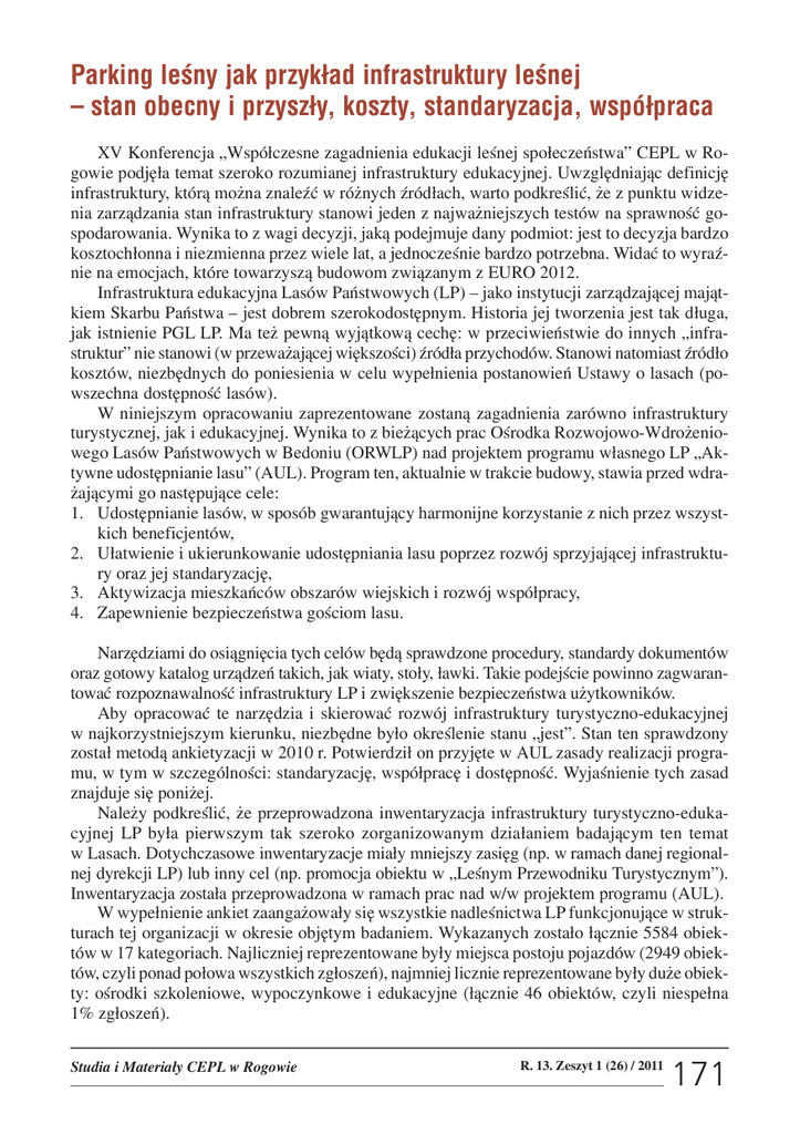 Parking leœny jak przyk³ad infrastruktury leœnej – stan obecny i przysz³y, koszty, standaryzacja, wspó³praca XV Konferencja „Wspó³czesne zagadnienia edukacji leœnej spo³eczeñstwa” CEPL w Rogowie podjê³a temat szeroko rozumianej infrastruktury edukacyjnej. Uwzglêdniaj¹c definicjê infrastruktury, któr¹ mo¿na znaleŸæ w ró¿nych Ÿród³ach, warto podkreœliæ, ¿e z punktu widzenia zarz¹dzania stan infrastruktury stanowi jeden z najwa¿niejszych testów na sprawnoœæ gospodarowania. Wynika to z wagi decyzji, jak¹ podejmuje dany podmiot: jest to decyzja bardzo kosztoch³onna i niezmienna przez wiele lat, a jednoczeœnie bardzo potrzebna. Widaæ to wyraŸnie na emocjach, które towarzysz¹ budowom zwi¹zanym z EURO 2012. Infrastruktura edukacyjna Lasów Pañstwowych (LP) – jako instytucji zarz¹dzaj¹cej maj¹tkiem Skarbu Pañstwa – jest dobrem szerokodostêpnym. Historia jej tworzenia jest tak d³uga, jak istnienie PGL LP. Ma te¿ pewn¹ wyj¹tkow¹ cechê: w przeciwieñstwie do innych „infrastruktur” nie stanowi (w przewa¿aj¹cej wiêkszoœci) Ÿród³a przychodów. Stanowi natomiast Ÿród³o kosztów, niezbêdnych do poniesienia w celu wype³nienia postanowieñ Ustawy o lasach (powszechna dostêpnoœæ lasów). W niniejszym opracowaniu zaprezentowane zostan¹ zagadnienia zarówno infrastruktury turystycznej, jak i edukacyjnej. Wynika to z bie¿¹cych prac Oœrodka Rozwojowo-Wdro¿eniowego Lasów Pañstwowych w Bedoniu (ORWLP) nad projektem programu w³asnego LP „Aktywne udostêpnianie lasu” (AUL). Program ten, aktualnie w trakcie budowy, stawia przed wdra¿aj¹cymi go nastêpuj¹ce cele: 1. Udostêpnianie lasów, w sposób gwarantuj¹cy harmonijne korzystanie z nich przez wszystkich beneficjentów, 2. U³atwienie i ukierunkowanie udostêpniania lasu poprzez rozwój sprzyjaj¹cej infrastruktury oraz jej standaryzacjê, 3. Aktywizacja mieszkañców obszarów wiejskich i rozwój wspó³pracy, 4. Zapewnienie bezpieczeñstwa goœciom lasu. Narzêdziami do osi¹gniêcia tych celów bêd¹ sprawdzone procedury, standardy dokumentów oraz gotowy katalog urz¹dzeñ takich, jak wiaty, sto³y, ³awki. Takie podejœcie powinno zagwarantowaæ rozpoznawalnoœæ infrastruktury LP i zwiêkszenie bezpieczeñstwa u¿ytkowników. Aby opracowaæ te narzêdzia i skierowaæ rozwój infrastruktury turystyczno-edukacyjnej w najkorzystniejszym kierunku, niezbêdne by³o okreœlenie stanu „jest”. Stan ten sprawdzony zosta³ metod¹ ankietyzacji w 2010 r. Potwierdzi³ on przyjête w AUL zasady realizacji programu, w tym w szczególnoœci: standaryzacjê, wspó³pracê i dostêpnoœæ. Wyjaœnienie tych zasad znajduje siê poni¿ej. Nale¿y podkreœliæ, ¿e przeprowadzona inwentaryzacja infrastruktury turystyczno-edukacyjnej LP by³a pierwszym tak szeroko zorganizowanym dzia³aniem badaj¹cym ten temat w Lasach. Dotychczasowe inwentaryzacje mia³y mniejszy zasiêg (np. w ramach danej regionalnej dyrekcji LP) lub inny cel (np. promocja obiektu w „Leœnym Przewodniku Turystycznym”). Inwentaryzacja zosta³a przeprowadzona w ramach prac nad w/w projektem programu (AUL). W wype³nienie ankiet zaanga¿owa³y siê wszystkie nadleœnictwa LP funkcjonuj¹ce w strukturach tej organizacji w okresie objêtym badaniem. Wykazanych zosta³o ³¹cznie 5584 obiektów w 17 kategoriach. Najliczniej reprezentowane by³y miejsca postoju pojazdów (2949 obiektów, czyli ponad po³owa wszystkich zg³oszeñ), najmniej licznie reprezentowane by³y du¿e obiekty: oœrodki szkoleniowe, wypoczynkowe i edukacyjne (³¹cznie 46 obiektów, czyli niespe³na 1% zg³oszeñ). Studia i Materia³y CEPL w Rogowie R. 13. Zeszyt 1 (26) / 2011 171 Szczególnej analizie zosta³o poddane utrzymanie obiektu. Z danych nt. podmiotu dbaj¹cego o utrzymanie czystoœci i naprawy obiektu wynika, ¿e prace te wykonywane s¹ g³ównie przez podmioty zewnêtrzne (Zak³ady Us³ug Leœnych) oraz przez pracowników nadleœnictw. Oba rozwi¹zania finansowo obci¹¿aj¹ LP. Koszty te s¹ sta³ym elementem planów finansoworzeczowych nadleœnictw. Jak zaznaczono wczeœniej powinny byæ one objête szczególn¹ uwag¹ inwestora. Ich wagê obrazuje nastêpuj¹ca proporcja: koszty posadowienia miejsca postoju pojazdów (do 10 miejsc postojowych, bez prac gruntowych) to ok. 25 000-30 000 z³ (Ÿród³o: konsultacje terenowe), a roczne koszty utrzymania (wywóz œmieci z nielegalnych wysypisk, naprawa zdewastowanego wyposa¿enia, zwyk³e prace porz¹dkowe i konserwatorskie) to ok. 10 000 z³ rocznie (Ÿród³o: konsultacje terenowe). Aby sprostaæ takiemu wyzwaniu, w projekt programu zosta³a w³¹czona m.in. zasada wspó³pracy. Nie nale¿y kojarzyæ jej tylko ze wspó³finansowaniem prac porz¹dkowych przez organizacje pozarz¹dowe, samorz¹dy, firmy czy osoby prywatne. Chodzi tu przede wszystkim o aktywne zaanga¿owanie przedstawicieli w/w grup we wspólne tworzenie i utrzymanie tak rozproszonych w terenie i powszechnie dostêpnych obiektów. Wa¿n¹ cech¹ infrastruktury jest równie¿ oznaczenie jej w³aœciciela. Element identyfikacji zawarty jest w projektach koncepcyjnych urz¹dzeñ opracowanych w ramach AUL równie¿ w 2010. Dzia³anie to wype³nia kolejn¹ zasadê AUL – zasadê standaryzacji. Aktualnie trwa przegl¹d kolejnych standardów po to, aby pogodziæ elementy identyfikacji wizualnej (rozpoznawalnoœæ) z optymalnymi kosztami ich zakupu i minimalnymi kosztami utrzymania we w³aœciwym stanie (procedura utrzymania czystoœci, napraw, konserwacji itp.). Ze wstêpnych analiz wynika, ¿e: 1. Bardziej odporny na zniszczenie standard (np. z elementami metalowymi) jest kilkukrotnie dro¿sz¹ inwestycj¹; 2. Mniej odporny na zniszczenie standard, jest oczywiœcie tañszy, ale wymaga wiêkszego nak³adu prac zwi¹zanych z utrzymaniem w³aœciwej jakoœci obiektu; 3. Standard z elementami metalowymi wymaga mniejszych nak³adów prac zwi¹zanych z utrzymaniem, jest natomiast czêœciej kradziony; 4. LP mog¹ wykorzyst