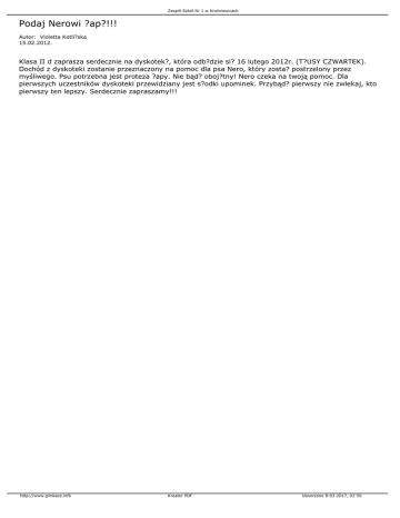 Zespół Szkół Nr 1 w Krośniewicach Podaj Nerowi ?ap?!!! Autor: Violetta Kotli?ska 15.02.2012. Klasa II d zaprasza serdecznie na dyskotek?, która odb?dzie si? 16 lutego 2012r. (T?USY CZWARTEK). Dochód z dyskoteki zostanie przeznaczony na pomoc dla psa Nero, który zosta? postrzelony przez myśliwego. Psu potrzebna jest proteza ?apy. Nie bąd? oboj?tny! Nero czeka na twoją pomoc. Dla pierwszych uczestników dyskoteki przewidziany jest s?odki upominek. Przybąd? pierwszy nie zwlekaj, kto pierwszy ten lepszy. Serdecznie zapraszamy!!! http://www.gimkace.info Kreator PDF Utworzono 8-03-2017, 02:56