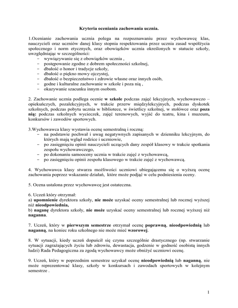 Kryteria oceniania zachowania ucznia. 1.Ocenianie zachowania ucznia polega na rozpoznawaniu przez wychowawcę klas, nauczycieli oraz uczniów danej klasy stopnia respektowania przez ucznia zasad współŜycia społecznego i norm etycznych, oraz obowiązków ucznia określonych w statucie szkoły, uwzględniając w szczególności: - wywiązywanie się z obowiązków ucznia , - postępowanie zgodne z dobrem społeczności szkolnej, - dbałość o honor i tradycje szkoły, - dbałość o piękno mowy ojczystej, - dbałość o bezpieczeństwo i zdrowie własne oraz innych osób, - godne i kulturalne zachowanie w szkole i poza nią , - okazywanie szacunku innym osobom. 2. Zachowanie ucznia podlega ocenie w szkole podczas zajęć lekcyjnych, wychowawczo – opiekuńczych, pozalekcyjnych, w trakcie przerw międzylekcyjnych, podczas dyskotek szkolnych, podczas pobytu ucznia w bibliotece, w świetlicy szkolnej, w stołówce oraz poza nią: podczas szkolnych wycieczek, zajęć terenowych, wyjść do teatru, kina i muzeum, konkursów i zawodów sportowych. 3.Wychowawca klasy wystawia ocenę semestralną i roczną: - na podstawie pochwał i uwag negatywnych zapisanych w dzienniku lekcyjnym, do których mają wgląd rodzice i uczniowie, - po zasięgnięciu opinii nauczycieli uczących dany zespół klasowy w trakcie spotkania zespołu wychowawczego, - po dokonaniu samooceny ucznia w trakcie zajęć z wychowawcą, - po zasięgnięciu opinii zespołu klasowego w trakcie zajęć z wychowawcą. 4. Wychowawca klasy stwarza moŜliwości uczniowi ubiegającemu się o wyŜszą ocenę zachowania poprzez wskazanie działań, które moŜe podjąć w celu podniesienia oceny. 5. Ocena ustalona przez wychowawcę jest ostateczna. 6. Uczeń który otrzymał: a) upomnienie dyrektora szkoły, nie moŜe uzyskać oceny semestralnej lub rocznej wyŜszej niŜ nieodpowiednia, b) naganę dyrektora szkoły, nie moŜe uzyskać oceny semestralnej lub rocznej wyŜszej niŜ naganna. 7. Uczeń, który w pierwszym semestrze otrzymał ocenę poprawną, nieodpowiednią lub naganną, na koniec roku szkolnego nie moŜe mieć wzorowej. 8. W sytuacji, kiedy uczeń dopuścił się czynu szczególnie drastycznego (np. stwarzanie sytuacji zagraŜających Ŝyciu lub zdrowiu, dewastacja, godzenie w godność osobistą innych ludzi) Rada Pedagogiczna za zgodą wychowawcy moŜe obniŜyć uczniowi ocenę. 9. Uczeń, który w poprzednim semestrze uzyskał ocenę nieodpowiednią lub naganną, nie moŜe reprezentować klasy, szkoły w konkursach i zawodach sportowych w kolejnym semestrze . 1 10. Ustala się następujące kryteria ocen zachowania: Ocenę wzorową otrzymuje uczeń, który: 1. W sposób wyróŜniający wywiązuje się z obowiązków szkolnych i w stosunku do swoich moŜliwości osiąga maksymalnie wysokie wyniki w nauce. 2. Rozwija swoje zainteresowania, pracując w kołach przedmiotowych, uczestnicząc w konkursach przedmiotowych , zawodach sportowych . 3. Bierze udział w pracach na rzecz szkoły. 4. Jest uczciwy, prawdomówny, tolerancyjny. 5. Szanuje własność osobistą i mienie szkoły. 6. Zawsze dba o ład i porządek w miejscu swojej nauki. 7. UŜywa pięknego języka ojczystego, stosuje zwroty grzecznościowe wobec dorosłych i rówieśników. 8. Szanuje symbole narodowe i zachowuje godną postawę podczas uroczystości szkolnych i państwowych, chętnie kultywuje tradycje szkoły. 9. Przestrzega zasad i norm funkcjonowania w grupie, umie przyznać się do błędu i przeprosić . 10. Jest koleŜeński, podejmuje inicjatywy pomocy słabszym i młodszym. 11. Przestrzega zasad higieny osobistej , ubiera się stosownie do sytuacji i miejsca. 12. Dba o swoje zdrowie, nie ulega nałogom. 13. Ma usprawiedliwione wszystkie nieobecności, nie spóźnia się na zajęcia. 14. Otrzymuje pochwały za swoje zachowanie. 15. Nie posiada Ŝadnych uwag negatywnych. Ocenę bardzo dobrą otrzymuje uczeń, który: 1. Uczy się maksymalnie na swoje moŜliwości oraz systematycznie i wytrwale pracuje na doskonalenie swojej wiedzy, wykonuje powierzone mu prace i zadania, czasami podejmuje dobrowolne zobowiązania, które stara się wykonać terminowo i solidnie. 2. Rozwija swoje zainteresowania podczas zajęć pozalekcyjnych. 3. Często uczestniczy w pracach na rzecz szkoły. 4. Jest uczciwy, prawdomówny i tolerancyjny. 5. Szanuje własność osobistą i mienie szkoły. 6. Dba o ład i porządek w miejscu swojej nauki. 7. Jest kulturalny w stosunku do nauczycieli, kolegów i pracowników szkoły, nie uŜywa wulgarnych słów. 8. Zachowuje się godnie podczas uroczystości szkolnych i państwowych. 9. Umie przyznać się do popełnionych błędów i potrafi przeprosić. 10. SłuŜy pomocą koleŜeńską. 11. Dba o swój wygląd zewnętrzny, który jest zgodny z wymogami w Regulaminie Ucznia. 12. Dba o własne zdrowie, nie ulega nałogom . 13. Ma usprawiedliwione wszystkie nieobecności i spóźnienia. 14. Otrzymuje pochwały za swoje zachowanie. 15. Czasami otrzymuje ustne upomnienia dyscyplinujące. 2 Ocenę dobrą otrzymuje uczeń, który: 1. Stara się uczyć na miarę swoich moŜliwości, zwykle jest przygotowany do zajęć lekcyjnych. 2. Czasami uczestniczy w zajęciach pozalekcyjnych. 3. Czasami bierze udział w pracach społeczno–uŜytecznych, akcjach charytatywnych, dekorowaniu szkoły i klasy. 4. Jest uczciwy, prawdomówny i tolerancyjny. 5. Szanuje własność osobistą i mienie szkoły. 6. PrzewaŜnie dba o ład i porządek w miejscu swojej nauki. 7. UŜywa poprawnej polszczyzny, stosuje zwroty grzecznościowe . 8. Zachowuje się godnie podczas uroczystości szkolnych i państwowych. 9. Umie przyznać się do błędu i przeprosić. 10. Jest koleŜeński, czasami pomaga młodszym i słabszym. 11. Często przestrzega zasad higieny i właściwego ubioru . 12. Dba o własne zdrowie, nie ulega nałogom. 13. Nie ma nieusprawiedliwionych nieobecności, czasami spóźnia się (łącznie do 6 spóźnień) 14. Jest zdyscyplinowany, nie sprawia