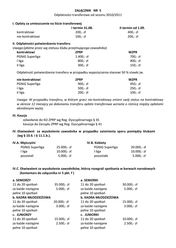 ZAŁĄCZNIK NR 5 Odpłatności transferowe od sezonu 2010/2011 I. Opłaty za umieszczenie na liście transferowej I termin 31.08. kontraktowi 200,- zł nie-kontraktowi 100,- zł II. Odpłatności potwierdzenia transferu Uwaga:(płatne przez wg statusu klubu przejmującego zawodnika) kontraktowi ZPRP PGNiG Superliga 1.400,- zł I liga 800,- zł II liga 300,- zł II termin od 1.09. 400,- zł 200,- zł WZPR 700,- zł 400,- zł 150,- zł Odpłatnośd potwierdzenia transferu w przypadku wypożyczenia stanowi 50 % stawki jw. nie-kontraktowi PGNiG Superliga I liga II liga ZPRP 900,- zł 500,- zł 200,- zł WZPR 450,- zł 250,- zł 100,- zł Uwaga: W przypadku transferu, w którym gracz nie-kontraktowy zmieni swój status na kontraktowy w okresie 12 miesięcy po dokonaniu transferu opłata transferowa wzrasta o różnicę między opłatami określonymi wyżej. III. Kaucja odwołanie do KO ZPRP wg Reg. Dyscyplinarnego § 35 kasacja do Zarządu ZPRP wg Reg. Dyscyplinarnego § 41 IV. Ekwiwalent za wyszkolenie zawodnika w przypadku zaistnienia sporu pomiędzy klubami (wg § 10.6. i § 11.1.b.). IV.A. Mężczyźni PGNiG Superliga I liga pozostali 25.000,- zł 10.000,- zł 5.000,- zł IV.B. Kobiety PGNiG Superliga I liga pozostałe 20.000,- zł 10.000,- zł 5.000,- zł IV.C. Ekwiwalent za wyszkolenie zawodników, którzy rozegrali spotkania w barwach narodowych (komentarz do załącznika nr 5 pkt. f ) a. SENIORZY 11 do 20 spotkao 35.000,- zł za każde następne 5.000,- zł pełne 10 spotkao b. KADRA MŁODZIEŻOWA 11 do 20 spotkao 20.000,- zł za każde następne 3.000,- zł pełne 10 spotkao c. JUNIORZY 11 do 20 spotkao 15.000,- zł za każde następne 2.500,- zł pełne 10 spotkao a. SENIORKI 11 do 20 spotkao za każde następne pełne 10 spotkao b. KADRA MŁODZIEŻOWA 11 do 20 spotkao za każde następne pełne 10 spotkao c. JUNIORKI 11 do 20 spotkao za każde następne pełne 10 spotkao 30.000,- zł 5.000,- zł 15.000,- zł 3.000,- zł 10.000,- zł 2.500,- zł IV.D. Ponadto stosuje się przelicznik uwzględniający wiek zawodnika od 21 do 23 lat - 1,3 Przelicznik stosowany jest dla wszystkich odpłatności, w odniesieniu do roku kalendarzowego. IV.E. Ekwiwalent za wyszkolenie zawodnika w przypadku transferu międzynarodowego zgodnie z §16 Regulaminu ZBK: 1. Ekwiwalent za szkolenie wynosi maksymalnie 2.500 € za każdy sezon, w którym zawodnik posiadał kontrakt dla wieku od 16 do 23 lat. Ekwiwalent wpłacany jest do klubu macierzystego zawodnika. 2. Dodatkowo ekwiwalent za szkolenie zawodnika reprezentacji narodowych wynosi maksymalnie 500 € za każdy sezon począwszy od sezonu, w którym zawodnik po raz pierwszy wystąpił w oficjalnym meczu w reprezentacji narodowej dowolnej kategorii wiekowej dla wieku od 16 do 23 lat. Ekwiwalent wpłacany jest do macierzystej federacji narodowej zawodnika. V. Przy akceptacji zawodnika zagranicznego dla rozgrywek ligi przyjmuje się opłatę zryczałtowaną na rzecz ZPRP: kontraktowy - 5.000,- zł nie-kontraktowy 3.000,- zł VI. Przy akceptacji dla rozgrywek ligi zawodnika polskiego powracającego z zagranicy przyjmuje się opłatę na rzecz ZPRP wg zapisu pkt II Uwaga: Nie stosuje się odpłatności na rzecz ZPRP i WZPR w przypadku umowy wieloletniej o współpracy podpisanej pomiędzy klubami, a dotyczącej zmian barw klubowych z zespołów szkolących juniorki i juniorów do klubów do grup seniorów pod warunkiem, że umowa jest akceptowana przez WZPR i trwa przynajmniej jeden rok. Powyższe ma zastosowanie tylko wówczas, jeżeli umowa transferowa pomiędzy klubami jest bez skutków finansowych oraz dotyczy klubów tego samego województwa. Nie stosuje się odpłatności na rzecz ZPRP i WZPR w przypadku transferu zawodnika niekontraktowego, który nie ukooczył 18 lat. Komentarz do załącznika nr 5: a/ Przyjmuje się, że sezon rozgrywkowy zaczyna się co roku w dacie 1 lipca, a kooczy się w dacie 30 czerwca następnego roku. Cyklem rozgrywek jest okres sezonu, w którym przeprowadza się wszystkie zawody mistrzowskie w jednej klasie rozgrywek od momentu ich rozpoczęcia aż do ich zakooczenia. b/ Jeżeli klub spadł z ligi to po zakooczeniu rozgrywek zawodnicy są traktowani jako zawodnicy ligi wyższej do dnia 15 grudnia następnego cyklu rozgrywek. c/ Jeżeli klub awansował do wyższej ligi, to po zakooczeniu rozgrywek zawodnicy są traktowani jako zawodnicy ligi niższej do dnia 15 grudnia następnego cyklu rozgrywek. d/ Zawodnik powracający z wypożyczenia jest traktowany jako zawodnik klasy zespołu, który reprezentował w ostatnim cyklu rozgrywek. e/ Ilośd oficjalnych spotkao rozegranych w reprezentacjach narodowych liczy się oddzielnie dla każdej kategorii. f/ Ilośd spotkao rozegranych w reprezentacjach narodowych liczy się przez okres poprzednich trzech sezonów dodając ewentualne spotkania do daty wystawienia Świadectwa Transferu. g/ Zawodnik, który ukooczy wiek juniora w klubie macierzystym jest traktowany jako junior do kooca roku, w którym ukooczył 20 lat. h/ Przy obliczaniu należności transferowych nie można komasowad różnych odpłatności, a tylko jedną do wyliczeo przyjmuje się wariant, kiedy odpłatnośd jest najwyższa / np. nie można komasowad odpłatności na I ligę i odpłatności za grę w barwach narodowych / i/ Dla zawodników zagranicznych potwierdzonych do klubów polskich, będących w posiadaniu Certyfikatów Transferu Międzynarodowego definitywnego - dla transferu krajowego stosowane są przepisy jak dla zawodników krajowych. j/ Zawodnikiem nie kontraktowym jest taki zawodnik, który nie posiadał kontraktu z klubem macierzystym w ostatnim sezonie i nie zamierza zmieniad swego statusu po dokonaniu transferu.
