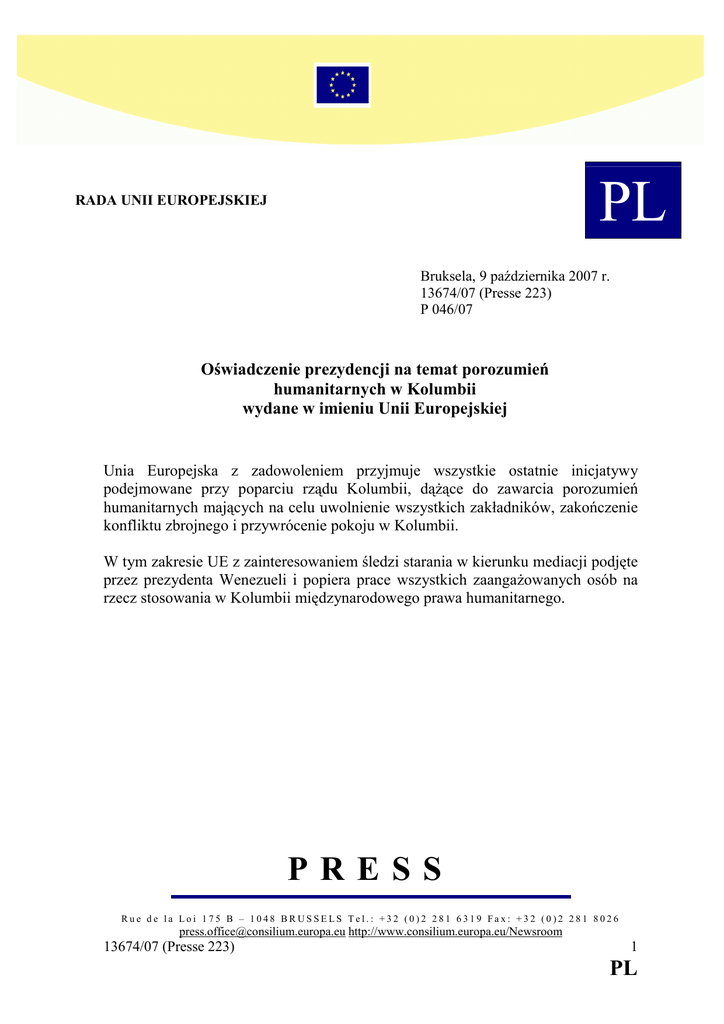 PL RADA UNII EUROPEJSKIEJ Bruksela, 9 października 2007 r. 13674/07 (Presse 223) P 046/07 Oświadczenie prezydencji na temat porozumień humanitarnych w Kolumbii wydane w imieniu Unii Europejskiej Unia Europejska z zadowoleniem przyjmuje wszystkie ostatnie inicjatywy podejmowane przy poparciu rządu Kolumbii, dąŜące do zawarcia porozumień humanitarnych mających na celu uwolnienie wszystkich zakładników, zakończenie konfliktu zbrojnego i przywrócenie pokoju w Kolumbii. W tym zakresie UE z zainteresowaniem śledzi starania w kierunku mediacji podjęte przez prezydenta Wenezueli i popiera prace wszystkich zaangaŜowanych osób na rzecz stosowania w Kolumbii międzynarodowego prawa humanitarnego. PRESS Rue de la Loi 175 B – 1048 BRUSSELS Tel.: +32 (0)2 281 6319 Fax: +32 (0)2 281 8026 [email protected] http://www.consilium.europa.eu/Newsroom 13674/07 (Presse 223) 1 PL Kraje kandydujące: Turcja, Chorwacja* i Była Jugosłowiańska Republika Macedonii*, państwa uczestniczące w procesie stabilizacji i stowarzyszenia i potencjalne kraje kandydujące: Albania, Bośnia i Hercegowina, Czarnogóra i Serbia, państwa EFTA i członkowie Europejskiego Obszaru Gospodarczego: Islandia, Liechtenstein i Norwegia, a takŜe Ukraina, Republika Mołdowy, Armenia, AzerbejdŜan i Gruzja zgadzają się z niniejszym oświadczeniem. * Chorwacja i Była Jugosłowiańska Republika Macedonii są nadal uczestnikami procesu stabilizacji i stowarzyszenia. 13674/07 (Presse 223) 2 EN