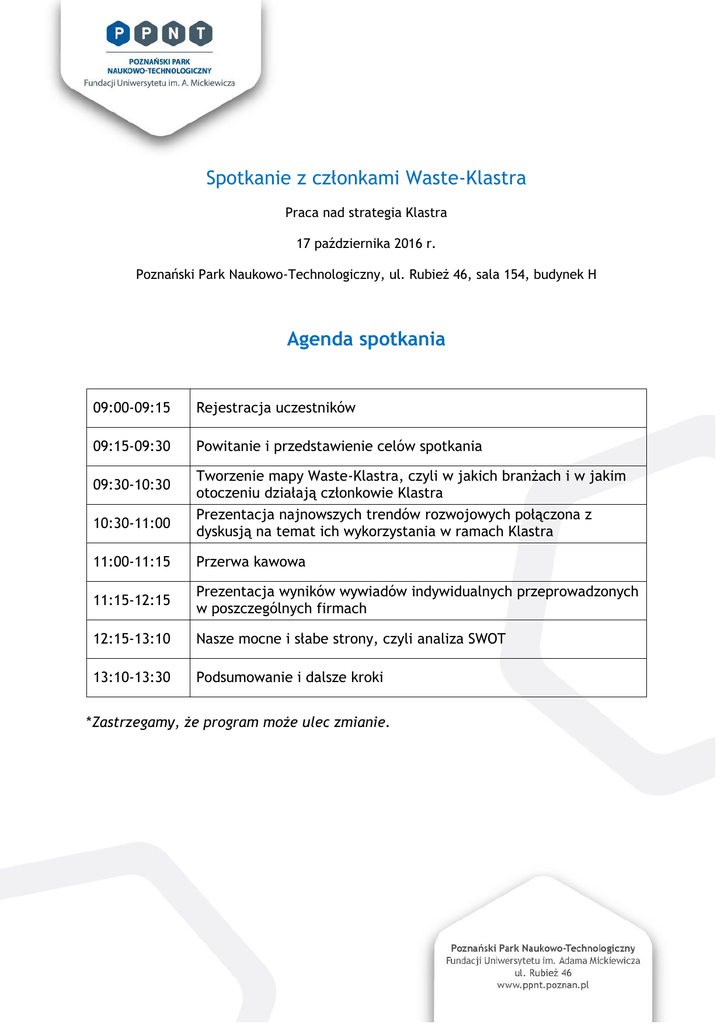 Spotkanie z członkami Waste-Klastra Praca nad strategia Klastra 17 października 2016 r. Poznański Park Naukowo-Technologiczny, ul. Rubież 46, sala 154, budynek H Agenda spotkania 09:00-09:15 Rejestracja uczestników 09:15-09:30 Powitanie i przedstawienie celów spotkania 09:30-10:30 10:30-11:00 Tworzenie mapy Waste-Klastra, czyli w jakich branżach i w jakim otoczeniu działają członkowie Klastra Prezentacja najnowszych trendów rozwojowych połączona z dyskusją na temat ich wykorzystania w ramach Klastra 11:00-11:15 Przerwa kawowa 11:15-12:15 Prezentacja wyników wywiadów indywidualnych przeprowadzonych w poszczególnych firmach 12:15-13:10 Nasze mocne i słabe strony, czyli analiza SWOT 13:10-13:30 Podsumowanie i dalsze kroki *Zastrzegamy, że program może ulec zmianie.
