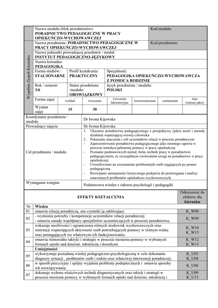 Wypełnia Zespół Kierunku Nazwa modułu (blok przedmiotów): Kod modułu: PORADNICTWO PEDAGOGICZNE W PRACY OPIEKUŃCZO-WYCHOWAWCZEJ Nazwa przedmiotu: PORADNICTWO PEDAGOGICZNE W Kod przedmiotu: PRACY OPIEKUŃCZO-WYCHOWAWCZEJ Nazwa jednostki prowadzącej przedmiot / moduł: INSTYTUT PEDAGOGICZNO-JĘZYKOWY Nazwa kierunku: PEDAGOGIKA Forma studiów: Profil kształcenia: Specjalność: STACJONARNE PRAKTYCZNY PEDAGOGIKA OPIEKUŃCZO-WYCHOWAWCZA Z POMOCA RODZINIE Rok / semestr: Status przedmiotu Język przedmiotu / modułu: /modułu: 3/6 POLSKI OBOWIĄZKOWY ćwiczenia inne Forma zajęć wykład ćwiczenia konwersatorium seminarium laboratoryjne Wymiar 15 zajęć Koordynator przedmiotu / modułu Prowadzący zajęcia 30 Dr Iwona Kijowska Dr Iwona Kijowska 1. 2. - Cel przedmiotu / modułu - - Wymagania wstępne Ukazanie poradnictwa pedagogicznego z perspektywy (jako) teorii i metody działania wspierającej rozwój człowieka Pokazanie znaczenia i roli uczestników relacji w procesie poradniczym Zaprezentowanie poradnictwa pedagogicznego jako istotnego ogniwa w procesie interdyscyplinarnej pomocy w pracy opiekuńczej Poznanie podstawowych metod, form, technik pracy w poradnictwie pedagogicznym, ze szczególnym zwróceniem uwagi na poradnictwo w pracy opiekuńczej; Uwrażliwienie na zrozumienie problematyki osób sięgających po pomoc pedagogiczną Rozwijanie umiejętności krytycznego podejścia do postrzegania i analizy omawianych problemów opiekuńczo-wychowawczych. Podstawowa wiedza z zakresu psychologii i pedagogiki EFEKTY KSZTAŁCENIA Nr 01 02 03 04 05 06 07 (wpisać jakie) Wiedza omawia relację poradniczą, zna czynniki ją zakłócające - wymienia potrzeby i kompetencje uczestników relacji poradniczej; - omawia zasady współpracy specjalistów uczestniczących w procesie poradnictwa; wskazuje możliwości i ograniczenia różnych środowisk wychowawczych oraz instytucji wspierających aktywność osób potrzebujących pomocy w różnym wieku oraz pomagających we właściwym ich funkcjonowaniu; omawia różnorodne taktyki i strategie w procesie niesienia pomocy w wybranych formach opieki nad dziećmi, młodzieżą i dorosłymi. Umiejętności wykorzystuje posiadaną wiedzę pedagogiczno-psychologiczną w celu dokonania diagnozy sytuacji , problemów osób i rodzin oraz właściwej interwencji poradniczej; w sposób precyzyjny i spójny wyjaśnia problemy podopiecznych i omawia sposoby ich rozwiązywania; dokonuje wyboru właściwych technik diagnostycznych oraz taktyk i strategii w procesie niesienia pomocy w wybranych formach opieki nad dziećmi, młodzieżą i Odniesienie do efektów dla kierunku K_W08 K_W09 K_W10 K_W15 K_W12 K_W13 K_U03 K_U04 K_U06 K_U09 K_U15 dorosłymi; inspiruje i motywuje siebie i innych do aktywności i poszukiwania rozwiązań 08 K_U11 pojawiających się problemów związanych z właściwym funkcjonowaniem rodzin. Kompetencje społeczne korzysta z dorobku nauk społecznych (pedagogiki i psychologii), by wskazać 09 K_K03 odpowiednie sposoby pomocy opiekuńczo-wychowawczej; jest przekonany o celowości podejmowanych działań pedagogicznych w pracy 10 K_K05 opiekuńczej; 11 inicjuje działania i mobilizuje innych oraz siebie do pracy na rzecz pomocy rodzinie. K_K07 TREŚCI PROGRAMOWE Forma zajęć – WYKŁAD 1. Problematyka i terminologia poradnictwa - przedmiot i cele poradnictwa pedagogicznego - koncepcje poradnictwa - podstawowe aspekty udzielania pomocy: metody, techniki, formy, taktyki i strategie poradnictwa - rodzaje poradnictwa - struktura i miejsce poradnictwa w systemie opieki i wychowania dzieci i młodzieży oraz osób dorosłych w Polsce 2. Bezpośrednia i pośrednia relacja poradnicza: 3. warunki, struktura cechy i przebieg bezpośredniej relacji poradniczej 4. pośrednie formy poradnictwa (telefony zaufania, listy, audycje radiowe, telewizyjne, poradniki, itp.). 3. Charakterystyka organizacji i oddziaływań poradnictwa. - w zakresie oddziaływań dydaktycznych - w zakresie oddziaływań wychowawczych: - w zakresie oddziaływań opiekuńczych: - w zakresie oddziaływań specjalistycznych: 4. Determinanty i korelaty skutecznego poradnictwa Kompetencje i kwalifikacje osoby udzielającej porady Forma zajęć – ĆWICZENIA 5. Bezpośrednia i pośrednia relacja poradnicza: - warunki, struktura cechy i przebieg bezpośredniej relacji poradniczej - pośrednie formy poradnictwa (telefony zaufania, listy, audycje radiowe, telewizyjne, poradniki, itp.). 6. Założenia, zasady oraz metody i techniki poradnictwa w pracy opiekuńczej; - Poradnictwo w wybranych instytucjach wspierających opiekę i wychowanie (poradnie psychologiczno-pedagogiczne; poradnie rodzinne) - Poradnictwo w wybranych formach opieki nad dziećmi i młodzieżą (świetlice socjoterapeutyczne, wtz, rodziny zastępcze i adopcyjne, domy dziecka) - Poradnictwo w zakresie opieki nad osobami niepełnosprawnymi - Poradnictwo w zakresie opieki nad osobami starymi, chorymi (również chorymi psychicznie) - Poradnictwo w hospicjum Metody kształcenia METODY PODAJĄCE (wykład z prezentacją multimedialną, objaśnienia) METODY EKSPONUJĄCE ( uczenie się poprzez przeżywanie) METODY PRAKTYCZNE (oparte na praktycznej działalności uczniów, m. aktywizujące - pokazy, prezentacje, ćwiczenia przedmiotowe) Metody weryfikacji efektów kształcenia Praca w grupach Zaprojektowanie interwencji poradniczej Praca kontrolna - sprawdzian wiadomości Forma i warunki Zaliczenie z oceną uwzględniające: zaliczenia - aktywność studentów na zajęciach Nr efektu kształcenia z sylabusa 2, 6, 8 - 11 4, 5, 6, 7 1, 2, 3, 11 Literatura podstawowa - Literatura uzupełniająca - - praca kontrolna, np. esej na podany temat Brągiel J., Badora S. (red.) Formy opieki, wychowania i wsparcia w zreformowanym systemie pomocy społecznej, Opole 2005 Czerniawska O. Poradnictwo jako wzmocnienie środowiska wychowawczego, 1977 Kargulowa A., O teorii i praktyce poradnictwa. Podręcznik akademicki. Wydawnictwo Naukowe PWN