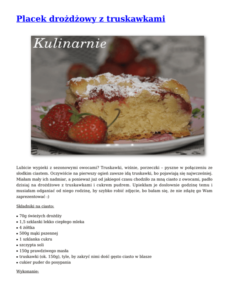 Placek drożdżowy z truskawkami Lubicie wypieki z sezonowymi owocami? Truskawki, wiśnie, porzeczki – pyszne w połączeniu ze słodkim ciastem. Oczywiście na pierwszy ogień zawsze idą truskawki, bo pojawiają się najwcześniej. Miałam mały ich nadmiar, a ponieważ już od jakiegoś czasu chodziło za mną ciasto z owocami, padło dzisiaj na drożdżowe z truskawkami i cukrem pudrem. Upiekłam je dosłownie godzinę temu i musiałam odganiać od niego rodzinę, by szybko robić zdjęcie, bo bałam się, że nie zdążę go Wam zaprezentować :) Składniki na ciasto: ■ ■ ■ ■ ■ ■ ■ ■ ■ 70g świeżych drożdży 1,5 szklanki lekko ciepłego mleka 4 żółtka 500g mąki pszennej 1 szklanka cukru szczypta soli 150g prawdziwego masła truskawki (ok. 150g), tyle, by zakryć nimi dość gęsto ciasto w blasze cukier puder do posypania Wykonanie: 1. Do miski wlewamy pół szklanki letniego mleka, wsypujemy dwie łyżeczki cukru, wkruszamy drożdże i wszystko rozcieramy razem. Odstawiamy na około 15 minut w ciepłe miejsce do lekkiego wyrośnięcia. 2. Masło topimy w mikrofalówce lub w rondelku i odstawiamy, by przestygło. 3. Mąkę wsypujemy do dużej miski, dodajemy szczyptę soli oraz cukier, żółtka i resztę mleka oraz wyrośnięty rozczyn z drożdży. Zagniatamy ręką lub mikserem wyposażonym w haki do wyrabiania drożdżowego ciasta. Do wyrobionego ciasta wlewamy masło i zarabiamy dalej, aż ciasto wypije cały tłuszcz. Ciasto to jest dość luźne, więc nie przejmujcie się, że nie będzie odchodziło lekko i elegancko od rąk. Przykrywamy je ściereczką i odstawiamy na godzinę w ciepłe miejsce. 4. Truskawki myjemy, odszypułkowujemy, przekrawamy na pół, jeśli są większe, to dzielimy je na cztery części. 5. Blaszkę (ok. 28cm x 24cm) smarujemy tłuszczem i wysypujemy mąką (jeśli wolicie, można wysypać bułką tartą). Do blachy wkładamy ciasto, wyrównujemy powierzchnię i układamy na niej truskawki. Odstawiamy na 10-15 minut do ponownego wyrośnięcia. 7. Nagrzewamy piekarnik do około 180 stopni Celsjusza. Wstawiamy ciasto i pieczemy je ok. 45 minut. Po upieczeniu pozostawiamy jeszcze na 15 minut w gorącym piekarniku. 8. Wyjmujemy ciasto z piekarnika, a kiedy nieco przestygnie, posypujemy cukrem pudrem. Świeże ciężko się kroi, ale zapewniam, że i tak warto :)