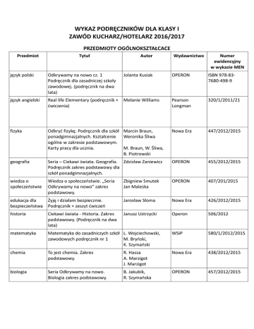 WYKAZ PODRĘCZNIKÓW DLA KLASY I ZAWÓD KUCHARZ/HOTELARZ 2016/2017 PRZEDMIOTY OGÓLNOKSZTAŁCACE Przedmiot Tytuł Autor Wydawnictwo Numer ewidencyjny w wykazie MEN język polski Odkrywamy na nowo cz. 1 Podręcznik dla zasadniczej szkoły zawodowej. (podręcznik na dwa lata) Jolanta Kusiak OPERON ISBN 978-837680-498-9 język angielski Real life Elementary (podręcznik + ćwiczenia) Melanie Williams Pearson Longman 320/1/2011/21 fizyka Odkryć fizykę. Podręcznik dla szkół Marcin Braun, ponadgimnazjalnych. Kształcenie Weronika Śliwa ogólne w zakresie podstawowym. Karty pracy dla ucznia. M. Braun, W. Śliwa, B. Piotrowski Nowa Era 447/2012/2015 geografia Seria – Ciekawi świata. Geografia. Zdzisław Zaniewicz Podręcznik zakres podstawowy dla szkół ponadgimnazjalnych. OPERON 455/2012/2015 wiedza o społeczeństwie Wiedza o społeczeństwie. „Seria Odkrywamy na nowo” zakres podstawowy. Zbigniew Smutek Jan Maleska OPERON 407/201/2015 edukacja dla Żyję i działam bezpiecznie. bezpieczeństwa Podręcznik + zeszyt ćwiczeń Jarosław Słoma Nowa Era 426/2012/2015 historia Ciekawi świata - Historia. Zakres podstawowy. (Podręcznik na dwa lata) Janusz Ustrzycki Operon 506/2012 matematyka Matematyka do zasadniczych szkół L. Wojciechowski, zawodowych podręcznik nr 1 M. Bryński, K. Szymański WSiP 580/1/2012/2015 chemia To jest chemia. Zakres podstawowy. R. Hassa A. Marzigot J. Marzigot Nowa Era 438/2012/2015 biologia Seria Odkrywamy na nowo. Biologia zakres podstawowy. B. Jakubik, R. Szymańska OPERON 457/2012/2015 PRZEDMIOTY ZAWODOWE KUCHARZ Przedmiot Tytuł Technologia Technologia gastronomiczna z gastronomiczna z towaroznawstwem. Część I towaroznawstwem Kwalifikacja T.6 Autor Wydawnictwo Rea 69/2013 Wyposażenie Wyposażenie i zasady Agnieszka Kasperek, techniczne i zasady bezpieczeństwa w gastronomii. Marzena bezpieczeństwa w Kwalifikacja T.6 Kondratowicz gastronomii Rea 2013 Działalność gospodarcza w gastronomii Rea 1/2014 Działalność gospodarcza w gastronomii. Małgorzata Konarzewska Numer ewidencyjny w wykazie MEN Hanna GórskaWarsewicz, Beata Sawicka, Teresa Mikulska PRZEDMIOTY ZAWODOWE ZAWÓD PRACOWNIK POMOCNICZY OBSŁUGI HOTELOWEJ Przedmiot Tytuł Podstawy hotelarstwa Podręcznik zostanie podany we wrześniu Otoczenie obiektu hotelarskiego Podręcznik zostanie podany we wrześniu Autor Wydawnictwo Numer ewidencyjny w wykazie MEN