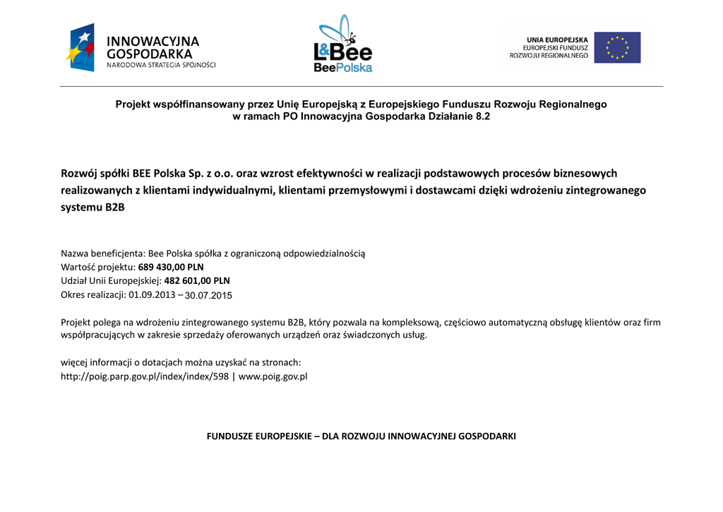 Projekt współfinansowany przez Unię Europejską z Europejskiego Funduszu Rozwoju Regionalnego w ramach PO Innowacyjna Gospodarka Działanie 8.2 Rozwój spółki BEE Polska Sp. z o.o. oraz wzrost efektywności w realizacji podstawowych procesów biznesowych realizowanych z klientami indywidualnymi, klientami przemysłowymi i dostawcami dzięki wdrożeniu zintegrowanego systemu B2B Nazwa beneficjenta: Bee Polska spółka z ograniczoną odpowiedzialnością Wartość projektu: 689 430,00 PLN Udział Unii Europejskiej: 482 601,00 PLN Okres realizacji: 01.09.2013 – 30.07.2015 Projekt polega na wdrożeniu zintegrowanego systemu B2B, który pozwala na kompleksową, częściowo automatyczną obsługę klientów oraz firm współpracujących w zakresie sprzedaży oferowanych urządzeń oraz świadczonych usług. więcej informacji o dotacjach można uzyskać na stronach: http://poig.parp.gov.pl/index/index/598 | www.poig.gov.pl FUNDUSZE EUROPEJSKIE – DLA ROZWOJU INNOWACYJNEJ GOSPODARKI