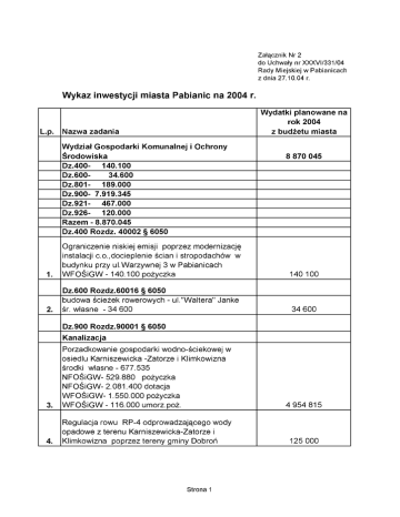 Wykaz inwestycji miasta Pabianic na 2004 r. Wydatki planowane na rok 2004 z budŜetu miasta L.p. Nazwa zadania Wydział Gospodarki Komunalnej i Ochrony Środowiska Dz.400- 140.100 Dz.60034.600 Dz.801- 189.000 Dz.900- 7.919.345 Dz.921- 467.000 Dz.926- 120.000 Razem - 8.870.045 Dz.400 Rozdz. 40002 § 6050 1. Załącznik Nr 2 do Uchwały nr XXXVI/331/04 Rady Miejskiej w Pabianicach z dnia 27.10.04 r. Ograniczenie niskiej emisji poprzez modernizację instalacji c.o.,docieplenie ścian i stropodachów w budynku przy ul.Warzywnej 3 w Pabianicach WFOŚiGW - 140.100 poŜyczka 8 870 045 140 100 Dz.600 Rozdz.60016 § 6050 2. budowa ścieŜek rowerowych - ul."Waltera" Janke śr. własne - 34 600 34 600 Dz.900 Rozdz.90001 § 6050 Kanalizacja 3. Porzadkowanie gospodarki wodno-ściekowej w osiedlu Karniszewicka -Zatorze i Klimkowizna środki własne - 677.535 NFOŚiGW- 529.880 poŜyczka NFOŚiGW- 2.081.400 dotacja WFOŚiGW- 1.550.000 poŜyczka WFOŚiGW - 116.000 umorz.poŜ. 4 954 815 4. Regulacja rowu RP-4 odprowadzającego wody opadowe z terenu Karniszewicka-Zatorze i Klimkowizna poprzez tereny gminy Dobroń 125 000 Strona 1 5 a b 6 7 8 Wypełnienie zlewni kolektora sanitarnego Pabianice GOŚ--ŁAM Modernizacja i rozbudowa systemu kanalizacji sanitarnej miasta dokumentacja techniczna , studium wykonalności 320.000 - środki własne 147.620 - NFOŚiGW -dotacja 118.096 - WFOŚiGW dotacja kanalizacja ogólnospławna w ul.Partyzanckiej Awaria kolektora w rejonie ul.Sejmowa na terenie Zakładów Farmaceutycznych "Polfa" WFOŚ- 250.000 dotacja Likwidacja awarii kolektorów deszczowych w ul.Kilińskiego i Warszawskiej Odprowadzenie wód opadowych z ul. Moniuszki,Niecała,Ostatnia 585 716 410 000 250 000 0 0 Rozdz. 90095 § 6050 Ciepło 9 Uciepłownienie osiedla "Piaski " w P-cach -II etap WFOŚiGW - 325.000 poŜyczka 325 000 Kubatura 10 Adaptacja i modernizacja bud.ul.Cicha 24 w Pabianicach rozbudowa obiektu środki własne -313.000 WFOŚiGW- 200.000 dotacja 513 000 11 Budownictwo mieszkaniowe ul.Sienkiewicza 200 000 12 Budowa grobli, regulacja rzeki Dobrzynki powyŜej jazu-II etap 10 000 13 Dokumentacja przyszłościowa 90 000 14 Pozostała działalność 38 314 15 Lokalne Inicjatywy Inwestycyjne a budowa drogi w ul.Smugowej budowa uzbrojenia wod-kan ul.KsięŜycowa środki własne - 100.475 LII - 49.500 b RóŜne Strona 2 160 000 149 975 16 budowa uzbrojenia wod-kan ul.Karniszewicka 74-74c łopatka 67 525 17 Remont budynku przy ul.Mariańskiej 4/6 40 000 Dz.801 Rozdział 80110 § 6050 18 19 Termomodernizacja Gimnazjum Nr 2- sala sportowa ul.Orla 1 Likwidacja barier w zakresie umoŜliwiającym osobom niepełnosprawnym poruszanie się i komunikowanie w Gimnazjum nr 3 w Pabianicach 60.000 - środki własne 50.000 - PFRON 110 000 Kultura i sztuka Remont muzeum 467 000 Dz.921 Rozdz. 92118 § 6050 20 79 000 Dz. 926 Rozdz. 92604 § 6050 21 22 Prace remontowe i modernizacyjne hotelu "Włókniarz|" Przyłącze do kanalizacji deszczowej dla MOSiR (basen) 50 000 Wydział Gospodarki Nieruchomościami i Urbanistyki Dz.700 Rozdział 70005 § 6050 269 752 nabywanie nieruchomości na własność gminy ( do zasobu gminnego na realizację wszelkich działań inwestycyjnych) pierwokupy wykupy terenów na podstawie obowiązujących planów zagospododarowania przestrzennego Wydział Edukacji Kultury i Zdrowia Dz.801 Rozdział 80101 § 6060 70 000 153 500 6 252 110 000 40 000 zakup sprzętu komputerowego -Sz.Pod.Nr 3 30 000 zakup zestawu komputerowego Przedszkole Nr 11 zakup zmywarki Przedszkole nr 16 5 000 5 000 Rozdział 80104 § 6060 Kancelaria Prezydenta Miasta Dz.750 Rozdział 75023 § 6060 zakupy komputerowe 95 000 15 000 Strona 3 oprogramowanie informix drukarki laserowe bateria i moduł mocy 22 000 40 000 6 500 11 500 zakup video-radaru 0 Dz.754 Rozdz.75416 § 6060 Razem inwestycje miejskie 9 274 797 Zadania zlecone Dz 852 Rozdział 85203 § 6050 250 000 Adaptacja i modernizacja budynku w Pabianicach przy ul.Cicha 24/26 na potrzebyŚrodowiskowego Domu Samopomocy dla Osób z zaburzeniami Psychicznymi I etap Rozdz 85212 § 6060 zakup komputera wraz z oprogramowaniem Razem inwestycje na zadania własne i zlecone Strona 4 27 224 27 224 9 552 021