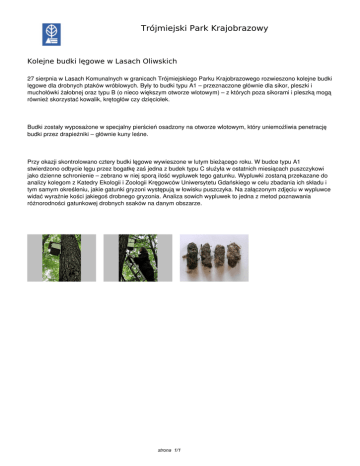 Trójmiejski Park Krajobrazowy Kolejne budki lęgowe w Lasach Oliwskich 27 sierpnia w Lasach Komunalnych w granicach Trójmiejskiego Parku Krajobrazowego rozwieszono kolejne budki lęgowe dla drobnych ptaków wróblowych. Były to budki typu A1 – przeznaczone głównie dla sikor, pleszki i muchołówki żałobnej oraz typu B (o nieco większym otworze wlotowym) – z których poza sikorami i pleszką mogą również skorzystać kowalik, krętogłów czy dzięciołek. Budki zostały wyposażone w specjalny pierścień osadzony na otworze wlotowym, który uniemożliwia penetrację budki przez drapieżniki – głównie kuny leśne. Przy okazji skontrolowano cztery budki lęgowe wywieszone w lutym bieżącego roku. W budce typu A1 stwierdzono odbycie lęgu przez bogatkę zaś jedna z budek typu C służyła w ostatnich miesiącach puszczykowi jako dzienne schronienie – zebrano w niej sporą ilość wypluwek tego gatunku. Wypluwki zostaną przekazane do analizy kolegom z Katedry Ekologii i Zoologii Kręgowców Uniwersytetu Gdańskiego w celu zbadania ich składu i tym samym określeniu, jakie gatunki gryzoni występują w łowisku puszczyka. Na załączonym zdjęciu w wypluwce widać wyraźnie kości jakiegoś drobnego gryzonia. Analiza sowich wypluwek to jedna z metod poznawania różnorodności gatunkowej drobnych ssaków na danym obszarze. strona 1/1 Powered by TCPDF (www.tcpdf.org)