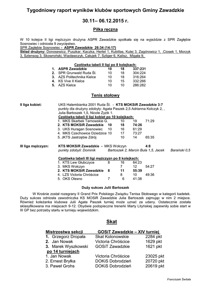 Tygodniowy raport wyników klubów sportowych Gminy Zawadzkie 30.11– 06.12.2015 r. Piłka ręczna W 10 kolejce II ligi mężczyzn drużyna ASPR Zawadzkie spotkała się na wyjeździe z SPR Zagłębie Sosnowiec i odniosła 9 zwycięstwo. SPR Zagłębie Sosnowiec - ASPR Zawadzkie 26:34 (14:17) Skład drużyny: Donosewicz, Puszkar, Kaczka, Hertel 1, Kubillas, Kulej 3, Zagórowicz 1, .Ciosek 1, Morzyk 3, Szlensog 3, Skowroński, Wacławczyk, Całujek 7, Szliger 6, Kalisz, Migała 9, 1. 2. 3. 4. 5. Czołówka tabeli II ligi po 8 kolejkach: ASPR Zawadzkie 10 18 337:231 SPR Grunwald Ruda Śl. 10 18 304:224 AZS Politechnika Kielce 10 18 316:264 KS Vive II Kielce 10 15 332:266 AZS Kielce 10 10 286:282 Tenis stołowy II liga kobiet: UKS Halembianka 2001 Ruda Śl. - KTS MOKSiR Zawadzkie 3:7 punkty dla drużyny zdobyły: Agata Paszek 2,5 Adrianna Kolczyk 2, , Julia Bartoszek 1,5, Nicole Zyzik 1. Czołówka tabeli II ligi kobiet po 10 kolejkach: 1. MKS Skarbek Tarnowskie G. 10 19 71:29 2. KTS MOKSiR Zawadzkie 10 18 74:26 3. UKS Huragan Sosnowiec 10 16 61:29 4. MKS Czechowice Dziedzice 10 17 73:27 5. JKTS Jastrzębie Zdrój 10 14 65:35 III liga mężczyzn: KTS MOKSiR Zawadzkie - MKS Wołczyn 4:8 punkty zdobyli: Dominik Bartoszek 2, Marcin Bula 1,5, Jacek Barański 0,5 Czołówka tabeli III ligi mężczyzn po 8 kolejkach: 1. KTS Lew Głubczyce 8 16 64:23 3. MKS Wołczyn 7 12 54:27 2. KTS MOKSiR Zawadzkie 8 11 55:39 4. LZS Victoria Chróścice 8 10 49:36 5. OKS Olesno 7 6 41:38 Duży sukces Julii Bartoszek W Krośnie został rozegrany II Grand Prix Polskiego Związku Tenisa Stołowego w kategorii kadetek. Duży sukces odniosła zawodniczka KS MOSiR Zawadzkie Julia Bartoszek zajmując w nim 2 miejsce. Również koleżanka klubowa Julii Agata Paszek turniej może uznać za udany. Ostatecznie została sklasyfikowana ma miejscach 9-12. Obydwie podopieczne trenerki Marty Lityńskiej zapewniły sobie start w III GP bez potrzeby startu w turnieju wojewódzkim. Skat Mistrzostwa sekcji 1. Grzegorz Dropała 2. Jan Nowak 3. Marek Wyszkowski po 14 turniejach 1. Jan Nowak 2. Ernest Bryłka 3. Paweł Grohs GOSiT Zawadzkie – XIV turniej Skat Kolonowskie 2284 pkt Victoria Chróścice 1629 pkt GOSiT Zawadzkie 1621 pkt Victoria Chróścice DOKiS Dobrodzień DOKiS Dobrodzień 23025 pkt 20720 pkt 20619 pkt Franciszek Świtała