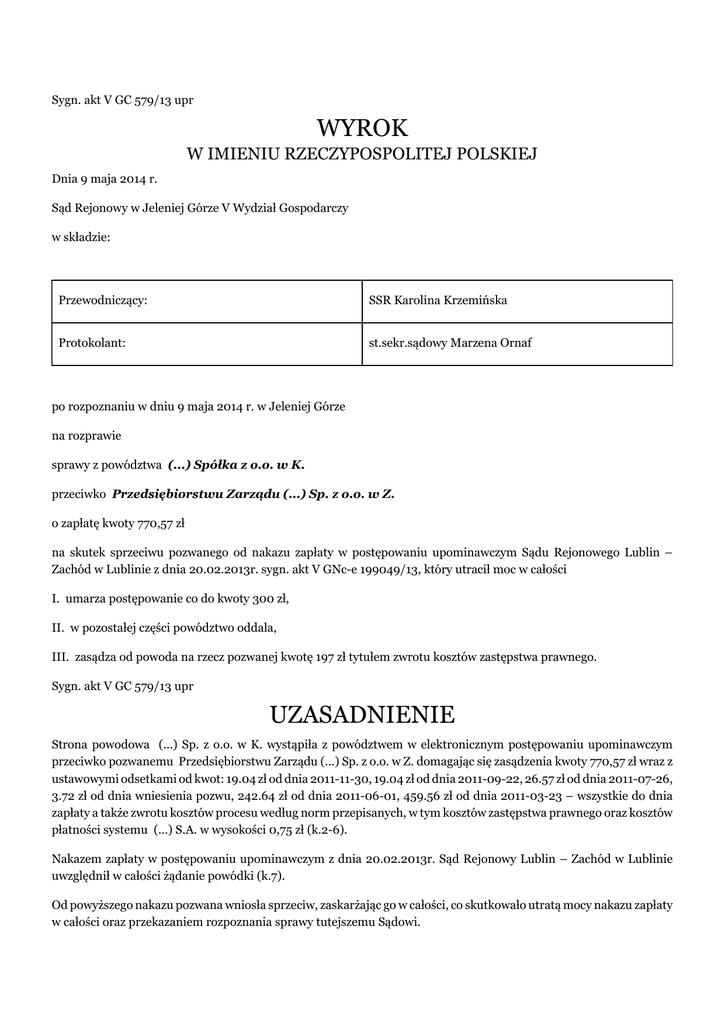 Sygn. akt V GC 579/13 upr WYROK W IMIENIU RZECZYPOSPOLITEJ POLSKIEJ Dnia 9 maja 2014 r. Sąd Rejonowy w Jeleniej Górze V Wydział Gospodarczy w składzie: Przewodniczący: SSR Karolina Krzemińska Protokolant: st.sekr.sądowy Marzena Ornaf po rozpoznaniu w dniu 9 maja 2014 r. w Jeleniej Górze na rozprawie sprawy z powództwa (...) Spółka z o.o. w K. przeciwko Przedsiębiorstwu Zarządu (...) Sp. z o.o. w Z. o zapłatę kwoty 770,57 zł na skutek sprzeciwu pozwanego od nakazu zapłaty w postępowaniu upominawczym Sądu Rejonowego Lublin – Zachód w Lublinie z dnia 20.02.2013r. sygn. akt V GNc-e 199049/13, który utracił moc w całości I. umarza postępowanie co do kwoty 300 zł, II. w pozostałej części powództwo oddala, III. zasądza od powoda na rzecz pozwanej kwotę 197 zł tytułem zwrotu kosztów zastępstwa prawnego. Sygn. akt V GC 579/13 upr UZASADNIENIE Strona powodowa (...) Sp. z o.o. w K. wystąpiła z powództwem w elektronicznym postępowaniu upominawczym przeciwko pozwanemu Przedsiębiorstwu Zarządu (...) Sp. z o.o. w Z. domagając się zasądzenia kwoty 770,57 zł wraz z ustawowymi odsetkami od kwot: 19.04 zł od dnia 2011-11-30, 19.04 zł od dnia 2011-09-22, 26.57 zł od dnia 2011-07-26, 3.72 zł od dnia wniesienia pozwu, 242.64 zł od dnia 2011-06-01, 459.56 zł od dnia 2011-03-23 – wszystkie do dnia zapłaty a także zwrotu kosztów procesu według norm przepisanych, w tym kosztów zastępstwa prawnego oraz kosztów płatności systemu (...) S.A. w wysokości 0,75 zł (k.2-6). Nakazem zapłaty w postępowaniu upominawczym z dnia 20.02.2013r. Sąd Rejonowy Lublin – Zachód w Lublinie uwzględnił w całości żądanie powódki (k.7). Od powyższego nakazu pozwana wniosła sprzeciw, zaskarżając go w całości, co skutkowało utratą mocy nakazu zapłaty w całości oraz przekazaniem rozpoznania sprawy tutejszemu Sądowi. W uzupełnionym pozwie strona powodowa podtrzymała dotychczasowe żądanie. W uzasadnieniu wskazała, że w dniu 01.03.2003r. pozwana zawarła z poprzednikiem prawnym powódki – Zakładem (...) S.A. umowę sprzedaży energii elektrycznej, na mocy której powódka dostarczała ją do lokalu położonego przy ul. (...) w Z., za co wystawiła faktury i notę odsetkową dołączone do pozwu. W wyniku przekształceń własnościowych dostawców energii przedmiotowa wierzytelność przysługuje obecnie powódce. W piśmie z dnia 18.11.2013r. strona powodowa ograniczyła żądanie pozwu o kwotę 300 zł w związku z wpłatą dokonaną po wytoczeniu powództwa (k.34 akt). W uzupełnionym sprzeciwie pozwana wniosła o oddalenie powództwa w całości oraz o zasądzenie od powódki kosztów postępowania (k.80-83 akt). W uzasadnieniu wskazała, że nie jest stroną umowy przesyłu i sprzedaży energii elektrycznej, z której powódka wywodzi swe roszczenie, albowiem jej stroną i jednocześnie odbiorcą energii jest (...) przy ul. (...) w Z., zaś pozwana przy zawarciu umowy działała jedynie jako jej zarządca. Na podstawie tej umowy zarówno powódka jak i jej poprzednicy prawni wystawiali faktury na Wspólnotę Mieszkaniową. Pozwana nie ma więc legitymacji do występowania w niniejszym procesie. Sąd ustalił następujący stan faktyczny: Uchwałą nr (...) członkowie (...) przy ul. (...) w Z. powierzyli zarząd nieruchomością wspólną pozwanej . okoliczności niesporne a nadto dowody: - protokół zebrania wspólnoty – k. 54-55, - wypis z rejestru gruntów – k. 56 akt, - zawiadomienie o wpisie do księgi wieczystej – k. 56 akt, - odpis aktualny KRS pozwanej – k. 84-87 akt. W dniu 01.03.2003r. poprzednik prawny powódki – Zakład (...) S.A. zwarła z (...) przy ul. (...) w Z. w imieniu której działał Prezes pozwanego Przedsiębiorstwa Zarządu (...) Sp. z o.o. w Z. umowę przesyłu i sprzedaży energii elektrycznej do obiektu mieszczącego się w Z. na ul. (...). W związku z dostarczaniem energii elektrycznej na podstawie w/w umowy strona powodowa wystawiła faktury vat o nr: • (...) na kwotę 19.04 zł z terminem płatności do dnia 2011-11-29, • (...) na kwotę 19.04 zł z terminem płatności do dnia 2011-09-21 , • (...) na kwotę 26.57 zł z terminem płatności do dnia 2011-07-265, • notę odsetkową wykazaną fakturą nr (...) na kwotę 3.72 zł, • (...) na kwotę 242.64 zł z terminem płatności do dnia 2011-05-31, • (...) na kwotę 459.56 zł z terminem płatności do dnia 2011-03-22. Pismem z dnia 05.10.2011r. powódka wypowiedziała w/w umowę z uwagi na nieuregulowanie ciążących na odbiorcy płatności. Pismem z dnia 14.03.2012r. powódka wezwała pozwaną do zapłaty kwoty 860,57 zł, jednak bezskutecznie. okoliczności niesporne a nadto dowody: - umowa sprzedaży z dnia 01.03.2003r. – k. 50v-53 akt - faktury vat– k.60-69 akt, - odpis pełny z KRS powódki – k. 40-44 akt, - ogłoszenie w MSIG – k. 45-46 akt, - postanowienie z dnia 03.01.2011r. – k. 47-48 akt, - wezwanie do zapłaty – k.49-50 akt, - wydruk z rejestru REGON – k. 49v akt, - wypowiedzenie umowy – k. 58v akt Sąd zważył co następuje: Powództwo nie zasługiwało na uwzględnienie z uwagi na brak legitymacji biernej po stronie pozwanej. Z przedłożonej przez stronę powodową umowy przesyłu i sprzedaży energii elektrycznej z dnia 01.03.2003r. wynika w sposób jednoznaczny, iż jej stroną była (...) przy ul. (...) w Z.. Zgodnie z treścią art. 6 ust.1 zd. 2 ustawy z dnia 24 czerwca 1994 r. o własności lokali (Dz.U.2000.80.903 j.t.) wspólnota mieszkaniowa może nabywać prawa i zaciągać zobowiązania, pozywać i być pozwana. Wspólnota mieszkaniowa nie posiada osobowości prawnej, gdyż ustawa jej takiej osobowości nie przyznaje. Zarazem jednak nadano wspólnocie mieszkaniowej pewne cechy upodabniające ją do osoby prawnej - możliwość nabywania praw, zaciągania zobowiązań, pozywania do sądu i bycia pozywaną do sądu. Jest ona więc tzw. ułomną osobą prawną. Może być bowiem podmiotem praw i 