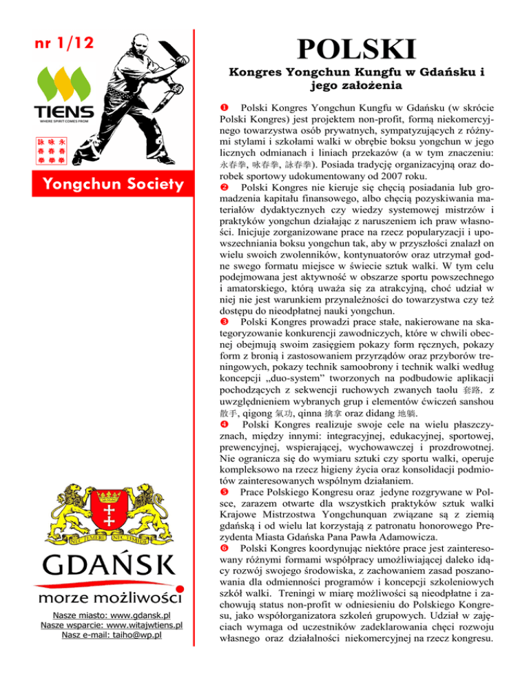 nr 1/12 POLSKI Kongres Yongchun Kungfu w Gdańsku i jego założenia Yongchun Society Nasze miasto: www.gdansk.pl Nasze wsparcie: www.witajwtiens.pl Nasz e-mail: [email protected]  Polski Kongres Yongchun Kungfu w Gdańsku (w skrócie Polski Kongres) jest projektem non-profit, formą niekomercyjnego towarzystwa osób prywatnych, sympatyzujących z różnymi stylami i szkołami walki w obrębie boksu yongchun w jego licznych odmianach i liniach przekazów (a w tym znaczeniu: 永春拳, 咏春拳, 詠春拳). Posiada tradycję organizacyjną oraz dorobek sportowy udokumentowany od 2007 roku.  Polski Kongres nie kieruje się chęcią posiadania lub gromadzenia kapitału finansowego, albo chęcią pozyskiwania materiałów dydaktycznych czy wiedzy systemowej mistrzów i praktyków yongchun działając z naruszeniem ich praw własności. Inicjuje zorganizowane prace na rzecz popularyzacji i upowszechniania boksu yongchun tak, aby w przyszłości znalazł on wielu swoich zwolenników, kontynuatorów oraz utrzymał godne swego formatu miejsce w świecie sztuk walki. W tym celu podejmowana jest aktywność w obszarze sportu powszechnego i amatorskiego, którą uważa się za atrakcyjną, choć udział w niej nie jest warunkiem przynależności do towarzystwa czy też dostępu do nieodpłatnej nauki yongchun.  Polski Kongres prowadzi prace stałe, nakierowane na skategoryzowanie konkurencji zawodniczych, które w chwili obecnej obejmują swoim zasięgiem pokazy form ręcznych, pokazy form z bronią i zastosowaniem przyrządów oraz przyborów treningowych, pokazy technik samoobrony i technik walki według koncepcji „duo-system” tworzonych na podbudowie aplikacji pochodzących z sekwencji ruchowych zwanych taolu 套路, z uwzględnieniem wybranych grup i elementów ćwiczeń sanshou 散手, qigong 氣功, qinna 擒拿 oraz didang 地躺.  Polski Kongres realizuje swoje cele na wielu płaszczyznach, między innymi: integracyjnej, edukacyjnej, sportowej, prewencyjnej, wspierającej, wychowawczej i prozdrowotnej. Nie ogranicza się do wymiaru sztuki czy sportu walki, operuje kompleksowo na rzecz higieny życia oraz konsolidacji podmiotów zainteresowanych wspólnym działaniem.  Prace Polskiego Kongresu oraz jedyne rozgrywane w Polsce, zarazem otwarte dla wszystkich praktyków sztuk walki Krajowe Mistrzostwa Yongchunquan związane są z ziemią gdańską i od wielu lat korzystają z patronatu honorowego Prezydenta Miasta Gdańska Pana Pawła Adamowicza.  Polski Kongres koordynując niektóre prace jest zainteresowany różnymi formami współpracy umożliwiającej daleko idący rozwój swojego środowiska, z zachowaniem zasad poszanowania dla odmienności programów i koncepcji szkoleniowych szkół walki. Treningi w miarę możliwości są nieodpłatne i zachowują status non-profit w odniesieniu do Polskiego Kongresu, jako współorganizatora szkoleń grupowych. Udział w zajęciach wymaga od uczestników zadeklarowania chęci rozwoju własnego oraz działalności niekomercyjnej na rzecz kongresu.
