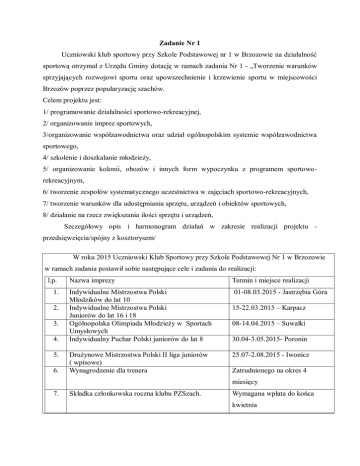 Zadanie Nr 1 Uczniowski klub sportowy przy Szkole Podstawowej nr 1 w Brzozowie na działalność sportową otrzymał z Urzędu Gminy dotację w ramach zadania Nr 1 - „Tworzenie warunków sprzyjających rozwojowi sportu oraz upowszechnienie i krzewienie sportu w miejscowości Brzozów poprzez popularyzację szachów. Celem projektu jest: 1/ programowanie działalności sportowo-rekreacyjnej, 2/ organizowanie imprez sportowych, 3/organizowanie współzawodnictwa oraz udział ogólnopolskim systemie współzawodnictwa sportowego, 4/ szkolenie i doszkalanie młodzieży, 5/ organizowanie kolonii, obozów i innych form wypoczynku z programem sportoworekreacyjnym, 6/ tworzenie zespołów systematycznego uczestnictwa w zajęciach sportowo-rekreacyjnych, 7/ tworzenie warunków dla udostępniania sprzętu, urządzeń i obiektów sportowych, 8/ działanie na rzecz zwiększania ilości sprzętu i urządzeń, Szczegółowy opis i harmonogram działań w zakresie realizacji projektu przedsięwzięcia/spójny z kosztorysem/ W roku 2015 Uczniowski Klub Sportowy przy Szkole Podstawowej Nr 1 w Brzozowie w ramach zadania postawił sobie następujące cele i zadania do realizacji: l.p. 1. 2. 3. 4. 5. 6. Nazwa imprezy Termin i miejsce realizacji Indywidualne Mistrzostwa Polski Młodzików do lat 10 Indywidualne Mistrzostwa Polski Juniorów do lat 16 i 18 Ogólnopolska Olimpiada Młodzieży w Sportach Umysłowych Indywidualny Puchar Polski juniorów do lat 8 01-08.03.2015 - Jastrzębia Góra Drużynowe Mistrzostwa Polski II liga juniorów ( wpisowe) Wynagrodzenie dla trenera 15-22.03.2015 – Karpacz 08-14.04.2015 – Suwałki 30.04-3.05.2015- Poronin 25.07-2.08.2015 - Iwonicz Zatrudnionego na okres 4 miesięcy 7. Składka członkowska roczna klubu PZSzach. Wymagana wpłata do końca kwietnia Realizacja projektu w znacznym stopniu przyczyni się do podniesienia indywidualnych umiejętności, poprawi się sprawność fizyczna oraz umysłowa uczniów w dyscyplinie jaką jest tenis stołowy i szachy. Realizacja projektu wzbogacił ofertę edukacyjną Szkoły Podstawowej miasta Brzozów formie zajęć pozalekcyjnych wspierająca wieloaspektowy rozwój uczniów. Uczniowie zdobędą umiejętność gry w szachy rozwiną kwalifikacje kluczowe i społeczne (porozumiewanie się, zdolności matematyczne, umiejętność uczenia się, przedsiębiorczości, zdolności logicznego i krytycznego myślenia). Udział w projekcie wpłynie na wzrost pewności siebie i poziomu samooceny oraz umiejętności komunikacyjnych. Uczestnicy będą uczyć się jak radzić sobie z niepowodzeniami oraz jak pracować nad osiągnięciem wyznaczonych celów. Wyżej wymienione działania ukształtowały również aktywną postawę życiową beneficjentów. Aby to osiągnąć oprócz prowadzenia zajęć z młodzieżą należy również startować w wielu zawodach i turniejach. Jednocześnie należy stopniowo podnosić poprzeczkę aby młody sportowiec mógł się prawidłowo rozwijać. Jesteśmy przekonani, że udział w zawodach rangi wojewódzkiej oraz Mistrzostwach Polski w dużej mierze przyczyni się do osiągnięcia tych celów. Realizacja projektu przyniesie efekt w postaci promocji Gminy Brzozów w różnych zakątkach Polski.