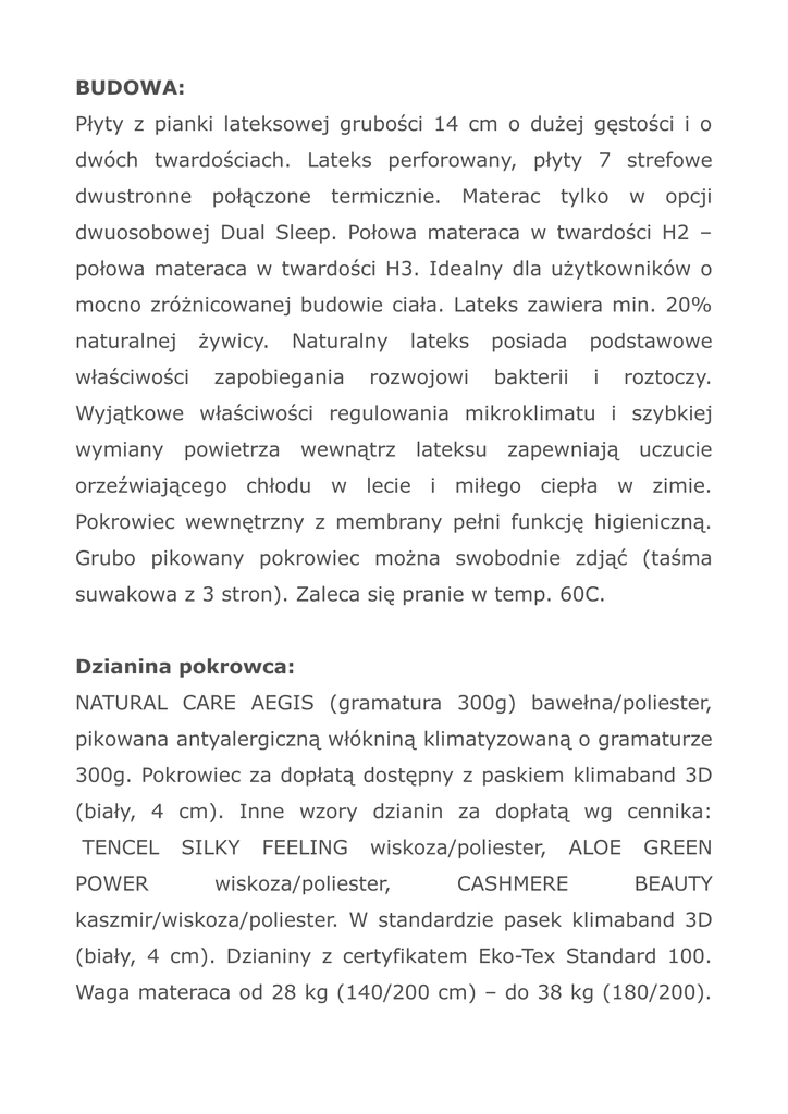 BUDOWA: Płyty z pianki lateksowej grubości 14 cm o dużej gęstości i o dwóch twardościach. Lateks perforowany, płyty 7 strefowe dwustronne połączone termicznie. Materac tylko w opcji dwuosobowej Dual Sleep. Połowa materaca w twardości H2 – połowa materaca w twardości H3. Idealny dla użytkowników o mocno zróżnicowanej budowie ciała. Lateks zawiera min. 20% naturalnej żywicy. właściwości Naturalny zapobiegania lateks posiada podstawowe rozwojowi bakterii i roztoczy. Wyjątkowe właściwości regulowania mikroklimatu i szybkiej wymiany powietrza wewnątrz lateksu zapewniają uczucie orzeźwiającego chłodu w lecie i miłego ciepła w zimie. Pokrowiec wewnętrzny z membrany pełni funkcję higieniczną. Grubo pikowany pokrowiec można swobodnie zdjąć (taśma suwakowa z 3 stron). Zaleca się pranie w temp. 60C. Dzianina pokrowca: NATURAL CARE AEGIS (gramatura 300g) bawełna/poliester, pikowana antyalergiczną włókniną klimatyzowaną o gramaturze 300g. Pokrowiec za dopłatą dostępny z paskiem klimaband 3D (biały, 4 cm). Inne wzory dzianin za dopłatą wg cennika: TENCEL POWER SILKY FEELING wiskoza/poliester, wiskoza/poliester, CASHMERE ALOE GREEN BEAUTY kaszmir/wiskoza/poliester. W standardzie pasek klimaband 3D (biały, 4 cm). Dzianiny z certyfikatem Eko-Tex Standard 100. Waga materaca od 28 kg (140/200 cm) – do 38 kg (180/200). Wysokość materaca około 16 cm. Wyrób Medyczny KL. I. ZASTOSOWANIE: łóżka i sypialnie, waga użytkownika H2 do 90 kg, H3 pow. 90 kg. Dla użytkowników o zróżnicowanej budowie ciała. UWAGI: materac średnio-twardy H2, twardy H3, dwustronny. Dwie strony użytkowe o identycznej budowie. GWARANCJA: 2 lata na produkt, 10 lat na wkład materaca GRUPA WIEKOWA: bez ograniczeń TWARDOŚĆ: H2/H3 WYSOKOŚĆ: 16 cm
