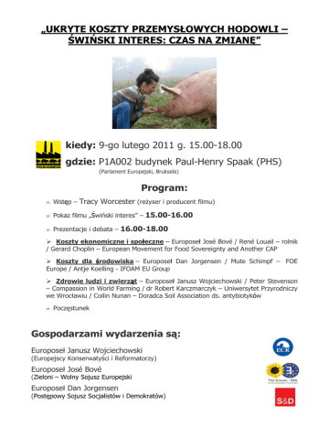 „UKRYTE KOSZTY PRZEMYSŁOWYCH HODOWLI – ŚWIŃSKI INTERES: CZAS NA ZMIANĘ” kiedy: 9-go lutego 2011 g. 15.00-18.00 gdzie: P1A002 budynek Paul-Henry Spaak (PHS) (Parlament Europejski, Bruksela) Program: • Wstęp – Tracy Worcester (reżyser i producent filmu) • Pokaz filmu „Świński interes” – 15.00-16.00 • Prezentacje i debata – 16.00-18.00 Koszty ekonomiczne i społeczne – Europoseł José Bové / René Louail – rolnik / Gerard Choplin – European Movement for Food Sovereignty and Another CAP Koszty dla środowiska – Europoseł Dan Jorgensen / Mute Schimpf – FOE Europe / Antje Koelling - IFOAM EU Group Zdrowie ludzi i zwierząt – Europoseł Janusz Wojciechowski / Peter Stevenson – Compassion in World Farming / dr Robert Karczmarczyk – Uniwersytet Przyrodniczy we Wrocławiu / Coilin Nunan – Doradca Soil Association ds. antybiotyków • Poczęstunek Gospodarzami wydarzenia są: Europoseł Janusz Wojciechowski (Europejscy Konserwatyści i Reformatorzy) Europoseł José Bové (Zieloni – Wolny Sojusz Europejski Europoseł Dan Jorgensen (Postępowy Sojusz Socjalistów i Demokratów)