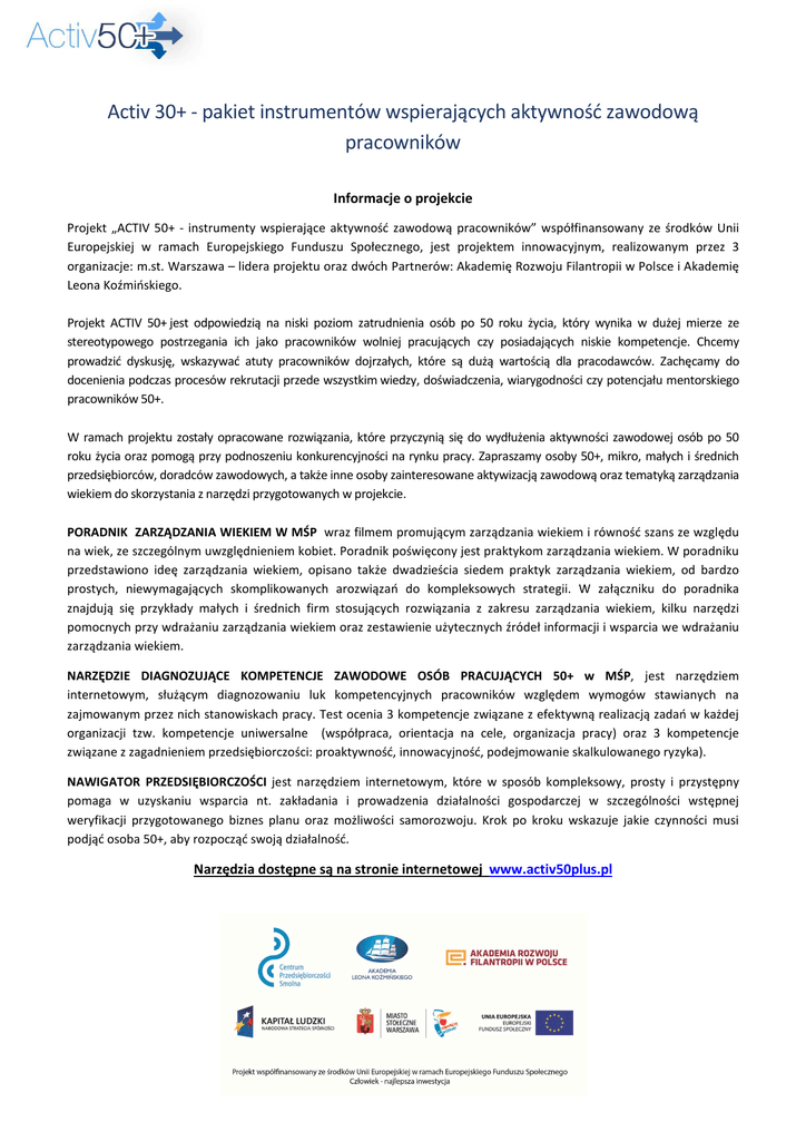 Activ 30+ - pakiet instrumentów wspierających aktywność zawodową pracowników Informacje o projekcie Projekt „ACTIV 50+ - instrumenty wspierające aktywność zawodową pracowników” współfinansowany ze środków Unii Europejskiej w ramach Europejskiego Funduszu Społecznego, jest projektem innowacyjnym, realizowanym przez 3 organizacje: m.st. Warszawa – lidera projektu oraz dwóch Partnerów: Akademię Rozwoju Filantropii w Polsce i Akademię Leona Koźmińskiego. Projekt ACTIV 50+ jest odpowiedzią na niski poziom zatrudnienia osób po 50 roku życia, który wynika w dużej mierze ze stereotypowego postrzegania ich jako pracowników wolniej pracujących czy posiadających niskie kompetencje. Chcemy prowadzić dyskusję, wskazywać atuty pracowników dojrzałych, które są dużą wartością dla pracodawców. Zachęcamy do docenienia podczas procesów rekrutacji przede wszystkim wiedzy, doświadczenia, wiarygodności czy potencjału mentorskiego pracowników 50+. W ramach projektu zostały opracowane rozwiązania, które przyczynią się do wydłużenia aktywności zawodowej osób po 50 roku życia oraz pomogą przy podnoszeniu konkurencyjności na rynku pracy. Zapraszamy osoby 50+, mikro, małych i średnich przedsiębiorców, doradców zawodowych, a także inne osoby zainteresowane aktywizacją zawodową oraz tematyką zarządzania wiekiem do skorzystania z narzędzi przygotowanych w projekcie. PORADNIK ZARZĄDZANIA WIEKIEM W MŚP wraz filmem promującym zarządzania wiekiem i równość szans ze względu na wiek, ze szczególnym uwzględnieniem kobiet. Poradnik poświęcony jest praktykom zarządzania wiekiem. W poradniku przedstawiono ideę zarządzania wiekiem, opisano także dwadzieścia siedem praktyk zarządzania wiekiem, od bardzo prostych, niewymagających skomplikowanych arozwiązań do kompleksowych strategii. W załączniku do poradnika znajdują się przykłady małych i średnich firm stosujących rozwiązania z zakresu zarządzania wiekiem, kilku narzędzi pomocnych przy wdrażaniu zarządzania wiekiem oraz zestawienie użytecznych źródeł informacji i wsparcia we wdrażaniu zarządzania wiekiem. NARZĘDZIE DIAGNOZUJĄCE KOMPETENCJE ZAWODOWE OSÓB PRACUJĄCYCH 50+ w MŚP, jest narzędziem internetowym, służącym diagnozowaniu luk kompetencyjnych pracowników względem wymogów stawianych na zajmowanym przez nich stanowiskach pracy. Test ocenia 3 kompetencje związane z efektywną realizacją zadań w każdej organizacji tzw. kompetencje uniwersalne (współpraca, orientacja na cele, organizacja pracy) oraz 3 kompetencje związane z zagadnieniem przedsiębiorczości: proaktywność, innowacyjność, podejmowanie skalkulowanego ryzyka). NAWIGATOR PRZEDSIĘBIORCZOŚCI jest narzędziem internetowym, które w sposób kompleksowy, prosty i przystępny pomaga w uzyskaniu wsparcia nt. zakładania i prowadzenia działalności gospodarczej w szczególności wstępnej weryfikacji przygotowanego biznes planu oraz możliwości samorozwoju. Krok po kroku wskazuje jakie czynności musi podjąć osoba 50+, aby rozpocząć swoją działalność. Narzędzia dostępne są na stronie internetowej www.activ50plus.pl