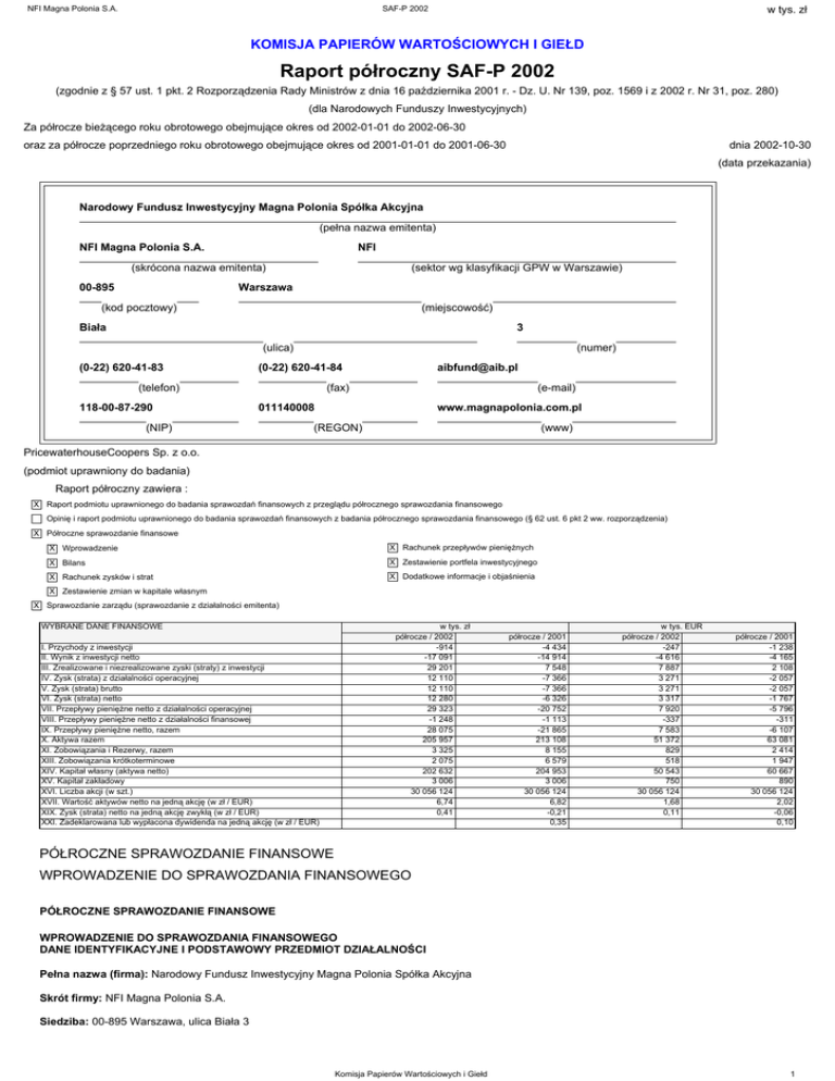 NFI Magna Polonia S.A. w tys. zł SAF-P 2002 KOMISJA PAPIERÓW WARTOŚCIOWYCH I GIEŁD Raport półroczny SAF-P 2002 (zgodnie z § 57 ust. 1 pkt. 2 Rozporządzenia Rady Ministrów z dnia 16 października 2001 r. - Dz. U. Nr 139, poz. 1569 i z 2002 r. Nr 31, poz. 280) (dla Narodowych Funduszy Inwestycyjnych) Za półrocze bieżącego roku obrotowego obejmujące okres od 2002-01-01 do 2002-06-30 oraz za półrocze poprzedniego roku obrotowego obejmujące okres od 2001-01-01 do 2001-06-30 dnia 2002-10-30 (data przekazania) Narodowy Fundusz Inwestycyjny Magna Polonia Spółka Akcyjna (pełna nazwa emitenta) NFI Magna Polonia S.A. NFI (skrócona nazwa emitenta) 00-895 (sektor wg klasyfikacji GPW w Warszawie) Warszawa (kod pocztowy) (miejscowość) Biała 3 (ulica) (0-22) 620-41-83 (numer) (0-22) 620-41-84 (telefon) 118-00-87-290 [email protected] (fax) (e-mail) 011140008 (NIP) www.magnapolonia.com.pl (REGON) (www) PricewaterhouseCoopers Sp. z o.o. (podmiot uprawniony do badania) Raport półroczny zawiera : X Raport podmiotu uprawnionego do badania sprawozdań finansowych z przeglądu półrocznego sprawozdania finansowego Opinię i raport podmiotu uprawnionego do badania sprawozdań finansowych z badania półrocznego sprawozdania finansowego (§ 62 ust. 6 pkt 2 ww. rozporządzenia) X Półroczne sprawozdanie finansowe X Wprowadzenie X Rachunek przepływów pieniężnych X Bilans X Zestawienie portfela inwestycyjnego X Rachunek zysków i strat X Dodatkowe informacje i objaśnienia X Zestawienie zmian w kapitale własnym X Sprawozdanie zarządu (sprawozdanie z działalności emitenta) WYBRANE DANE FINANSOWE I. Przychody z inwestycji II. Wynik z inwestycji netto III. Zrealizowane i niezrealizowane zyski (straty) z inwestycji IV. Zysk (strata) z działalności operacyjnej V. Zysk (strata) brutto VI. Zysk (strata) netto VII. Przepływy pieniężne netto z działalności operacyjnej VIII. Przepływy pieniężne netto z działalności finansowej IX. Przepływy pieniężne netto, razem X. Aktywa razem XI. Zobowiązania i Rezerwy, razem XIII. Zobowiązania krótkoterminowe XIV. Kapitał własny (aktywa netto) XV. Kapitał zakładowy XVI. Liczba akcji (w szt.) XVII. Wartość aktywów netto na jedną akcję (w zł / EUR) XIX. Zysk (strata) netto na jedną akcję zwykłą (w zł / EUR) XXI. Zadeklarowana lub wypłacona dywidenda na jedną akcję (w zł / EUR) w tys. zł półrocze / 2002 -914 -17 091 29 201 12 110 12 110 12 280 29 323 -1 248 28 075 205 957 3 325 2 075 202 632 3 006 30 056 124 6,74 0,41 półrocze / 2001 -4 434 -14 914 7 548 -7 366 -7 366 -6 326 -20 752 -1 113 -21 865 213 108 8 155 6 579 204 953 3 006 30 056 124 6,82 -0,21 0,35 w tys. EUR półrocze / 2002 -247 -4 616 7 887 3 271 3 271 3 317 7 920 -337 7 583 51 372 829 518 50 543 750 30 056 124 1,68 0,11 półrocze / 2001 -1 238 -4 165 2 108 -2 057 -2 057 -1 767 -5 796 -311 -6 107 63 081 2 414 1 947 60 667 890 30 056 124 2,02 -0,06 0,10 PÓŁROCZNE SPRAWOZDANIE FINANSOWE WPROWADZENIE DO SPRAWOZDANIA FINANSOWEGO PÓŁROCZNE SPRAWOZDANIE FINANSOWE WPROWADZENIE DO SPRAWOZDANIA FINANSOWEGO DANE IDENTYFIKACYJNE I PODSTAWOWY PRZEDMIOT DZIAŁALNOŚCI Pełna nazwa (firma): Narodowy Fundusz Inwestycyjny Magna Polonia Spółka Akcyjna Skrót firmy: NFI Magna Polonia S.A. Siedziba: 00-895 Warszawa, ulica Biała 3 Komisja Papierów Wartościowych i Giełd 1 NFI Magna Polonia S.A. SAF-P 2002 w tys. zł Właściwy sąd rejestrowy: Sąd Rejonowy dla m.st. Warszawy XIX Wydział Gospodarczy Krajowego Rejestru Sądowego Numer rejestru: Rejestru Przedsiębiorców; numer KRS: 0000019740 Firma zarządzająca majątkiem NFI Magna Polonia S.A.: AIB WBK Fund Management Spółka z o.o. Podstawowy przedmiot działalności: Pozostałe pośrednictwo finansowe, gdzie indziej nie sklasyfikowane - Nr PKD 65.23 Z Rynek notowań: Akcje NFI Magna Polonia S.A. są notowane na Giełdzie Papierów Wartościowych w Warszawie na rynku Podstawowym NFI w systemie notowań ciągłych CZAS TRWANIA DZIAŁALNOŚCI FUNDUSZU Ustawa z dnia 30 kwietnia 1993 r. o narodowych funduszach inwestycyjnych i ich prywatyzacji (Dz. U. Nr 44, poz. 202 z późniejszymi zmianami) “Ustawa o NFI”- nie zawiera ograniczeń dotyczących czasu działania NFI. Także Statut Funduszu stanowi, że czas jego trwania jest nieograniczony. Zgodnie ze Statutem NFI Magna Polonia S.A. może po dniu 31 grudnia 2005 r. ulec likwidacji, bądź przekształceniu w spółkę mającą charakter funduszu powierniczego lub innego podobnego funduszu, zgodnie z obowiązującymi przepisami prawa. OKRESY, ZA KTÓRE PREZENTOWANE JEST SPRAWOZDANIE FINANSOWE I PORÓWNYWALNE DANE FINANSOWE Sprawozdanie finansowe Funduszu obejmuje: Bilans, przedstawiający składniki aktywów i pasywów Funduszu na dzień 30 czerwca 2002 r., 31 grudnia 2001 r. oraz 30 czerwca 2001 r. Rachunek zysków i strat przedstawiający przychody i koszty, zyski i straty Funduszu oraz obowiązkowe obciążenia wyniku finansowego za okresy od 1 stycznia 2002 r. do 30 czerwca 2002 r.oraz 1 stycznia 2001 r. do 30 czerwca 2001 r. Zestawienie zmian w kapitale własnym przedstawia zmiany w kapitale własnym Funduszu za okresy od 1 stycznia 2002 r. do 30 czerwca 2002 r., od 1 stycznia 2001 r. do 31 grudnia 2001 r. oraz 1 stycznia 2001 r. do 30 czerwca 2001 r. Rachunek przepływu środków pieniężnych przedstawia wpływy i wydatki środków pieniężnych z działalności operacyjnej i finansowej Funduszu za okresy od 1 stycznia 2002 r. do 30 czerwca 2002 r. oraz 1 stycznia 2001 r. do 30 czerwca 2001 r. Zestawienie portfela inwestycyjnego przedstawia stan inwestycji Funduszu na dzień 30 czerwca 2002 r. Zawarte w zestawieniu dane dotyczące spółek wiodących, zależnych i stowarzyszonych Funduszu pochodzą z niezbadanych sprawozdań finansowych spółek sporządzonych na dzień 30 czerwca 2002 r. Noty objaśniające do bilansu prezentują dane na dzień 30 czerwca 2002 r., 31 grudnia 2001 r. oraz na dzień 30 czerwca 2001 r., pozostałe noty obejmują okresy 