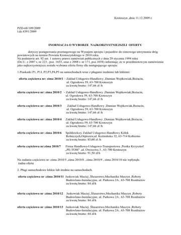 Krotoszyn ,dnia 11.12.2009 r. PZD-68/109/2009 l.dz.4391/2009 INORMACJA O WYBORZE NAJKORZYSTNIEJSZEJ OFERTY dotyczy postępowania przetargowego na Wynajem sprzętu i pojazdów do zimowego utrzymania dróg powiatowych na terenie Powiatu Krotoszyńskiego w 2010 roku. Na podstawie art. 92 ust. 1 ustawy prawo zamówień publicznych z dnia 29 stycznia 1994 roku (Dz.U. z 2007 r, nr 223 , poz. 1655, oraz z 2008 r. nr 171, poz.1058) informuję ,że w przedmiotowym zamówieniu jako najkorzystniejsza została wybrana oferta firmy dla następującego sprzętu: 1.Piaskarki P1, P1J, P2,P3,P4,P5 na samochodach wraz z pługami średnimi lub lekkimi: oferta częściowa nr: zima 2010/1 – Zakład Usługowo-Handlowy ,Damian Wojtkowiak,Bożacin, ul. Ogrodowa 59, 63-700 Krotoszyn za kwotę brutto: 147,66 zł /h oferta częściowa nr: zima 2010/2 - Zakład Usługowo-Handlowy ,Damian Wojtkowiak,Bożacin, ul. Ogrodowa 59, 63-700 Krotoszyn za kwotę brutto: 147,66 zł /h oferta częściowa nr: zima 2010/3 Zakład Usługowo-Handlowy ,Damian Wojtkowiak,Bożacin, ul. Ogrodowa 59, 63-700 Krotoszyn za kwotę brutto: 147,66 zł /h oferta częściowa nr: zima 2010/4 Zakład Usługowo-Handlowy ,Damian Wojtkowiak,Bożacin, ul. Ogrodowa 59, 63-700 Krotoszyn za kwotę brutto: 147,66 zł /h oferta częściowa nr: zima 2010/6 Spółdzielczy Zakład Usługowo-Handlowy Kółek Rolniczych,Orpiszew,ul. Koźmińska 32, 63-714 Kobierno za kwotę brutto: 85,00 zł /h oferta częściowa nr:zima 2010/7 Firma Handlowo-Usługowo-Transportowa ,Pestka Krzysztof „PE-TOM” ,ul. Owocowa 3 , 63-700 Krotoszyn za kwotę brutto: 91,50 zł/h Na zadania częściowe nr :zima 2010/5 ,zima 2010/8 , zima 2010/9 , zima 2010/10 nie wpłynęła żadna oferta 2. Pługi samochodowe lekkie lub średnie na samochodach. oferta częściowa nr :zima 2010/11 Juskowiak Maciej ,Ślusarstwo,Mechanika Maszyn ,Roboty Budowlano-Instalacyjne, ul. Parkowa 2A , 63-708 Rozdrażew za kwotę brutto: 84 zł/h oferta częściowa nr :zima 2010/12 Juskowiak Maciej ,Ślusarstwo,Mechanika Maszyn ,Roboty Budowlano-Instalacyjne, ul. Parkowa 2A , 63-708 Rozdrażew za kwotę brutto: 84 zł/h oferta częściowa nr :zima 2010/13 Juskowiak Maciej ,Ślusarstwo,Mechanika Maszyn ,Roboty Budowlano-Instalacyjne, ul. Parkowa 2A , 63-708 Rozdrażew za kwotę brutto: 84 zł/h oferta częściowa nr :zima 2010/14 Juskowiak Maciej ,Ślusarstwo,Mechanika Maszyn ,Roboty Budowlano-Instalacyjne, ul. Parkowa 2A , 63-708 Rozdrażew za kwotę brutto: 90 zł/h oferta częściowa nr:zima 2010/16 Firma Handlowo-sługowo-Transportowa ,Pestka Krzysztof „PE-TOM” ,ul. Owocowa 3 , 63-700 Krotoszyn za kwotę brutto : 109,80 zł/h oferta częściowa nr:zima 2010/18 Spółdzielczy Zakład Usługowo-Handlowy Kółek Rolniczych,Orpiszew,ul. Koźmińska 32, 63-714 Kobierno za kwotę brutto : 75,00 zł/h Na zadanie częściowe nr: zima 2010/15 , zima 2010/17 , zima 2010/19 ,zima 2010/20 nie wpłynęła żadna oferta. 3.Równiarki drogowe dwulemieszowe oferta częściowa nr :zima 2010/24 Zakład Usługowo-Handlowy Damian Wojtkowiak,Bożacin, ul. Ogrodowa 59, 63-700 Krotoszyn za kwotę brutto: 171,20 zł/h Na zadanie częściowe nr: zima 2010/21 , zima 2010/22 , zima 2010/23 nie wpłynęła żadna ofert 4. Pługi ciągnikowe na ciągnikach oferta częściowa nr: zima 2010/25 Spółdzielnia Kółek Rolniczych w Rozdrażewie ul. Koźmińska 6 , 63-708 Rozdrażew za kwotę brutto: 84,00 zł/h oferta częściowa nr:zima 2010/26 Spółdzielczy Zakład Usług Mechanizacyjnych Kółek Rolniczych,Tomnice, ul. Sportowa 28, 63-714 Kobierno za kwotę brutto: 84,00 zł/h oferta częściowa nr: zima 2010/27 Spóldzielczy Zakład Usługowo Handlowy Kółek Rolniczych,Orpiszew,ul. Koźmińska 32 , 63-714 Kobierno za kwotę brutto: 75,00 zł/h oferta częściowa nr: zima 2010/28 Spółdzielczy Zakład Usług Mechanizacyjnych Kółek Rolniczych,Tomnice,ul. Sportowa 28, 63-714 Kobierno za kwotębrutto: 84,00 zł /h oferta częściowa nr: zima 2010/29 Spółdzielnia Kółek Rolniczych w Rozdrażewie ul. Koźmińska 6 , 63-708 Rozdrażew za kwotę brutto: 84,00 zł/h oferta częściowa nr: zima 2010/30 Spółdzielnia Kółek Rolniczych w Rozdrażewie ul. Koźmińska 6 , 63-708 Rozdrażew za kwotę brutto: 84,00 zł/h oferta częściowa nr: zima 2010/31 Spółdzielczy Zakład Usług Mechanizacyjnych Kółek Rolniczych,Tomnice,ul. Sportowa 28, 63-714 Kobierno za kwotę brutto: 84,00 zł /h oferta częściowa nr : zima 2010/32 Przedsiębiorstwo Produkcyjno Handlowo-Usługowe Henryk Juskowiak,Nowa Wieś 123 , 63-708 Rozdrażew za kwotę brutto: 84,00 zł/h oferta częściowa nr: zima 2010/33 Przedsiębiorstwo Produkcyjno Handlowo-Usługowe Henryk Juskowiak,Nowa Wieś 123 , 63-708 Rozdrażew za kwotę brutto: 84,00 zł/h Na zadanie częściowe nr: zima 2010/34 nie wpłynęła żadna oferta. 5. Pługi odśnieżne średnie na ciągnikach o mocy silnika powyżej 120 KM oferta częściowa nr : zima 2010/37 Zakład Usługowo-Handlowy Damian Wojtkowiak, Bożacin ul. Ogrodowa 59, 63-700 Krotoszyn za kwotę brutto: 171,20 zł /h oferta częściowa nr : zima 2010/38 Zakład Usługowo-Handlowy Damian Wojtkowiak, Bożacin ul. Ogrodowa 59, 63-700 Krotoszyn za kwotę brutto: 171,20 zł /h Na zadanie częściowe nr : zima 2010/35 , zima 2010/36 nie wpłyneła żadna oferta 6. Spycharki gąsienicowe typu DT lub równoważne oferta częściowa nr : zima 2010/39 Przedsiębiorstwo Produkcyjno Handlowo-Usługowe, Henryk Juskowiak,Nowa Wieś 123, 63-708 Rozdrażew za kwotę brutto: 100,00 zł/h oferta częściowa nr : zima 2010/40 Przedsiębiorstwo Produkcyjno Handlowo-Usługowe, Henryk Juskowiak,Nowa Wieś 123, 63-708 Rozdrażew za kwotę brutto: 100,00 zł /h Na zadanie cześciowe nr : zima 2010/41 , zima 2010/42 , zima 2010/43 nie wpłynęła żadna oferta 7. Ładowarki przedsiębierne i podsiębierne do przemieszczania zasp śnieżnych typu Class ,Cat, JCB, Manitou lub równoważne oferta częściowa nr : zima 2010/50 Zakład Usługowo-Handlowy Damian 