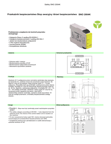Safety SNO 2004K Przekaźnik bezpieczeństwa Stop awaryjny /drzwi bezpieczeństwa SNO 2004K Podstawowe urządzenie do kontroli przycisku awaryjnego • Kategoria Stopu 0 według EN 60204-1 • Kategoria bezpieczeństwa 2 według EN 954-1 • Jedno lub dwukanałowe połączenie • 2 NO wyjścia bezzwłoczne • monitorowanie (EDM) • Kompaktowa obudowa Zadania Schemat przekaźnika • Ochrona osób I maszyn • Monitorowanie przycisku STOP • Monitorowanie wyłączników drzwiowych • Sterowanie stycznikami zasilania Funkcje Wymiary Zasilanie 24 V podłączone przez normalnie zamknięty stop awaryjny do terminala A1, zasilanie wraca lub przechodzi przez terminal A2. Styki K1 oraz K2 są zasilone, kiedy przycisk reset Y1 -- Y2 jest załączony. Wszystkie styki są zamknięte i podtrzymane przez własne kontakty. Kontakty K1 oraz K2 wstrzymuje obwód przycisku reset po ok 20 ms. Zgodnie z sekwencją załączania, 2 kontakty NO (13 -- 14, 23 -- 24) zastają zamknięte. Zasilanie I status wyjść K1 oraz K2 są oznaczone przez zapalenie się dwóch diod LED’s. Jeżeli E-Stop zostanie naciśnięty, zasilanie cewek styczników K1 oraz K2 zostaje przerwane, a kontakty bezpieczeństwa zostają otwarte.. Uwagi • Przycisk E - Stop musi być zamknięty przed naciśnięciem przycisku RESET • The safety category according to EN 954 - 1 also depends from the external circuit, the choice of the control station and is location on the machine. • W celu rozszerzenia liczby wyjść NO, można stosować jednostkę rozszerzającą do przekaźników bezpieczeństwa serii SNE. • Urządzenie powinno być zainstalowane w szafie sterowniczej o ochronie minimum IP 54. Układ podłączenia Safety SNO 2004K Dane techniczne Funkcje według. EN 60204-1 wyświetlanie funkcji wykres funkcji Obwody zasilające Zakres napięcia AC / DC Pobór mocy dla 50 Hz and UN (AC) Pobór mocy UN (DC) Tętnienie szczątkowe Uss Częstotliwość Zakres pracy Obwody sterownicze Rezystancja przewodu A1, A2 oraz Y1 Max impedancja dla przewodu Y1 / Y2 Znamionowe napięcie na Y1 Prąd znamionowy / szczytowy wejście Y2 Czas odpowiedzi tA Czas powrotu tR Minimalny czas przełaczenia tM Obwody wyjściowe Ilość styków Materiał styków Znamionowe napięcie przełaczalne Un Max. wartość prądu przełaczalnego Max. całkowita wartość prądu Kategoria zastosowania według EN 60947-5-1 Ochrona zwarciowa/bezpiecznik Wytrzymałość mechaniczna Dane ogólne Droga upływu I dystans izolacyjny Znamionowa wytrzymałość napięciowa Kategoria przepięciowa Poziom zanieczyszczenia (zewnątrz / wewnątrz) Napięcie pomiarowe Napięcie testowe Ueff 50 Hz Stopień ochrony według DIN EN 60529 (obudowa/terminale) Temperatura otoczenia/ zakres pracy Przekroje przewodów linka/ drut lub linka z tulejką zaciskową. DIN 46228 Max. Moment dokręcania Waga Akcesoria Dopuszczenia Typ / Numery katalogowe Typ SNO 2004K Zasilanie AC/DC 24 V SNO 2004K Urządzenie dla stopu awaryjnego 2 diody LED, zielone FD 0221-6 24 V 1 VA 1W 2,4 V 50 – 60 Hz 0,85 – 1,1 x UN ------≤ 70 Ω DC 24 V 100 mA / 100 mA 20 ms 50 ms 30 ms 2 NO Ag-Alloy AC 230 V / DC 300 V 6A 8A AC-15: Ue 230 V AC, Ie 3 A DC-13: Ue 24 V DC, Ie 3 A max. 6 A gG lub bezpiecznik typu B lub C 7 10 według EN 60664-1 4 kV III 3/2 300 V AC 2 kV IP 40 / IP 20 -25 - +55 °C 2 2 2 x 0,14 – 0,75 mm / 1 x 0,14 – 2,5 mm 2 2 x 0,25 – 0,5 mm / 1 x 0,25 – 2,5 mm 0,5 – 0,6 Nm 0,2 kg --BG, UL, CSA Terminale połączeniowe śrubowe 2 Numer katalogowy R1.188.0410.3 PU 1