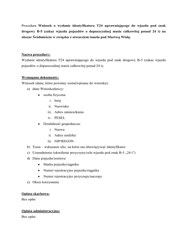 Procedura Wniosek o wydanie identyfikatora T24 uprawniającego do wjazdu pod znak drogowy B-5 (zakaz wjazdu pojazdów o dopuszczalnej masie całkowitej ponad 24 t) na obszar Śródmieścia w związku z otwarciem tunelu pod Martwą Wisłą. Nazwa procedury: Wydanie identyfikatora T24 uprawniającego do wjazdu pod znak drogowy B-5 (zakaz wjazdu pojazdów o dopuszczalnej masie całkowitej ponad 24 t). Wymagane dokumenty: Wniosek (dane, które powinny zostaćwpisane do wniosku): a) dane Wnioskodawcy: osoba fizyczna: i. Imię ii. Nazwisko iii. Adres zamieszkania iv. PESEL Działalność gospodarcza: i. Nazwa ii. Adres siedziby iii. NIP/REGON b) Trasa – wskazanie ulic, na które ma obowiązywać identyfikator c) Uzasadnienie (określenie przyczyny/celu wjazdu pod znak B-5 „24 t”) d) Dane pojazdu/zestawu: Marka pojazdu/ciągnika Numer rejestracyjny pojazdu/ciągnika Numer rejestracyjny przyczepy/naczepy e) Okres korzystania Opłata skarbowa: Bez opłat Opłata administracyjna: Bez opłat ZARZĄD DRÓG I ZIELENI W GDAŃSKU Termin i sposób załatwienia: Nie później niż w terminie jednego miesiąca od dnia złożenia wniosku Miejsce składania dokumentów: Pocztą na adres: Zarząd Dróg i Zieleni w Gdańsku, ul. Partyzantów 36, 80-254 Gdańsk Pocztą elektroniczną: [email protected] [email protected] Bezpośrednio: Siedziba Działu Inżynierii Ruchu Zarządu Dróg i Zieleni w Gdańsku, ul .Wyspiańskiego 9A, 80432 Gdańsk poniedziałek – piątek 7:00 – 15:00 Dział Prowadzący sprawę Dział Inżynierii Ruchu u. Wyspiańskiego 9A, 80-432 Gdańsk I. piętro Tryb odwoławczy: - Podstawa prawna: Ustawa z dnia 21 marca 1985 roku o drogach publicznych (tj. Dz. U. z 2007 roku, Nr 19, poz. 115 z późn. zm.) Dodatkowe informacje: - Formularze do pobrania: xxxxx