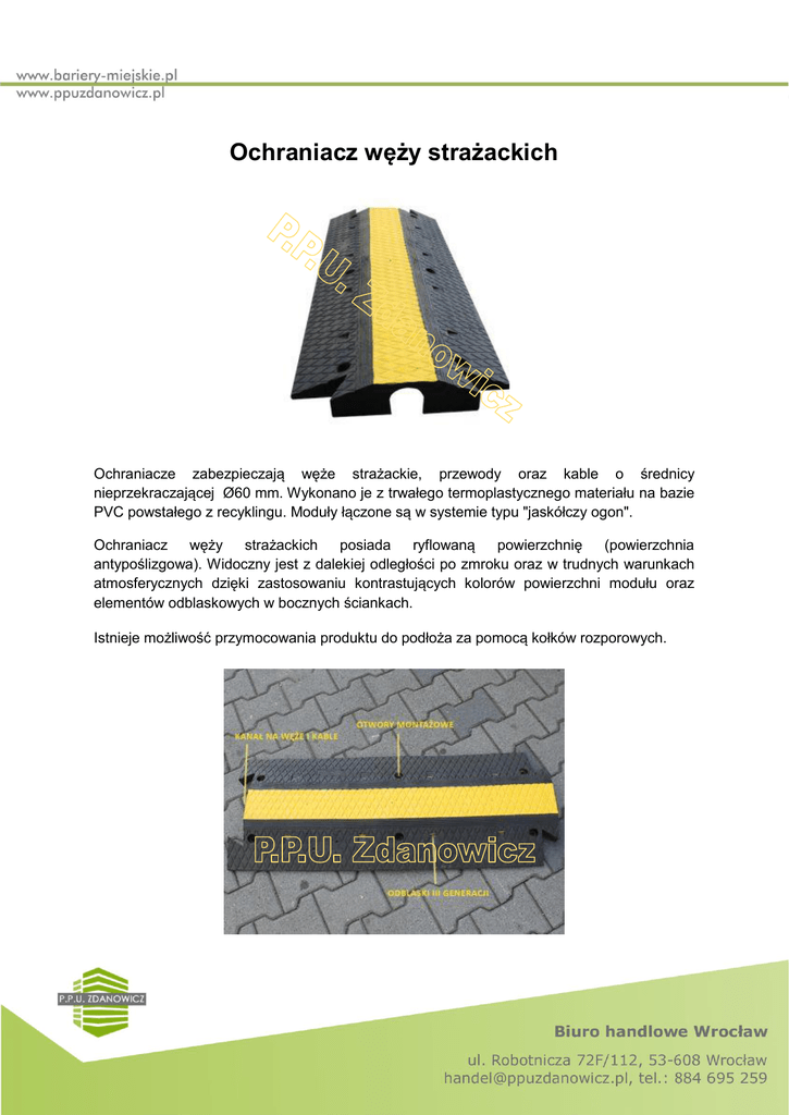 Ochraniacz węży strażackich Ochraniacze zabezpieczają węże strażackie, przewody oraz kable o średnicy nieprzekraczającej Ø60 mm. Wykonano je z trwałego termoplastycznego materiału na bazie PVC powstałego z recyklingu. Moduły łączone są w systemie typu "jaskółczy ogon". Ochraniacz węży strażackich posiada ryflowaną powierzchnię (powierzchnia antypoślizgowa). Widoczny jest z dalekiej odległości po zmroku oraz w trudnych warunkach atmosferycznych dzięki zastosowaniu kontrastujących kolorów powierzchni modułu oraz elementów odblaskowych w bocznych ściankach. Istnieje możliwość przymocowania produktu do podłoża za pomocą kołków rozporowych. Parametry techniczne: - Ochraniacz kablowy wykonany został z trwałego termoplastycznego materiału powstałego na bazie PVC - Łączenie w systemie typu "jaskółczy ogon" - Wymiary: 400 x 1000 x 80 mm - Wielkości otworu znajdującego się w spodniej części modułu: Ø60 mm - Elementy odblaskowe zastosowano w bocznych ściankach progu - Ochraniacz posiada ryflowaną (antypoślizgową) powierzchnię Nr katalogowy OWS KKX-14 Produkt Ochraniacz węży strażackich Zestaw montażowy: kołek rozporowy + wkręt + podkładka Waga (kg) 19 - * W przypadku większych zamówień udzielamy korzystnych rabatów! Cena netto* 110 zł 1,3 zł