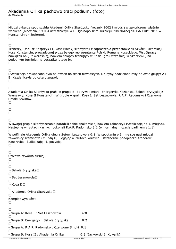 Miejskie Centrum Sportu i Rekreacji w Skarżysku-Kamiennej Akademia Orlika pechowo traci podium. (foto) 20.06.2011. Młodzi piłkarze spod szyldu Akademii Orlika Skarżysko (rocznik 2002 i młodsi) w zakończony właśnie weekend (niedziela, 19.06) uczestniczyli w II Ogólnopolskim Turnieju Piłki Nożnej "KOSA CUP" 2011 w Konstancinie - Jeziornej. Trenerzy, Dariusz Kasprzyk i Łukasz Białek, skorzystali z zaproszenia przedstawicieli Szkółki Piłkarskiej Kosa Konstancin, prowadzonej przez byłego reprezentanta Polski, Romana Koseckiego. Współpracę nawiązali oni już wcześniej, bowiem chłopcy trenujący w Kosie, grali wcześniej w Skarżysku, na podobnym turnieju, na początku lutego br. Rywalizacja prowadzona była na dwóch boiskach trawiastych. Drużyny podzielone były na dwie grupy: A i B. Każda liczyła po cztery zespoły. Akademia Orlika Skarżysko grała w grupie B. Za rywali miała: Energetyka Kozienice, Szkołę Brytyjską z Warszawy, Kosa II Konstancin. W grupie A grali: Kosa I, Set Lesznowola, R.A.P. Radomsko i Czerwone Smoki Brwinów. W swojej grupie skarżyszczanie poradzili sobie znakomicie, bowiem zakończyli rywalizację na 1. miejscu. Następnie w rzutach karnych pokonali R.A.P. Radomsko 3:1 (w normalnym czasie padł remis 1:1). W półfinale Akademia Orlika uległa Setowi Lesznowola 0:1. W spotkaniu o 3. miejsce nasi młodzi zawodnicy zremisowali z Kosą II, ulegając w rzutach karnych. Ostatecznie podopieczni trenerów Kasprzyka i Białka zajęli 4. pozycję. Czołowa czwórka turnieju: - Szkoła Brytyjska - Set Lesznowola - Kosa II - Akademia Orlika Skarżysko Komplet wyników: - Grupa - Grupa - Grupa - Grupa A: Kosa I : Set Lesznowola 4:0 B: Energetyk : Szkoła Brytyjska 0:2 A: R.A.P. Radomsko : Czerwone Smoki 0:1 B: Kosa II : Akademia Orlika http://mcsir.skarzysko.pl 0:3 (Jackowski 2, Kowalik) Kreator PDF Utworzono 8 March, 2017, 01:57 Miejskie Centrum Sportu i Rekreacji w Skarżysku-Kamiennej - Grupa - Grupa - Grupa - Grupa - Grupa - Grupa - Grupa - Grupa A1 A4 A2 A3 A: Kosa I : Czerwone Smoki 1:0 B: Energetyk : Akademia Orlika 1:1 (Jackowski) A: Set Lesznowola : R.A.P. Radomsko 4:0 B: Szkoła Brytyjska : Kosa II 3:0 A: Kosa I : R.A.P. Radomsko 8:0 B: Energetyk : Kosa II 2:1 A: Set Lesznowola : Czerwone Smoki 0:0 B: Szkoła Brytyjska : Akademia Orlika 0:1 (Jackowski) - B4: Kosa I : Kosa II 1:3 - B1: R.A.P. Radomsko : Akademia Orlika 1:1 (Kowalik) rz.k. 1:3 (Jeleń, Jackowski, Walkowiak) - B3: Set : Energetyk 2:1 - B2: Czerwone Smoki : Szkoła Brytyjska 2:3 - Kosa II : Szkoła Brytyjska 0:1 - Akademia Orlika : Set 0:1 mecz o III miejsce - Kosa II : Akademia Orlika 0:0 rz. k. 4:3 mecz o I miejsce - Szkoła Brytyjska : Set 1:0 Fotorelacja: http://mcsir.skarzysko.pl Kreator PDF Utworzono 8 March, 2017, 01:57 Miejskie Centrum Sportu i Rekreacji w Skarżysku-Kamiennej http://mcsir.skarzysko.pl Kreator PDF Utworzono 8 March, 2017, 01:57