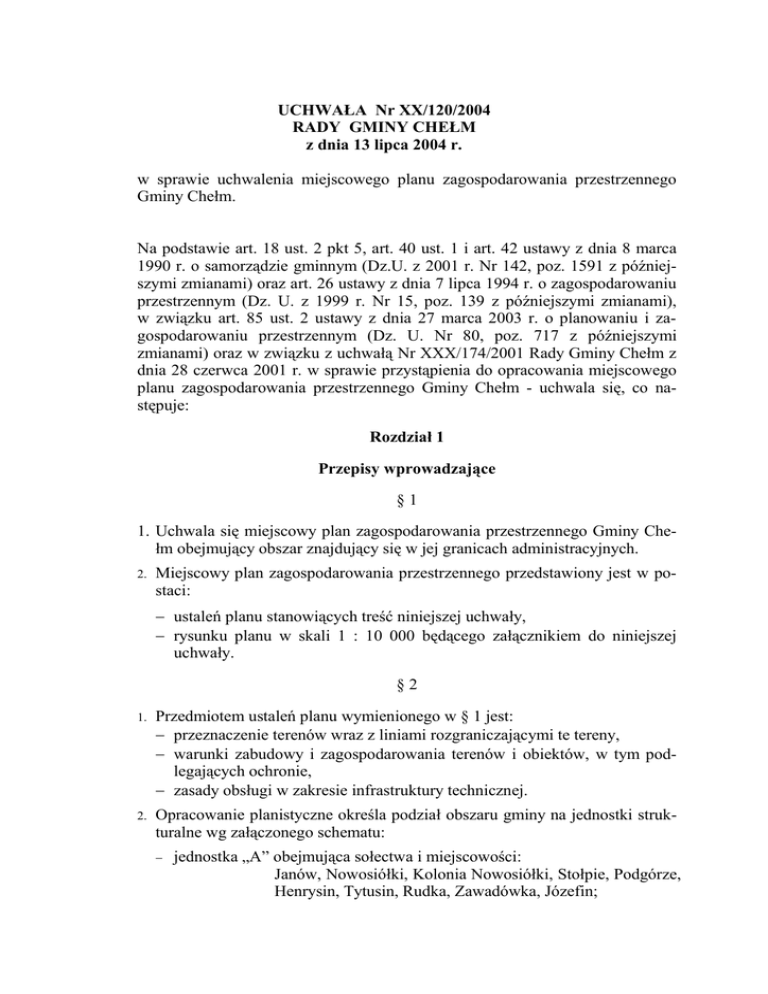 UCHWAŁA Nr XX/120/2004 RADY GMINY CHEŁM z dnia 13 lipca 2004 r. w sprawie uchwalenia miejscowego planu zagospodarowania przestrzennego Gminy Chełm. Na podstawie art. 18 ust. 2 pkt 5, art. 40 ust. 1 i art. 42 ustawy z dnia 8 marca 1990 r. o samorządzie gminnym (Dz.U. z 2001 r. Nr 142, poz. 1591 z późniejszymi zmianami) oraz art. 26 ustawy z dnia 7 lipca 1994 r. o zagospodarowaniu przestrzennym (Dz. U. z 1999 r. Nr 15, poz. 139 z późniejszymi zmianami), w związku art. 85 ust. 2 ustawy z dnia 27 marca 2003 r. o planowaniu i zagospodarowaniu przestrzennym (Dz. U. Nr 80, poz. 717 z późniejszymi zmianami) oraz w związku z uchwałą Nr XXX/174/2001 Rady Gminy Chełm z dnia 28 czerwca 2001 r. w sprawie przystąpienia do opracowania miejscowego planu zagospodarowania przestrzennego Gminy Chełm - uchwala się, co następuje: Rozdział 1 Przepisy wprowadzające §1 1. Uchwala się miejscowy plan zagospodarowania przestrzennego Gminy Chełm obejmujący obszar znajdujący się w jej granicach administracyjnych. 2. Miejscowy plan zagospodarowania przestrzennego przedstawiony jest w postaci: − ustaleń planu stanowiących treść niniejszej uchwały, − rysunku planu w skali 1 : 10 000 będącego załącznikiem do niniejszej uchwały. §2 1. Przedmiotem ustaleń planu wymienionego w § 1 jest: − przeznaczenie terenów wraz z liniami rozgraniczającymi te tereny, − warunki zabudowy i zagospodarowania terenów i obiektów, w tym podlegających ochronie, − zasady obsługi w zakresie infrastruktury technicznej. 2. Opracowanie planistyczne określa podział obszaru gminy na jednostki strukturalne wg załączonego schematu: − jednostka „A” obejmująca sołectwa i miejscowości: Janów, Nowosiółki, Kolonia Nowosiółki, Stołpie, Podgórze, Henrysin, Tytusin, Rudka, Zawadówka, Józefin; − jednostka „B” obejmująca sołectwa i miejscowości: Staw, Kolonia Staw, Kolonia Ochoża, Horodyszcze, Kolonia Horodyszcze, Parypse; − jednostka „C” obejmująca sołectwa i miejscowości: Okszów, Okszów Kolonia, Srebrzyszcze, Antonin, Wólka Czułczycka, Zarzecze, Stańków, Nowiny, Koza Gotówka; − jednostka „D” obejmująca sołectwa i miejscowości: Pokrówka, Kolonia Pokrówka, Strupin Mały, Strupin Duży, Strupin Łanowy, Żółtańce, Kolonia Żółtańce, Weremowice, Zawadówka; − jednostka „E” obejmująca sołectwa i miejscowości: Rożdżałów, Kolonia Rożdżałów, Depułtycze Nowe, Depułtycze Stare, Depułtycze Królewskie, Kolonia Depułtycze Królewskie, Zagroda, Ludwinów, Uher, Wojniaki, Kolonia Krzywice, Krzywice; 3. Określa się generalne zasady kompozycji przestrzennej obszaru gminy: − zrównoważony rozwój obszarów wiejskich z koncentracją w sołectwach: Pokrówka, Okszów - Srebrzyszcze, Staw, Janów - Nowosiółki - docelowa liczba ludności gminy ok. 13 000 mieszkańców ± 5 %, − rolnictwo - sfera produkcji żywności dla m. Chełma z wykorzystaniem podstawowego bogactwa gminy jakim są dobre gleby, przekształcanie rolnictwa ze stopniową zmianą na zrównoważone, biodynamiczne i ekologiczne uprawy, − obsługa międzynarodowego przejścia granicznego w Dorohusku z wykorzystaniem dobrego położenia i powiązań komunikacyjnych drogowo kolejowych dla ruchu lokalnego, jak i tranzytowego, poprzez tworzenie nowych obszarów o odpowiednich standardach - zarówno w sferze obsługi ludności, jak i ochrony naturalnego środowiska, − podniesienie standardu życia mieszkańców poprzez wprowadzanie ekoturystyki i agroturystyki szczególnie w sąsiedztwie rezerwatów „Bagno Serebryskie”, „Brzeźno i „Torfowisko Sobowice”. 2 Rozdział 2 Ustalenia ogólne §3 Środowisko przyrodnicze 1. Obszary i obiekty objęte ochroną prawną: 1) Chełmski Park Krajobrazowy (ChPK) utworzony Uchwałą Wojewódzkiej Rady Narodowej w Chełmie Nr XVIII/89/83 z dnia 28 marca 1983 r. w sprawie ustanowienia parków krajobrazowych i obszarów chronionego krajobrazu na terenie województwa chełmskiego (Dz. Urz. WRN Nr 4 poz. 24, Dz. Urz. Woj. Chełmskiego z 1985 r. Nr 3 poz. 62, z 1995 r. Nr 2 poz. 9); a) zakazy obowiązujące na terenie Parku ustala rozporządzeniem Nr 17 Wojewody Lubelskiego z dnia 25 marca 2003 r. w sprawie Chełm- skiego Parku Krajobrazowego (Dz. Urz. Woj. Lubelskiego Nr 39, poz. 1222, zmiana Nr 19, poz. 3732 z dnia 9 grudnia 2003 r.). Park na terenie gminy Chełm zajmuje powierzchnię 4702 ha. Zmiana rozporządzenia w sprawie Chełmskiego Parku Krajobrazowego podyktowana została powiększeniem Chełmskiego Parku Krajobrazowego oraz jego otuliny - zgodnie z 5 rozporządzenia, w Parku zabrania się: −lokalizacji budownictwa letniskowego poza miejscami wyznaczonymi w miejscowym planie zagospodarowania przestrzennego, −dokonywania zmian stosunków wodnych, jeżeli służą innym celom niż ochrona przyrody i zrównoważone wykorzystanie użytków rolnych i leśnych oraz gospodarki rybackiej, −likwidowania małych zbiorników wodnych, starorzeczy oraz obszarów wodno - błotnych, −wylewania gnojowicy, z wyjątkiem nawożenia własnych gruntów rolnych, −lokalizacji ośrodków chowu, hodowli - posługujących się metodą bezściołową, −organizowania rajdów motorowych i samochodowych, −umieszczania tablic reklamowych poza obszarami zabudowanymi, −umyślnego zabijania dziko żyjących zwierząt, niszczenia nor, lęgowisk zwierzęcych, tarlisk i złożonej ikry, ptasich gniazd oraz wybieranai jaj, −wypalania roślinności i pozostałości roślinnych, −wydobywania skał, minerałów i torfu oraz niszczenia gleby, −wykonywania prac ziemnych trwale zniekształcających rzeźbę terenu, z wyjątkiem obiektów związanych z zabezpieczeniem przeciwpowodziowym, −używania łodzi motorowych na otwartych zbiornikach wodnych; 3 b) ustalenia Planu ochrony Chełmskiego Parku Krajobrazowego zawarte są w rozporządzeniu Nr 77 Wojewody Lubelskiego z dnia 28 listopada 2003 r. w sprawie ustanowienia planu ochrony Chełmskiego 