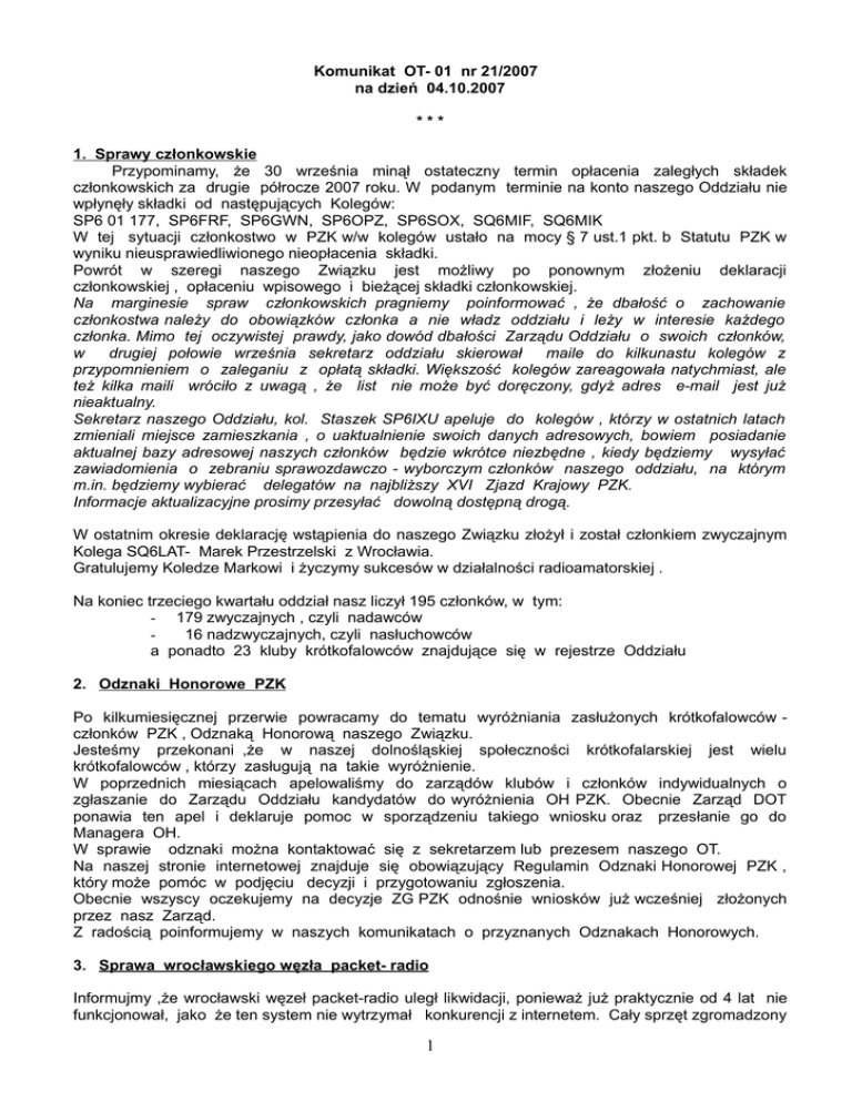 Komunikat OT- 01 nr 21/2007 na dzień 04.10.2007 *** 1. Sprawy członkowskie Przypominamy, że 30 września minął ostateczny termin opłacenia zaległych składek członkowskich za drugie półrocze 2007 roku. W podanym terminie na konto naszego Oddziału nie wpłynęły składki od następujących Kolegów: SP6 01 177, SP6FRF, SP6GWN, SP6OPZ, SP6SOX, SQ6MIF, SQ6MIK W tej sytuacji członkostwo w PZK w/w kolegów ustało na mocy § 7 ust.1 pkt. b Statutu PZK w wyniku nieusprawiedliwionego nieopłacenia składki. Powrót w szeregi naszego Związku jest możliwy po ponownym złożeniu deklaracji członkowskiej , opłaceniu wpisowego i bieżącej składki członkowskiej. Na marginesie spraw członkowskich pragniemy poinformować , że dbałość o zachowanie członkostwa należy do obowiązków członka a nie władz oddziału i leży w interesie każdego członka. Mimo tej oczywistej prawdy, jako dowód dbałości Zarządu Oddziału o swoich członków, w drugiej połowie września sekretarz oddziału skierował maile do kilkunastu kolegów z przypomnieniem o zaleganiu z opłatą składki. Większość kolegów zareagowała natychmiast, ale też kilka maili wróciło z uwagą , że list nie może być doręczony, gdyż adres e-mail jest już nieaktualny. Sekretarz naszego Oddziału, kol. Staszek SP6IXU apeluje do kolegów , którzy w ostatnich latach zmieniali miejsce zamieszkania , o uaktualnienie swoich danych adresowych, bowiem posiadanie aktualnej bazy adresowej naszych członków będzie wkrótce niezbędne , kiedy będziemy wysyłać zawiadomienia o zebraniu sprawozdawczo - wyborczym członków naszego oddziału, na którym m.in. będziemy wybierać delegatów na najbliższy XVI Zjazd Krajowy PZK. Informacje aktualizacyjne prosimy przesyłać dowolną dostępną drogą. W ostatnim okresie deklarację wstąpienia do naszego Związku złożył i został członkiem zwyczajnym Kolega SQ6LAT- Marek Przestrzelski z Wrocławia. Gratulujemy Koledze Markowi i życzymy sukcesów w działalności radioamatorskiej . Na koniec trzeciego kwartału oddział nasz liczył 195 członków, w tym: - 179 zwyczajnych , czyli nadawców 16 nadzwyczajnych, czyli nasłuchowców a ponadto 23 kluby krótkofalowców znajdujące się w rejestrze Oddziału 2. Odznaki Honorowe PZK Po kilkumiesięcznej przerwie powracamy do tematu wyróżniania zasłużonych krótkofalowców członków PZK , Odznaką Honorową naszego Związku. Jesteśmy przekonani ,że w naszej dolnośląskiej społeczności krótkofalarskiej jest wielu krótkofalowców , którzy zasługują na takie wyróżnienie. W poprzednich miesiącach apelowaliśmy do zarządów klubów i członków indywidualnych o zgłaszanie do Zarządu Oddziału kandydatów do wyróżnienia OH PZK. Obecnie Zarząd DOT ponawia ten apel i deklaruje pomoc w sporządzeniu takiego wniosku oraz przesłanie go do Managera OH. W sprawie odznaki można kontaktować się z sekretarzem lub prezesem naszego OT. Na naszej stronie internetowej znajduje się obowiązujący Regulamin Odznaki Honorowej PZK , który może pomóc w podjęciu decyzji i przygotowaniu zgłoszenia. Obecnie wszyscy oczekujemy na decyzje ZG PZK odnośnie wniosków już wcześniej złożonych przez nasz Zarząd. Z radością poinformujemy w naszych komunikatach o przyznanych Odznakach Honorowych. 3. Sprawa wrocławskiego węzła packet- radio Informujmy ,że wrocławski węzeł packet-radio uległ likwidacji, ponieważ już praktycznie od 4 lat nie funkcjonował, jako że ten system nie wytrzymał konkurencji z internetem. Cały sprzęt zgromadzony 1 w pomieszczeniu węzła w obiekcie OC przy ul. Odkrywców we Wrocławiu musiał zostać stamtąd zabrany i przewieziony do siedziby oddziału. Dziękujemy kolegom : Leszkowi SQ6F/SP6FBD/ i Wiesławowi SP6VXO, którzy odpowiedzieli na nasz apel i walnie przyczynili się do podjęcia decyzji co do przydatności i dalszych losów tego sprzętu. Niestety nie udało się ustalić właścicieli większości sprzętu , więc wydzielono sprzęt będący na stanie Oddziału a pozostały sprzęt ,przedstawiający niewielką wartość rynkową , postanowiono zaoferować działającym jeszcze w SP węzłom P-R lub Polskiej Grupie APRS. Sprzęt ten to modem BAYCOM , monitory, komputery i inne akcesoria z lat 90-ch , przestarzałe technicznie i o nieznanej sprawności technicznej. Mimo tego sprzęt ten może przedstawiać wartość szkoleniową dla klubów , dlatego też prosimy kluby zainteresowane tym sprzętem o kontakt z naszym Oddziałem. W przypadku braku zainteresowania tym sprzętem będzie on poddany utylizacji. Kluby i innych członków PZK, chętnych do wybrania z tych zasobów podzespołów przydatnych na swoje potrzeby , zapraszamy do naszego oddziału w najbliższy piątek od godz. 17.00 . Będzie można nieodpłatnie wybrać sobie przydany sprzęt. Pozostałość będzie wystawiona na najbliższej giełdzie DOT w niedzielę 7 października również do pobrania. 4. Strona internetowa DOT Ostatnio na naszej stronie internetowej zostały zamieszczone podstawowe dokumenty obowiązujące w PZK – statut i regulaminy, a także akty prawne dotyczące krótkofalarstwa. W najbliższym czasie na tej stronie podane będą linki do innych aktów prawnych związanych z naszym hobby. Zapraszamy wszystkich do współredagowania tej strony i przysyłania uwag oraz materiałów do zamieszczania na niej. Powyższe należy kierować na adres e-mail Sekretarza Zarządu , kol. Staszka SP6IXU : [email protected] 5. Kurs przygotowawczy do egzaminu na Świadectwo Operatora Jak już zapowiadaliśmy po majowym egzaminie na Świadectwo Operatora przeprowadzonym na zakończenie poprzedniego kursu , od miesiąca października chcemy rozpocząć w klubie SP6PRT we Wrocławiu kolejny kurs przygotowawczy do egzaminu na Świadectwo Operatora w służbie radiokomunikacyjnej amatorskiej. Kurs rozpoczniemy po zebraniu kilku chętnych do szkolenia. Na chętnych oczekujemy w piątki w godz. 17-19 w sie