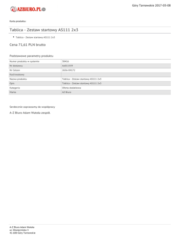 Góry Tarnowskie 2017-03-08 Karta produktu: Tablica - Zestaw startowy AS111 2x3 Tablica - Zestaw startowy AS111 2x3 Cena 71,61 PLN brutto Podstawowe parametry produktu Numer produktu w systemie 38416 Nr dostawcy Az011559 Nr Celcen 2656-04172 Kod kreskowy Nazwa produktu Tablica - Zestaw startowy AS111 2x3 Opis Tablica - Zestaw startowy AS111 2x3 Kategoria Oferta dodatkowa Marka AZ Biuro Serdecznie zapraszamy do współpracy A-Z Biuro Adam Watoła zespół. A-Z Biuro Adam Watoła ul. Oświęcimska 3 41-600 Góry Tarnowskie