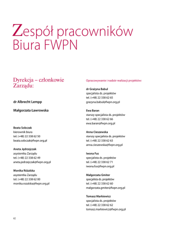 Zespół pracowników Biura FWPN Dyrekcja – członkowie Zarządu: dr Albrecht Lempp Małgorzata Ławrowska Beata Sobczak kierownik biura tel. (+48) 22 338 62 50 [email protected] Aneta Jędrzejczak asystentka Zarządu tel. (+48) 22 338 62 49 [email protected] Monika Różalska asystentka Zarządu tel. (+48) 22 338 62 00 [email protected] Opracowywanie i nadzór realizacji projektów: dr Grażyna Babul specjalista ds. projektów tel. (+48) 22 338 62 65 [email protected] Ewa Baran starszy specjalista ds. projektów tel. (+48) 22 338 62 66 [email protected] Anna Cieszewska starszy specjalista ds. projektów tel. (+48) 22 338 62 63 [email protected] Iwona Fus specjalista ds. projektów tel. (+48) 22 338 62 71 [email protected] Małgorzata Gmiter specjalista ds. projektów tel. (+48) 22 338 62 60 [email protected] Tomasz Markiewicz specjalista ds. projektów tel. (+48) 22 338 62 62 [email protected] 82 Izabella Sulik specjalista ds. projektów tel. (+48) 22 338 62 58 [email protected] Księgowość: Jerzy Gajos główny księgowy tel. (+48) 22 338 62 56 [email protected] Elżbieta Gemeier zastępca głównego księgowego tel. (+48) 22 338 62 21 [email protected] System komputerowy: Janusz Rolecki administrator komputerowego systemu informacyjnego tel. (+48) 22 338 62 68 [email protected] Projekty w dziedzinie mediów: Obsługa Centrum Konferencyjnego: Marcin Szota zarządzający Centrum Konferencyjnym tel. (+48) 22 338 62 70 [email protected] Katarzyna Opalińska asystentka zarządzającego Centrum Konferencyjnym tel. (+48) 22 338 67 83 [email protected] Magdalena Pawińska asystentka zarządzającego Centrum Konferencyjnym tel. (+48) 338 67 65 [email protected] Obsługa Centrum Zielna: Tadeusz Stolarski specjalista ds. zarządzania infrastrukturą Centrum Zielna tel. (+48) 22 338 62 61 [email protected] Paul-Richard Gromnitza redaktor portali internetowych tel. (+48) 22 338 62 73, [email protected] Barbara Owsiak pełnomocnik ds. Polsko-Niemieckich Dni Mediów tel. (+48) 22 338 67 97 [email protected] Biuro w Berlinie: Wg stanu na grudzień 2010 roku Karoline Gil specjalista ds. projektów tel. (+49) 30 279 08 775 [email protected] Sprawozdanie z działalności FWPN za rok 2010 83