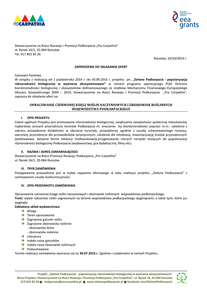 Stowarzyszenie na Rzecz Rozwoju i Promocji Podkarpacia „Pro Carpathia” ul. Rynek 16/1, 35-064 Rzeszów Tel. 017 852 85 26 Rzeszów, 14/10/2014 r. ZAPROSZENIE DO SKŁADANIA OFERT Szanowni Państwo, W związku z realizacją od 1 października 2014 r. do 30.09.2015 r. projektu pn. „Zielone Podkarpacie - popularyzacja różnorodności biologicznej w wymiarze ekosystemowym” w ramach programu operacyjnego PL02 Ochrona bioróżnorodności biologicznej i ekosystemów dofinansowanego ze środków Mechanizmu Finansowego Europejskiego Obszaru Gospodarczego 2009 – 2014, Stowarzyszenie na Rzecz Rozwoju i Promocji Podkarpacia „Pro Carpathia”, zaprasza do składania ofert na: OPRACOWANIE CZERWONEJ KSIĘGI ROŚLIN NACZYNIOWYCH I ZBIOROWISK ROŚLINNYCH WOJEWÓDZTWA PODKARPACKIEGO I. OPIS PROJEKTU Celem ogólnym Projektu jest promowanie różnorodności biologicznej, zwiększenia świadomości społecznej mieszkańców najbardziej cennych przyrodniczo terenów Podkarpacia nt. znaczenia tej bioróżnorodności poprzez m.in.: szkolenia z zakresu prowadzenia działalności w obszarze turystyki, prowadzonej zgodnie z zasadą zrównoważonego rozwoju, warsztaty przyrodnicze dla przewodników turystycznych, szkolenia dla młodzieży, inwentaryzację ścieżek przyrodniczych (podstawowa, aktywna forma edukacji środowiskowej),przygotowanie różnych narzędzi służących do popularyzacji różnorodności biologicznej Podkarpacia (wydawnictwa, gra dydaktyczna, filmy etc). II. NAZWA I ADRES ZAMAWIAJĄCEGO Stowarzyszenie na Rzecz Promocji Rozwoju Podkarpacia „Pro Carpathia” ul. Rynek 16/1, 35-064 Rzeszów III. TRYB ZAMÓWIENIA Postępowanie prowadzone jest w trybie zapytania ofertowego w toku realizacji projektu „Zielone Podkarpacie” z zachowaniem zasady konkurencyjności. IV. OPIS PRZEDMIOTU ZAMÓWIENIA Opracowanie czerwonej księgi roślin naczyniowych i zbiorowisk roślinnych województwa podkarpackiego. Treść: wybór taksonów roślin zagrożonych na terenie województwa podkarpackiego wyginięciem, a także tych, które już wyginęły. Zakładany układ wydawnictwa: Wstęp Teren opracowania Zagrożone gatunki roślin Zagrożone zbiorowiska roślinne - zbiorowiska leśne - zbiorowiska nieleśne Literatura Indeks nazw gatunków Indeks nazw zbiorowisk roślinnych Podsumowanie Termin realizacji zamówienia wyznacza się na 30.07.2015 r. Zgodnie z ustaleniami w ramach Projektu. Projekt: „Zielone Podkarpacie - popularyzacja różnorodności biologicznej w wymiarze ekosystemowym” Biuro Projektu: Stowarzyszenie na Rzecz Rozwoju i Promocji Podkarpacia „Pro Carpathia”; ul. Rynek 16, 35-064 Rzeszów (17) 852 85 26 [email protected] www.zielonepodkarpacie.pl facebook.com/ZielonePodkarpacie V. WARUNKI UDZIAŁU W POSTĘPOWANIU Wykonawcy ubiegający się o zamówienie muszą w szczególności: posiadać doświadczenie w/w zakresie wykonać zadanie osobiście / w Zespole Eksperckim Ocena spełniania przedstawionych powyżej warunków zostanie dokonana według formuły: „spełnia - nie spełnia”. Zleceniobiorca, który nie spełni któregokolwiek z warunków zostanie odrzucony w postępowaniu. VI. DODATKOWE INFORMACJE Ze względu na złożoność zadania, jego stopień trudności oraz wielkość obszaru jaki obejmuje działanie dopuszcza się aby oferta była złożona przez Zespół Ekspercki. 2. Przy opcji pracy w Zespole Eksperckim szczegółowe warunki (w tym honorarium poszczególnych członków Zespołu Eksperckiego) będą uwzględnione w zawartej umowie. 1. VII. KRYTERIA OCENY OFERT 1. Zamawiający oceni i porówna jedynie te oferty, które nie zostały odrzucone 2. Oferty zostaną ocenione przez Zamawiającego w oparciu o kryterium Kryterium Cena ofertowa Waga 100 VIII. FINANSOWANIE: Niniejszy projekt jest dofinansowany ze środków Mechanizmu Finansowego Europejskiego Obszaru Gospodarczego 2009 – 2014 IX. WYKAZ ZAŁĄCZNIKÓW: Oznaczenie załącznika Załącznik nr 1 Nazwa załącznika Wzór Formularza Oferty X. DODATKOWE WARUNKI 1. Ocena ofert zostanie dokonana w dniu 21/10/2014 r., Pro Carpathia zastrzega sobie kontakt tylko z wybranym ekspertem/ekspertami. 2. Oferty złożone po terminie nie będą rozpatrywane. 3. Oferent może przed upływem terminu składania ofert zmienić lub wycofać swoją ofertę. 4. W toku badania i oceny ofert Zamawiający może żądać od oferentów wyjaśnień dotyczących treści złożonych ofert. Ofertę prosimy przesyłać/dostarczać, na otrzymanym formularzu zapytania ofertowego, faksem, drogą elektroniczną lub osobiście do Biura Projektu przy ul. Rynek 16/1, 35-064 Rzeszów z własnoręcznym podpisem do dnia 20/10/2014 r. do godziny 15:00. Projekt: „Zielone Podkarpacie - popularyzacja różnorodności biologicznej w wymiarze ekosystemowym” Biuro Projektu: Stowarzyszenie na Rzecz Rozwoju i Promocji Podkarpacia „Pro Carpathia”; ul. Rynek 16, 35-064 Rzeszów (17) 852 85 26 [email protected] www.zielonepodkarpacie.pl facebook.com/ZielonePodkarpacie ZAŁĄCZNIK NR 1 DO ZAPYTANIA OFERTOWEGO – WZÓR FORMULARZA OFERTY OPRACOWANIE CZERWONEJ KSIĘGI ROŚLIN NACZYNIOWYCH I ZBIOROWISK ROŚLINNYCH WOJEWÓDZTWA PODKARPACKIEGO 1. Zamawiający Stowarzyszenie na Rzecz Promocji Rozwoju Podkarpacia „Pro Carpathia”; ul. Rynek 16/1, 35-064 Rzeszów 2. Wykonawca Niniejsza oferta zostaje złożona przez: Imię i Nazwisko/ Zespół Ekspercki Nazwa firmy Nr(y) telefonu Adres(y) e-mail Lp. 1. Nazwa produktu/usługi Opracowanie czerwonej księgi roślin naczyniowych i zbiorowisk roślinnych w województwie podkarpackim: Wstęp Teren opracowania Zagrożone gatunki roślin Zagrożone zbiorowiska roślinne - zbiorowiska leśne - zbiorowiska nieleśne Indeks nazw gatunków roślin i zbiorowisk roślinnych Podsumowanie Literatura Jedn. miary Termin wykonania zadania 1 kpl 30/07/2015 r. Cena PLN (brutto wraz z narzutami) TAK/NIE Czy posiada Pani/Pan wykształcenie kierunkowe Czy posiada Pani/Pan doświadczenie w w/w zakresie Dorobek naukowy w postaci pub