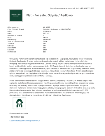 [email protected] tel.:+48 883 775 100 Flat - For sale, Gdynia / Redłowo Offer number City, District, Street Price Area Number of rooms Floor Ownership Year of construction Terrace Garage Basement Kitchen Furnished WL0387 Gdynia / Redłowo, ul. LEGIONÓW 950000 zł 105 m2 4 16/16 Własność 2006 tak tak tak brak tak Oferujemy Państwu mieszkanie znajdujące się na ostatnim- 16 piętrze, najwyższej wieży inwestycji Kaskada Redłowska. Z okien roztacza się zapierający dech widok, na tętniącą życiem Gdynię, Półwysep Helski oraz Wzgórza Morenowe. Osiedle tworzy zespół czterech budynków mieszkalnych, każdy o różnej ilości pięter, usytuowany między Al. Zwycięstwa, ul. Lutycką, ul. Legionów oraz ul. Redłowską. Niewątpliwym atutem inwestycji jest lokalizacja. Do centrum Gdyni mamy zaledwie 5 min, plaża i morze są w zasięgu krótkiego spaceru, a największe centrum handlowe Riviera oddalone jest tylko o niespełna 1 km. Wyjątkowa lokalizacja, która pozwoli na wygodne życie aktywnych zawodowo osób, szukających jednocześnie komfortu i spokoju. Serce apartamentu tworzy salon, z wyjściem na balkon, połączony z kuchnią. W dalszej części trzy sypialnie, dwie łazienki oraz przestronny hol. Ekspozycja okien na zachód i północ, ekspozycja tarasu od strony zachodniej. Mieszkanie zaprojektowane z myślą o najwyższym komforcie. Wszystkie elementy wykonano z materiałów najwyższej jakości, w najlepszym, pełnym dyskretnej elegancji stylu. Do mieszkania przynależą dwa miejsca postojowe w hali garażowej (dodatkowo płatne 25.000 pln/każde) oraz dwie komórki lokatorskie. Przedstawiona oferta ma charakter informacyjny, nie stanowi oferty handlowej w rozumieniu Art. 66 par. 1 Kodeksu Cywilnego. Katarzyna Osiecimska +48 883 919 100 [email protected]