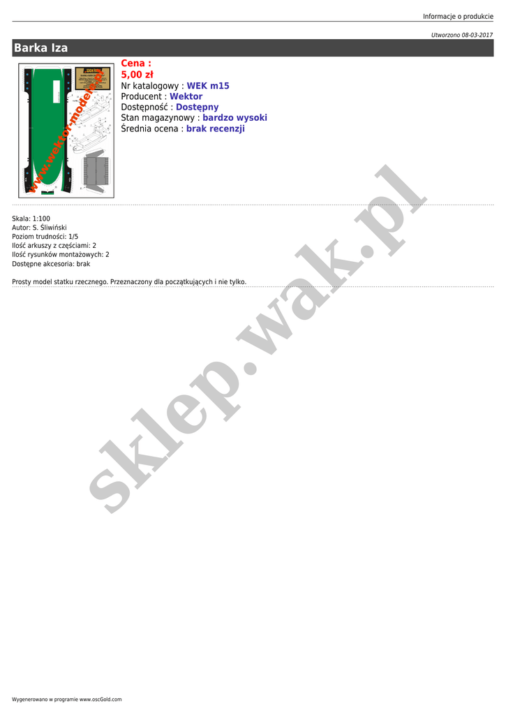 Informacje o produkcie Utworzono 08-03-2017 Barka Iza Cena : 5,00 zł pl Nr katalogowy : WEK m15 Producent : Wektor Dostępność : Dostępny Stan magazynowy : bardzo wysoki Średnia ocena : brak recenzji w ak . Skala: 1:100 Autor: S. Śliwiński Poziom trudności: 1/5 Ilość arkuszy z częściami: 2 Ilość rysunków montażowych: 2 Dostępne akcesoria: brak sk le p. Prosty model statku rzecznego. Przeznaczony dla początkujących i nie tylko. Wygenerowano w programie www.oscGold.com