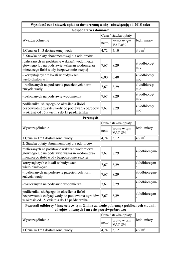 Wysokość cen i stawek opłat za dostarczoną wodę - obowiązują od 2015 roku Gospodarstwa domowe: Cena / stawka opłaty Wyszczególnienie brutto w tym Jedn. miary netto VAT-8% 1.Cena za 1m3 dostarczonej wody 4,72 5,10 zł / m3 2. Stawka opłaty abonamentowej dla odbiorców: rozliczanych na podstawie wskazań wodomierza zł /odbiorcę/ głównego lub na podstawie wskazań wodomierza 7,67 8,29 m-c mierzącego ilość wody bezpowrotnie zużytej - korzystających z lokali w budynkach zł /odbiorcę/ 6,00 6,48 wielolokalowych m-c - rozliczanych na podstawie przeciętnych norm zł /odbiorcę/ 7,67 8,29 zużycia wody m-c zł /odbiorcę/ -rozliczanych na podstawie wodomierza 7,67 8,29 m-c podlicznika, służącego do określenia ilości zł /odbiorcę/ bezpowrotnie zużytej wody do podlewania ogrodów 7,67 8,29 m-c w okresie od 15 kwietnia do 15 października Przemysł: Cena / stawka opłaty Wyszczególnienie brutto w tym Jedn. miary netto VAT-8% 1.Cena za 1m3 dostarczonej wody 4,74 5,12 zł / m3 2. Stawka opłaty abonamentowej dla odbiorców: rozliczanych na podstawie wskazań wodomierza zł/odbiorcę/mgłównego lub na podstawie wskazań wodomierza 7,67 8,29 c mierzącego ilość wody bezpowrotnie zużytej korzystających z lokali w budynkach zł/odbiorcę/m7,67 8,29 wielolokalowych c - rozliczanych na podstawie przeciętnych norm zł/odbiorcę/m7,67 8,29 zużycia wody c zł/odbiorcę/m-rozliczanych na podstawie wodomierza 7,67 8,29 c podlicznika, służącego do określenia ilości zł/odbiorcę/mbezpowrotnie zużytej wody do podlewania ogrodów 7,67 8,29 c w okresie od 15 kwietnia do 15 października Pozostali odbiorcy / inne cele ,w tym Gmina za wodę pobraną z publicznych studni i zdrojów ulicznych i na cele przeciwpożarowe: Cena / stawka opłaty Wyszczególnienie brutto w tym Jedn. miary netto VAT-8% 1.Cena za 1m3 dostarczonej wody 4,74 5,12 zł / m3 2. Stawka opłaty abonamentowej dla odbiorców: rozliczanych na podstawie wskazań wodomierza głównego lub na podstawie wskazań wodomierza mierzącego ilość wody bezpowrotnie zużytej korzystających z lokali w budynkach wielolokalowych - rozliczanych na podstawie przeciętnych norm zużycia wody -rozliczanych na podstawie wodomierza 7,67 8,29 7,67 8,29 7,67 8,29 7,67 8,29 podlicznika, służącego do określenia ilości bezpowrotnie zużytej wody do podlewania ogrodów 7,67 8,29 w okresie od 15 kwietnia do 15 października Wysokość cen i stawek opłat za odprowadzone ścieki Gospodarstwa domowe: Cena / stawka opłaty Wyszczególnienie brutto w tym netto VAT-8% 1.Cena za odprowadzane ścieki 7,33 7,92 zł /odbiorcę/mc zł /odbiorcę/mc zł /odbiorcę/mc zł /odbiorcę/mc zł/odbiorcę/mc Jedn. miary zł / m3 Przemysł, pozostali odbiorcy: Cena / stawka opłaty Wyszczególnienie brutto w tym Jedn. miary netto VAT-8% 1.Cena za odprowadzane ścieki 8,24 8,90 zł / m3 Wysokość stawek opłat za przyłączenie do urządzeń wodociągowo - kanalizacyjnych Odbiorcy wody: Cena / stawka opłaty Wyszczególnienie brutto w tym Jedn. miary netto VAT-23% Stawka opłaty za przyłączenie do urządzeń wodociągowych (odbiór techniczny przyłącza 133,20 163,84 zł/przyłączenie wodociągowego wybudowanego przez odbiorcę) Dostawcy ścieków: Cena / stawka opłaty Wyszczególnienie brutto w tym netto VAT-23% Stawka opłaty za przyłączenie do urządzeń wodociągowych (odbiór techniczny przyłącza 133,20 163,84 wodociągowego wybudowanego przez odbiorcę) Odbiorcy wody, dostawcy ścieków: Wyszczególnienie Cena / stawka opłaty Jedn. miary zł/przyłączenie Jedn. miary netto brutto w tym VAT-23% Stawka opłaty za przyłączenie do urządzeń wodociągowo-kanalizacyjnych (odbiór techniczny 199,80 245,75 zł/przyłączenie przyłącza wodociągowo - kanalizacyjnego wybudowanego przez odbiorcę usług) 1) Pobierz - Uchwła Rady Miasta w sprawie zatwierdzenia taryf dla zbiorowego zaopatrzenia w wodę i zbiorowego odprowadzania ścieków na terenie miasta Poręba (obowiązuje od 1 stycznia 2013) 2) Pobierz - Uchwła Rady Miasta w sprawie zatwierdzenia taryf dla zbiorowego zaopatrzenia w wodę i zbiorowego odprowadzania ścieków na terenie miasta Poręba (obowiązuje od 1 stycznia 2014)