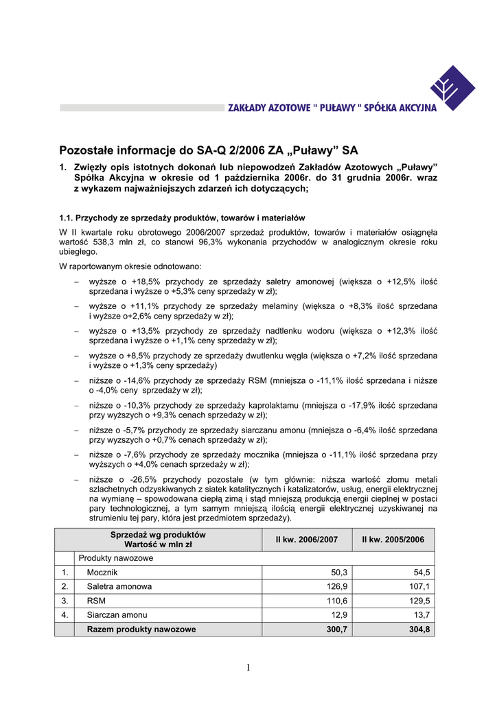 Pozostałe informacje do SA-Q 2/2006 ZA „Puławy” SA 1. Zwięzły opis istotnych dokonań lub niepowodzeń Zakładów Azotowych „Puławy” Spółka Akcyjna w okresie od 1 października 2006r. do 31 grudnia 2006r. wraz z wykazem najważniejszych zdarzeń ich dotyczących; 1.1. Przychody ze sprzedaży produktów, towarów i materiałów W II kwartale roku obrotowego 2006/2007 sprzedaż produktów, towarów i materiałów osiągnęła wartość 538,3 mln zł, co stanowi 96,3% wykonania przychodów w analogicznym okresie roku ubiegłego. W raportowanym okresie odnotowano: − wyższe o +18,5% przychody ze sprzedaży saletry amonowej (większa o +12,5% ilość sprzedana i wyższe o +5,3% ceny sprzedaży w zł); − wyższe o +11,1% przychody ze sprzedaży melaminy (większa o +8,3% ilość sprzedana i wyższe o+2,6% ceny sprzedaży w zł); − wyższe o +13,5% przychody ze sprzedaży nadtlenku wodoru (większa o +12,3% ilość sprzedana i wyższe o +1,1% ceny sprzedaży w zł); − wyższe o +8,5% przychody ze sprzedaży dwutlenku węgla (większa o +7,2% ilość sprzedana i wyższe o +1,3% ceny sprzedaży) − niższe o -14,6% przychody ze sprzedaży RSM (mniejsza o -11,1% ilość sprzedana i niższe o -4,0% ceny sprzedaży w zł); − niższe o -10,3% przychody ze sprzedaży kaprolaktamu (mniejsza o -17,9% ilość sprzedana przy wyższych o +9,3% cenach sprzedaży w zł); − niższe o -5,7% przychody ze sprzedaży siarczanu amonu (mniejsza o -6,4% ilość sprzedana przy wyzszych o +0,7% cenach sprzedaży w zł); − niższe o -7,6% przychody ze sprzedaży mocznika (mniejsza o -11,1% ilość sprzedana przy wyższych o +4,0% cenach sprzedaży w zł); − niższe o -26,5% przychody pozostałe (w tym głównie: niższa wartość złomu metali szlachetnych odzyskiwanych z siatek katalitycznych i katalizatorów, usług, energii elektrycznej na wymianę – spowodowana ciepłą zimą i stąd mniejszą produkcją energii cieplnej w postaci pary technologicznej, a tym samym mniejszą ilością energii elektrycznej uzyskiwanej na strumieniu tej pary, która jest przedmiotem sprzedaży). Sprzedaż wg produktów Wartość w mln zł II kw. 2006/2007 II kw. 2005/2006 Produkty nawozowe 1. Mocznik 50,3 54,5 2. Saletra amonowa 126,9 107,1 3. RSM 110,6 129,5 4. Siarczan amonu 12,9 13,7 300,7 304,8 Razem produkty nawozowe 1 Produkty nienawozowe 1. Melamina 89,2 80,3 2 Kaprolaktam 99,8 111,3 3. Nadtlenek wodoru wp 100% 5,1 4,5 5. Dwutlenek węgla 1,7 1,6 195,9 197,6 41,8 56,8 538,3 559,2 Razem produkty nienawozowe Pozostała sprzedaż Sprzedaż ogółem Sprzedaż produktów nawozowych i nienawozowych wyniosła 496,6 mln zł i była niższa od wykonanej w analogicznym okresie roku ub. o -5,8mln zł. 1. Sprzedaż głównych produktów Ilość w tonach Produkty nawozowe 2. Produkty nienawozowe II kw. 2006/2007 II kw. 2005/2006 528 364 543 384 49 715 50 443 W raportowanym okresie w relacji do analogicznego okresu roku ubiegłego odnotowano mniejszą tonażowo sprzedaż zarówno głównych: produktów nawozowych (o-2,8%) jak i nienawozowych (o -1,4%). Udział eksportu w danej kategorii przychodów ze sprzedaży II kw. 2006/2007 II kw. 2005/2006 1. Produkty nawozowe 41% 52% 2. Produkty nienawozowe 72% 73% 3. Pozostała sprzedaż * 0% 6% 49% 55% Sprzedaż ogółem * w tym: uwzględniono sprzedaż towarów i materiałów. W związku z tym, że Spółka posiada duży udział eksportu w sprzedaży ogółem istotny wpływ na przychody z eksportu w poszczególnych kategoriach produktów miała aprecjacja złotówki wobec walut. Większość obrotów Spółka realizuje w EUR. Na podstawie średnich kursów NBP w okresie październik’06 – grudzień’06 w relacji do analogicznego okresu roku ubiegłego złoty umocnił się wobec EUR o + 1,72% i wobec USD o + 9,40%. Spadek udziału eksportu w sprzedaży produktów nawozowych Spółki wynika również ze zmniejszonych przychodów ze sprzedaży na eksport: RSM, mocznika i saletry amonowej, co w 91,1% zostało zrekompensowane zwiększonymi przychodami ze sprzedaży na kraj tych produktów. W kategorii „pozostała sprzedaż” w II kwartale br. w zamian za przychody z tradingu towarów kierowanych na eksport realizowano zwiększoną sprzedaż tradingową na kraj, stąd 0% udział eksportu w tej kategorii wykazany w tabeli powyżej. 1.2. Średnia rentowność produktów Średnia rentowność sprzedaży grup produktów w tabeli poniżej, wyrażona jest jako relacja marży na sprzedaży produktów po pokryciu sumy technicznego kosztu wytworzenia produktów sprzedanych i kosztów sprzedaży do przychodów ze sprzedaży. 2 2006/2007 Grupa produktów 2005/2006 I kw. II kw. rok I kw. II kw. III kw. IV kw. Produkty nawozowe* 3 - 14% 2 - 24% 11% - 24% 5% - 16% 16% - 27% 10% - 26% 9% - 24% Produkty nienawozowe** 3 - 20% 7% - 24% -4% - 20% -3% - 20% 4% - 21% -1% - 21% -17% - 19% Pozostała sprzedaż 6% 5% 8% 4% 9% 11% 7% Razem 6% 9% 12% 8% 14%*** 14% 9% * Grupa zawiera RSM, mocznik, saletrę amonową. Nie zawiera siarczanu amonu. ** Grupa zawiera melaminę, kaprolaktam łącznie z siarczanem amonu (jako produkt uboczny kaprolaktamu) oraz nadtlenek wodoru. *** Dane porównywalne do II kw. 06/07 - urealnienie kosztów remontów. 1.3. Koszty operacyjne Koszty operacyjne wg rodzaju Wartość w mln zł 1. Amortyzacja 2. Zużycie materiałów i energii, w tym: II kw. 2006/2007 II kw. 2005/2006 24,7 29,5 343,2 309,0 181,8 154,2 Zużycie energii elektrycznej 53,2 52,5 Zużycie benzenu 52,1 44,6 Zużycie węgla 26,1 28,5 3. Podatki i opłaty 16,4 15,7 4. Wynagrodzenia 34,0 31,7 5. Ubezpieczenia społeczne 8,4 7,7 6. Pozostałe koszty rodzajowe 74,1 79,7 Koszty wg rodzaju razem 500,8 473,3 Zużycie gazu ziemnego 7. Zmiana stanu zapasów produktów i produkcji w toku i RMK 2,2 2,1 8. Koszt wytworzenia produktów na własne potrzeby 8,1 0,8 9. Wartość towarów i materiałów 22,0 29,5 512,5 499,9 Koszty działalności operacyjnej W porównaniu do analogicznego okresu roku ubiegłego: w