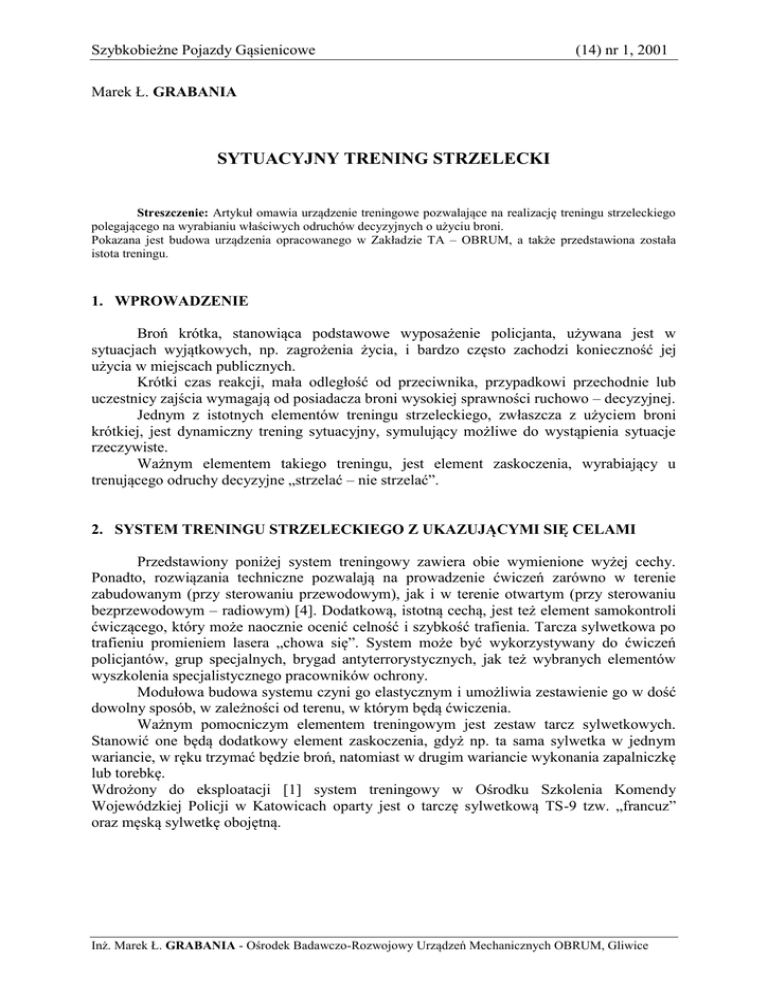 Szybkobieżne Pojazdy Gąsienicowe (14) nr 1, 2001 Marek Ł. GRABANIA SYTUACYJNY TRENING STRZELECKI Streszczenie: Artykuł omawia urządzenie treningowe pozwalające na realizację treningu strzeleckiego polegającego na wyrabianiu właściwych odruchów decyzyjnych o użyciu broni. Pokazana jest budowa urządzenia opracowanego w Zakładzie TA – OBRUM, a także przedstawiona została istota treningu. 1. WPROWADZENIE Broń krótka, stanowiąca podstawowe wyposażenie policjanta, używana jest w sytuacjach wyjątkowych, np. zagrożenia życia, i bardzo często zachodzi konieczność jej użycia w miejscach publicznych. Krótki czas reakcji, mała odległość od przeciwnika, przypadkowi przechodnie lub uczestnicy zajścia wymagają od posiadacza broni wysokiej sprawności ruchowo – decyzyjnej. Jednym z istotnych elementów treningu strzeleckiego, zwłaszcza z użyciem broni krótkiej, jest dynamiczny trening sytuacyjny, symulujący możliwe do wystąpienia sytuacje rzeczywiste. Ważnym elementem takiego treningu, jest element zaskoczenia, wyrabiający u trenującego odruchy decyzyjne „strzelać – nie strzelać”. 2. SYSTEM TRENINGU STRZELECKIEGO Z UKAZUJĄCYMI SIĘ CELAMI Przedstawiony poniżej system treningowy zawiera obie wymienione wyżej cechy. Ponadto, rozwiązania techniczne pozwalają na prowadzenie ćwiczeń zarówno w terenie zabudowanym (przy sterowaniu przewodowym), jak i w terenie otwartym (przy sterowaniu bezprzewodowym – radiowym) [4]. Dodatkową, istotną cechą, jest też element samokontroli ćwiczącego, który może naocznie ocenić celność i szybkość trafienia. Tarcza sylwetkowa po trafieniu promieniem lasera „chowa się”. System może być wykorzystywany do ćwiczeń policjantów, grup specjalnych, brygad antyterrorystycznych, jak też wybranych elementów wyszkolenia specjalistycznego pracowników ochrony. Modułowa budowa systemu czyni go elastycznym i umożliwia zestawienie go w dość dowolny sposób, w zależności od terenu, w którym będą ćwiczenia. Ważnym pomocniczym elementem treningowym jest zestaw tarcz sylwetkowych. Stanowić one będą dodatkowy element zaskoczenia, gdyż np. ta sama sylwetka w jednym wariancie, w ręku trzymać będzie broń, natomiast w drugim wariancie wykonania zapalniczkę lub torebkę. Wdrożony do eksploatacji [1] system treningowy w Ośrodku Szkolenia Komendy Wojewódzkiej Policji w Katowicach oparty jest o tarczę sylwetkową TS-9 tzw. „francuz” oraz męską sylwetkę obojętną. Inż. Marek Ł. GRABANIA - Ośrodek Badawczo-Rozwojowy Urządzeń Mechanicznych OBRUM, Gliwice Marek Ł. GRABANIA 2.1. Budowa systemu STS-3P Opracowany w Ośrodku system z tarczami ukazującymi się posiada oznaczenie STS3X [2], [3], które będzie stosowane poniżej. Litera „X” zastąpiona literą „P”, oznacza wersję sterowaną przewodowo, natomiast litera „B” oznacza wersję systemu sterowanego drogą radiową. Schemat ideowy systemu STS-3P pokazany jest na rys. 1. Rys. 1. System treningowy STS-3P 1 – pulpit sterujący, 2 – przewody sygnałowe, 3 – moduł napędowy, 4 – tarcza sylwetkowa, 5 – zasilacz zewnętrzny modułu System STS-3P [2] służy do treningu strzeleckiego w zakresie użycia broni z laserową symulację strzałów do celów ukazujących się – tarcze obrotowe lub podnoszące się. Zasadniczymi elementami systemu są tarcze: - aktywna z sylwetką agresywną, - pasywna z sylwetka obojętną. Tarcze aktywne posiadają elektroniczne pola trafień współpracujące z laserowym symulatorem strzału. Do treningu stosowana jest krótka broń bojowa, wyposażona w bezprzewodowy laserowy symulator strzału lub też pistolet szkolny z wbudowanym symulatorem. Układ sterowania systemu STS-3P (rys. 1) pozwala na jednoczesne sterowanie pracą od jednej do jedenastu tarcz sylwetkowych, ustawionych według wybranej konfiguracji przez instruktora, w specjalnie przygotowanym pomieszczeniu symulującym możliwe do wystąpienia sytuacje rzeczywiste. 2 Sytuacyjny trening strzelecki 2.1.1. Pulpit sterujący Pulpit sterujący pokazany jest na rys. 2. W przyjętym rozwiązaniu uaktywnienie tarczy następuje po wciśnięciu odpowiedniego przycisku (rys. 2) na pulpicie sterującym. Numer tarczy jest przyporządkowany numerowi pozycji przełącznika od 1 do 11. Poszczególne tarcze można uaktywniać w dowolnej kolejności. Dla jednoczesnego załączenia wszystkich tarcz należy przełącznik ustawić w pozycji „1 – 11”. Na ściance tylnej pulpitu znajdują się gniazda przyłączeniowe kabli sterujących oraz dodatkowe gniazdo do współpracy z symulatorem huku (jako dodatkowa opcja wykonania systemu). Rys. 2. Pulpit sterujący – widok 2.1.2. Przewody sygnałowe Przewody sygnałowe / sterujące o długości 20mb stanowią wyposażenie systemu w postaci pojedynczych przewodów z przyłączami do poszczególnych tarcz oraz pulpitu sterującego. Wtyki przewodów należy podłączyć do odpowiednich gniazd znajdujących się na ściance tylnej pulpitu (rys. 2) oraz gniazd znajdujących się na płycie dolnej modułu (rys. 3.). 2.1.3. Moduł napędowy Moduł napędowy stanowi zwartą, zamkniętą obudowę w kształcie cylindra z wyprowadzoną osią pozwalającą na montaż tarczy sylwetkowej do modułu. Rys. 3 Płyta górna i dolna modułu napędowego 3 Marek Ł. GRABANIA W module napędowym zabudowany jest silnik z przekładnią, układ kontroli i sterowania oraz wewnętrzny akumulator. Na płycie górnej znajduje się gniazdo złącza (rys. 3) do podłączenia sygnału z aktywnej tarczy. Na płycie dolnej modułu znajduje się: - przełącznik załączenia zasilania, - przełącznik automatycznego powrotu, - zaciski do podłączenia zasilania 220V AC/12V DC, - gniazdo do podłączenia pulpitu sterowania, - dioda sygnalizacyjna LED. Wielobarwna dioda LED sygnalizuje monitorowane stany: - włączenia zasilania, - napięcia akumulatora, - przeciążenia napięcia akumulatora, - ładowania akumulatora, - popra