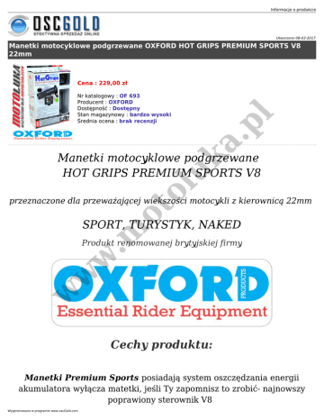 Informacje o produkcie Utworzono 08-03-2017 Manetki motocyklowe podgrzewane OXFORD HOT GRIPS PREMIUM SPORTS V8 22mm Nr katalogowy : OF 693 Producent : OXFORD Dostępność : Dostępny Stan magazynowy : bardzo wysoki Średnia ocena : brak recenzji a. pl Cena : 229,00 zł ol uk Manetki motocyklowe podgrzewane HOT GRIPS PREMIUM SPORTS V8 ot przeznaczone dla przeważającej wiekszości motocykli z kierownicą 22mm .m SPORT, TURYSTYK, NAKED w w w Produkt renomowanej brytyjskiej firmy Cechy produktu: Manetki Premium Sports posiadają system oszczędzania energii akumulatora wyłącza matetki, jeśli Ty zapomnisz to zrobić- najnowszy poprawiony sterownik V8 Wygenerowano w programie www.oscGold.com oraz nową pięciostopniową regulację grzania, 30%, 40%, 50%, 75% i 100% mocy manetek. Maksymalna temperatura grzania manetek jest regulowana nawet do 50 st C. w w w .m ot ol uk a. pl Miękkie uchwyty, wykonane są w technologii ULTRA GRIPPY DIAMOND zainspirowanej wyścigami motocyklowymi, zaprojektowany w sposób łączący komfort użytkowania z pewnością chwytu i czucia manetki. Przed porażeniem prądem chroni całkowicie wodoszczelna instalacja. W skład zestawu wchodzą : 2 manetki, najnowszy poprawiony elektroniczny sterownik (v.8)i podkładka samoprzylepna, uniwersalny wspornik do przełącznika, wiązka przewodów, opaski kablowe i klej do manetek w w w .m ot ol uk a. pl Informacje o produkcie Wygenerowano w programie www.oscGold.com