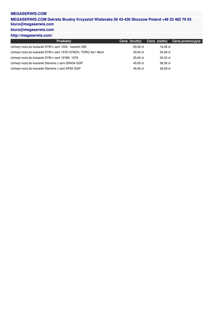MEGASERWIS.COM MEGASERWIS.COM Dekrets Brudny Krzysztof Wislanska 56 43-430 Skoczow Poland +48 33 482 79 93 [email protected] [email protected] http://megaserwis.com/ Produkty Cena (brutto) Cena (netto) Cena promocyjna Uchwyt noża do kosiarek DYM z serii 1553 - kosiarki 450 20,00 zł 16,26 zł Uchwyt noża do kosiarek DYM z serii 1575/1576CK, TORQ 3w1 46cm 30,00 zł 24,39 zł Uchwyt noża do kosiarek DYM z serii 1578K, 1578 25,00 zł 20,33 zł Uchwyt noża do kosiarek Sterwins z serii GR434 GGP 45,00 zł 36,59 zł Uchwyt noża do kosiarek Sterwins z serii SP52 GGP 45,00 zł 36,59 zł