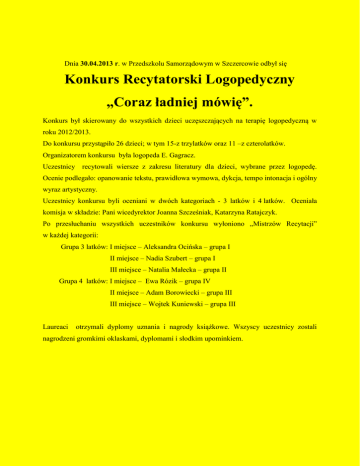 Dnia 30.04.2013 r. w Przedszkolu Samorządowym w Szczercowie odbył się Konkurs Recytatorski Logopedyczny „Coraz ładniej mówię”. Konkurs był skierowany do wszystkich dzieci uczęszczających na terapię logopedyczną w roku 2012/2013. Do konkursu przystąpiło 26 dzieci; w tym 15-z trzylatków oraz 11 –z czterolatków. Organizatorem konkursu była logopeda E. Gagracz. Uczestnicy recytowali wiersze z zakresu literatury dla dzieci, wybrane przez logopedę. Ocenie podlegało: opanowanie tekstu, prawidłowa wymowa, dykcja, tempo intonacja i ogólny wyraz artystyczny. Uczestnicy konkursu byli oceniani w dwóch kategoriach - 3 latków i 4 latków. Oceniała komisja w składzie: Pani wicedyrektor Joanna Szcześniak, Katarzyna Ratajczyk. Po przesłuchaniu wszystkich uczestników konkursu wyłoniono „Mistrzów Recytacji” w każdej kategorii: Grupa 3 latków: I miejsce – Aleksandra Ocińska – grupa I II miejsce – Nadia Szubert – grupa I III miejsce – Natalia Małecka – grupa II Grupa 4 latków: I miejsce – Ewa Rózik – grupa IV II miejsce – Adam Borowiecki – grupa III III miejsce – Wojtek Kuniewski – grupa III Laureaci otrzymali dyplomy uznania i nagrody książkowe. Wszyscy uczestnicy zostali nagrodzeni gromkimi oklaskami, dyplomami i słodkim upominkiem.