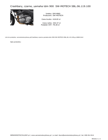 Crashbary, czarne, yamaha tdm 900 SW-MOTECH SBL.06.119.100 Indeks: SM14860 Producent: SW-MOTECH Cena brutto: 418.65 zł Cena netto: 340.37 zł Podatek VAT: 78.28 zł Link do produktu: serwismotocyklowy.pl/Crashbary-czarne-yamaha-tdm-900-SW-MOTECH-SBL.06.119.100,p,14860.html Opis produktu: SERWISMOTOCYKLOWY.pl | www.serwismotocyklowy.pl | e-mail: [email protected] | tel. 606 814 814 Strona 1 z 1