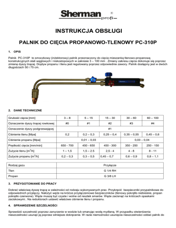Sherman INSTRUKCJA OBSŁUGI PALNIK DO CIĘCIA PROPANOWO-TLENOWY PC-310P 1. OPIS Palnik PC-310P to smoczkowy (inżektorowy) palnik przeznaczony do cięcia mieszanką tlenowo-propanową konstrukcyjnych stali węglowych i niskostopowych w zakresie 3 – 100 mm . Zmiany zakresu cięcia dokonuje się poprzez zmianę dyszy tnącej. Dopływ propanu i tlenu jest regulowany poprzez odpowiednie zawory. Palnik dostępny jest w dwóch długościach 50 i 75 cm. 2. DANE TECHNICZNE Grubość cięcia [mm] Oznaczenie dyszy tnącej rowkowej 3–8 5 – 15 15 – 30 30 – 60 60 – 100 #0 #1 #2 #3 #4 0,35 – 0,55 0,45 – 0,6 Oznaczenie dyszy podgrzewającej Ciśnienie tlenu [Mpa] #1 0,2 Ciśnienie propanu [Mpa] Prędkość cięcia [mm/min] 3 Zużycie tlenu [m /h] 3 Zużycie propanu [m /h] 0,2 – 0,3 0,25 – 0,4 0,01 – 0,03 0,03 – 0,04 650 - 700 450 - 650 450 - 300 350 - 250 250 - 150 1 – 1,5 1,5 – 2.5 2,5 - 4 4-8 8 - 11 0,2 – 0,3 0,3 – 0,5 0,45 – 0,7 0,6 – 0,9 0,8 – 1,1 Rodzaj gazu Przyłącze Tlen G 1/4 RH Propan G 3/8 LH 3. PRZYGOTOWANIE DO PRACY Dobrać właściwą dyszę tnącą w zależności od rodzaju wykonywanych prac. Przykręcić bezpieczniki przypalnikowe do odpowiednich przyłączy. Nałożyć węże na króćce przyłączeniowe bezpieczników (tlenowy pokrętło niebieskie, propan pokrętło czerwone). Węże muszą być czyste i wolne od resztek smarów. Węże zacisnąć na króćcach opaskami zaciskowymi.. Na reduktorach ustawić właściwe ciśnienie tlenu i propanu. 4. SPRAWDZENIE SZCZELNOŚCI Sprawdzić szczelność poprzez zanurzenie w wodzie lub smarując wodą mydlaną. W przypadku stwierdzenia nieszczelności usunąć ją poprzez silniejsze dokręcenie. W razie niemożności usunięcia nieszczelności oddać palnik do Sherman naprawy w autoryzowanym serwisie. Praca palnikiem wskazującym jakiekolwiek nieszczelności jest zabroniona i grozi poważnym wypadkiem! 5. ZAPALANIE PALNIKA I REGULACJA PŁOMIENIA 1. Otworzyć zawór propanu o ¼ - ½ obrotu i zapalić palnik przy pomocy zapalarki 2. Stopniowo otwierać zawór tlenu podgrzewającego aż do uzyskania białego stożka płomienia. 3. Odkręcić zawór tlenu tnącego. Wyregulować płomień. 6. INSTRUKCJA BHP W trakcie pracy palnikiem należy przestrzegać ogólnie znanych przepisów dotyczących palników, węży, reduktorów i butli do gazów oraz wymagań p.poż obowiązujących przy użytkowaniu gazów technicznych. Szczególnie należy przestrzegać następujących zaleceń: - Zachować pełną szczelność wszystkich połączeń palnika. Należy pamiętać, ze gaz palny zmieszany z powietrzem tworzy mieszankę wybuchową. Nie wolno sprawdzać szczelności połączeń otwartym płomieniem! - W przypadku zatkania się podczas pracy otworu w dyszy natychmiast zgasić palnik i przeczyścić otwór. - Zapalonego palnika nie odkładać w czasie przerw w pracy. Palnik trzymać tak, aby płomień był skierowany w dół lub w górę i nie mógł poparzyć osób stojących obok. - Należy zwracać uwagę, aby płomień palnika oraz iskry i odpryski metalu powstające podczas cięcia nie mogły dosięgnąć węży, reduktorów, butli z gazem, itp. - Zabrania się używać palnika w pobliżu materiałów łatwopalnych i wybuchowych. - W czasie dłuższych przerw w eksploatacji palnika, zawory butlowe powinny być zamkniete. - Butle do gazów technicznych należy chronić przed nadmiernym nagrzaniem lub oziębieniem. Zawór butlowy należy otwierać powoli. - Zabrania się jakichkolwiek przeróbek i modyfikacji palnika przez użytkowników. 7. SPECYFIKACJA KOMPLETU 1. Palnik PC-310P 50 cm lub 75 cm 2. Dysza podgrzewająca #1 3. Dysza tnąca rowkowa #1 1 szt 1 szt 1 szt 8. WYKAZ STANDARDOWYCH CZĘŚCI ZAMIENNYCH Nazwa Dysza tnąca rowkowa Dysza podgrzewająca TECWELD Piotr Polak 41-924 Bytom, ul. Krzyżowa 3 Tel. (+48 32) 38-69-428, fax (+48 32) 38-69-434 e-mail: [email protected] www.tecweld.pl Nr Nr katalogowy #0 R8TPB0 #1 R8TPB1 #2 R8TPB2 #3 R8TPB3 #4 R8TPB4 #1 R8PPB1