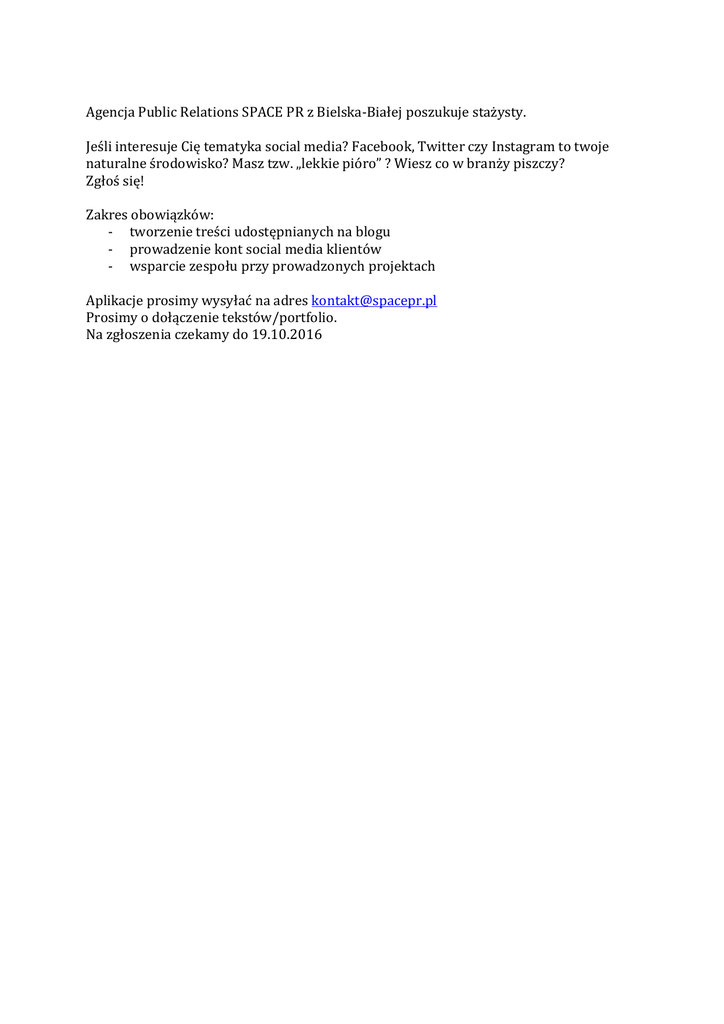 Agencja Public Relations SPACE PR z Bielska-Białej poszukuje stażysty. Jeśli interesuje Cię tematyka social media? Facebook, Twitter czy Instagram to twoje naturalne środowisko? Masz tzw. „lekkie pióro” ? Wiesz co w branży piszczy? Zgłoś się! Zakres obowiązków: - tworzenie treści udostępnianych na blogu - prowadzenie kont social media klientów - wsparcie zespołu przy prowadzonych projektach Aplikacje prosimy wysyłać na adres [email protected] Prosimy o dołączenie tekstów/portfolio. Na zgłoszenia czekamy do 19.10.2016