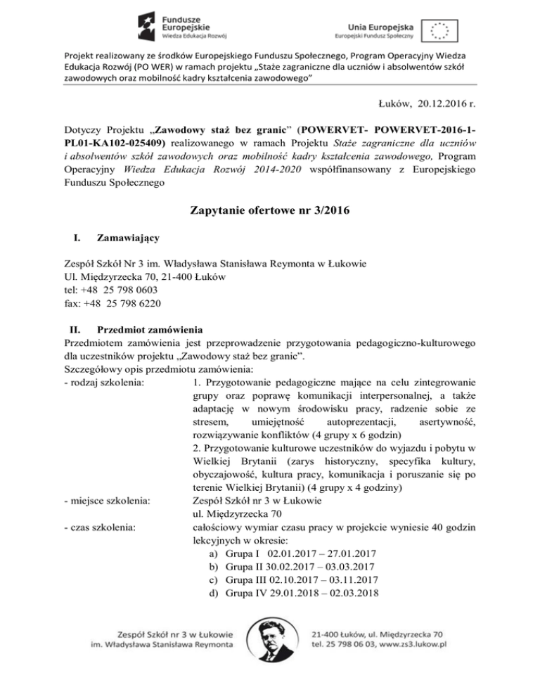 Projekt realizowany ze środków Europejskiego Funduszu Społecznego, Program Operacyjny Wiedza Edukacja Rozwój (PO WER) w ramach projektu „Staże zagraniczne dla uczniów i absolwentów szkół zawodowych oraz mobilność kadry kształcenia zawodowego” Łuków, 20.12.2016 r. Dotyczy Projektu „Zawodowy staż bez granic” (POWERVET- POWERVET-2016-1PL01-KA102-025409) realizowanego w ramach Projektu Staże zagraniczne dla uczniów i absolwentów szkół zawodowych oraz mobilność kadry kształcenia zawodowego, Program Operacyjny Wiedza Edukacja Rozwój 2014-2020 współfinansowany z Europejskiego Funduszu Społecznego Zapytanie ofertowe nr 3/2016 I. Zamawiający Zespół Szkół Nr 3 im. Władysława Stanisława Reymonta w Łukowie Ul. Międzyrzecka 70, 21-400 Łuków tel: +48 25 798 0603 fax: +48 25 798 6220 II. Przedmiot zamówienia Przedmiotem zamówienia jest przeprowadzenie przygotowania pedagogiczno-kulturowego dla uczestników projektu „Zawodowy staż bez granic”. Szczegółowy opis przedmiotu zamówienia: - rodzaj szkolenia: 1. Przygotowanie pedagogiczne mające na celu zintegrowanie grupy oraz poprawę komunikacji interpersonalnej, a także adaptację w nowym środowisku pracy, radzenie sobie ze stresem, umiejętność autoprezentacji, asertywność, rozwiązywanie konfliktów (4 grupy x 6 godzin) 2. Przygotowanie kulturowe uczestników do wyjazdu i pobytu w Wielkiej Brytanii (zarys historyczny, specyfika kultury, obyczajowość, kultura pracy, komunikacja i poruszanie się po terenie Wielkiej Brytanii) (4 grupy x 4 godziny) - miejsce szkolenia: Zespół Szkół nr 3 w Łukowie ul. Międzyrzecka 70 - czas szkolenia: całościowy wymiar czasu pracy w projekcie wyniesie 40 godzin lekcyjnych w okresie: a) Grupa I 02.01.2017 – 27.01.2017 b) Grupa II 30.02.2017 – 03.03.2017 c) Grupa III 02.10.2017 – 03.11.2017 d) Grupa IV 29.01.2018 – 02.03.2018 Projekt realizowany ze środków Europejskiego Funduszu Społecznego, Program Operacyjny Wiedza Edukacja Rozwój (PO WER) w ramach projektu „Staże zagraniczne dla uczniów i absolwentów szkół zawodowych oraz mobilność kadry kształcenia zawodowego” -wymagania dotyczące szkolenia: Szczegółowy harmonogram i rozkład zajęć dla każdej grupy opracowuje Koordynator projektu w porozumieniu z Dyrektorem Zespołu Szkół Zawodowych nr 3 im. Wł. St. Reymonta w Łukowie. Harmonogram będzie obejmował siedem dni w tygodniu (od poniedziałku do niedzieli). Wykonawca będzie prowadził zajęcia w wyznaczonych terminach, dlatego do czasu zatwierdzenia harmonogramu wymagana jest od Wykonawcy pełna dyspozycyjność od poniedziałku do niedzieli w godzinach od 8:00 do godz. 19:00. -zakres obowiązków Wykonawcy: dostarczenie w dniu zawarcia umowy o udzielenie zamówienia publicznego tematyki pozalekcyjnych zajęć dodatkowych dostosowanej do planowanej liczby zajęć zaakceptowanej przez Koordynatora projektu. opracowanie testów sprawdzających wiedzę i umiejętności Uczniów Uczennic na rozpoczęciu zajęć oraz po ich zakończeniu, przeprowadzenie diagnozy testów na wstępie i na zakończenie zajęć dla każdej grupy sporządzanie analizy ilościowej i jakościowej wyników diagnozy, prowadzenie zajęć zgodnie z zatwierdzonym programem oraz harmonogramem pozalekcyjnych zajęć dodatkowych m.in. metodą aktywnej pracy z uczniem, pisemne (emailowe) informowanie z min. z 1 dniowym wyprzedzeniem Koordynatora projektu o każdym przypadku uniemożliwiającym realizację zajęć zgodnie z harmonogramem, bieżące dokumentowanie prowadzonych zajęć w dzienniku zajęć oraz bieżąca kontrola frekwencji i monitorowania osiągnięć uczniów, sporządzanie sprawozdania z realizacji zajęć w terminie 5 dni po zakończeniu każdego kwartału i złożenia go Koordynatorowi szkolnemu, współpraca z personelem projektu w celu prawidłowej realizacji zajęć, przestrzeganie przepisów ustawy z dnia 29 sierpnia 1997 r. o ochronie danych osobowych (t.j. Dz. U. z 2015r. poz. 2135 z późn. zm.) przestrzeganie przepisów BHP oraz ppoż. w czasie trwania zajęć, zapewnienie ładu i porządku w czasie zajęć, bezpieczeństwa uczniów uczestniczącym w zajęciach oraz zgodnego z przeznaczeniem użytkowania sali, sprzętu, materiałów i pomocy dydaktycznych, prowadzenie miesięcznej ewidencji czasu pracy własnej, dyspozycyjność w zakresie czynności kontrolno wyjaśniających (również po terminie wygaśnięcia umowy ws. przedmiotowego zamówienia) wynikających z wytycznych odnośnie realizacji projektów finansowanych ze środków Europejskiego Funduszu Społecznego III. Wymagania dotyczące Wykonawcy - wykształcenie wyższe w zakresie pedagogiki, - przygotowanie pedagogiczne, IV. Termin wykonania zamówienia Projekt realizowany ze środków Europejskiego Funduszu Społecznego, Program Operacyjny Wiedza Edukacja Rozwój (PO WER) w ramach projektu „Staże zagraniczne dla uczniów i absolwentów szkół zawodowych oraz mobilność kadry kształcenia zawodowego” - styczeń 2017 – marzec 2018 r. V. Płatności Płatności na rzecz Wykonawcy zostaną zrealizowane zgodnie z terminami określonymi w umowie. VI. Sposób przygotowania oferty Oferent powinien stworzyć ofertę na formularzu załączonym do niniejszego zapytania. Oferta powinna: - posiadać datę sporządzenia, - zawierać adres lub siedzibę oferenta, numer telefonu, numer NIP, - zostać czytelnie podpisana przez Wykonawcę. Jeśli oferta danej osoby zostanie wybrana, dostarczy ona, przed podpisaniem umowy, kserokopie dokumentów potwierdzających spełniane wymagania. VII. Miejsce i termin składania ofert Oferta powinna być przesłana na druku załączonego Formularza za pośrednictwem: poczty elektronicznej na adres: [email protected], faksem na nr: 025 798 6220, poczty, kuriera lub też dostarczona osobiście na adres: Zespół Szkół Nr 3 w Łukowie, ul. Międzyrzecka 70, 21-400 Łuków. z dopiskiem: Warsztaty pedagogiczne – „Zawodowy staż bez granic