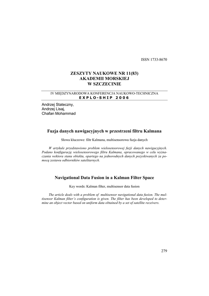 ISSN 1733-8670 ZESZYTY NAUKOWE NR 11(83) AKADEMII MORSKIEJ W SZCZECINIE IV MIĘDZYNARODOWA KONFERENCJA NAUKOWO-TECHNICZNA E X P L O-S H I P 2 0 0 6 Andrzej Stateczny, Andrzej Lisaj, Chafan Mohammad Fuzja danych nawigacyjnych w przestrzeni filtru Kalmana Słowa kluczowe: filtr Kalmana, multisensorowa fuzja danych W artykule przedstawiono problem wielosensorowej fuzji danych nawigacyjnych. Podano konfigurację wielosensorowego filtru Kalmana, opracowanego w celu wyznaczania wektora stanu obiektu, opartego na jednorodnych danych pozyskiwanych za pomocą zestawu odbiorników satelitarnych. Navigational Data Fusion in a Kalman Filter Space Key words: Kalman filter, multisensor data fusion The article deals with a problem of multisensor navigational data fusion. The multisensor Kalman filter’s configuration is given. The filter has been developed to determine an object vector based on uniform data obtained by a set of satellite receivers. 279 Andrzej Stateczny, Andrzej Lisaj, Chafan Mohammad Wstęp W procesie prowadzenia nawigacji przetwarzaniu podlegają informacje zarówno ze źródeł zewnętrznych, jak i wewnętrznych statku. Pokładowymi, wewnętrznymi źródłami informacji nawigacyjnych w zdecydowanej większości sytuacji będą odbiorniki systemu nawigacji satelitarnej oraz morski radar nawigacyjny. Zewnętrznymi źródłami informacji będą natomiast brzegowe stacje radarowe oraz systemy AIS i VTS [10, 11]. Konieczne jest uporządkowanie zbioru różnorodnych danych nawigacyjnych i ich przetwarzanie w procesie kierowania statkiem, w tym również w procesie zapobiegania kolizjom [4, 8, 9]. Problem wspólnej analizy danych nawigacyjnych pozyskiwanych za pomocą wielu urządzeń nawigacyjnych jest typowym problemem wielosensorowej fuzji danych. Zadanie polega na skonstruowaniu modelu do analizy oraz selekcji informacji nawigacyjnej, jej weryfikację oraz zarządzanie zbiorem danych nawigacyjnych w aspekcie dokładności i jakości danych w celu udostępnienia przetworzonej informacji oficerowi wachtowemu. Jednym z możliwych rozwiązań zadania wielosensorowej fuzji danych nawigacyjnych jest wykorzystanie filtru Kalmana. W artykule przedstawiono model wielosensorowego filtru Kalmana dla estymacji stanu danych jednorodnych. 1. Model matematyczny fuzji danych oparty na równaniach filtru Kalmana Działanie filtru Kalmana najogólniej polega na predykcji i korekcji. Filtr dokonuje predykcji na podstawie wcześniejszych obliczeń, zaś składnik korygujący powstaje w wyniku pomnożenia macierzy wzmocnienia K przez różnicę wektora pomiaru faktycznego i wektora estymowanego [5]. W przypadku, gdy obiekt jest opisany nieliniowym równaniem stanu i nieliniowym równaniem wyjścia, można zastosować model matematyczny, przedstawiony poniżej [6]. Składa się on z dwóch równań: – modelu procesu (opisującego obserwowany obiekt), – modelu pomiaru (opisującego przeprowadzony na nim pomiar). x(t 1) x(t ) w(t ) yi (t ) H i x(t ) vi (t ) i = 1, 2, ...l, gdzie: x(t), yi(t) – wektory stanu na wejściu i wyjściu układu, w(t), vi(t) – zakłócenia stanu układu, Φ, Hi, Γ – stałe macierze o odpowiednich wymiarach. 280 (1) (2) Fuzja danych nawigacyjnych w przestrzenni filtru Kalmana Zakładamy że: – stan początkowy x0 jest zmienną losową o rozkładzie normalnym N(0, σx), – zakłócenie m stanu wejścia i wyjścia układu, w(t) i vi(t), t = 1,2,...,l jest białym szumem gaussowskim o zerowej wartości średniej i macierzami wariancji Q i Ri. Macierz Q stanowi zaburzenie pomiarów na wejściu układu i posiada taką samą wartość, jak macierz R będącą zaburzeniem pomiarów na wyjściu. Ε[vi (t )viT (k )] 0, w(t ) Ε vi (t ) w (k ) T i ≠ j; t , k, (3) Q 0 viT (k ) tk 0 Ri gdzie E jest wartością oczekiwaną, a zmienne w(k) i vi(k) są wektorami transponowanymi oraz δtk jest deltą funkcji Kroneckera. 2. Algorytm fuzji danych z wykorzystaniem wielosensorowego filtru Kalmana Fuzja zbioru danych l sensorów polega na tym, że [1, 6, 7]: Xˆ 0 (t \ t ) A1 (t ) Xˆ 1 (t \ t ) ..... Al (t ) Xˆ l (t \ t ) (4) gdzie: Ai (t ), i 1,2,...,l, są macierzami wag, Xˆ 0 (t \ t ) są to wartości estymowane z poszczególnych zbiorów danych z 1,2,...,l , wskaźników wynikających bezpośrednio z procesu filtracji. Macierz wag wyliczana jest ze wzoru (6): A 1e(eT 1e) 1 (5) gdzie : A [ A1, A2 ,......Al ]T macierz A składa się z bloków A1 , A2 ,..., Al , w których każdy z bloków ma wymiar n × n, gdzie n jest ilością zmiennych wchodzących w wektor stanu obiektu; 281 Andrzej Stateczny, Andrzej Lisaj, Chafan Mohammad e [ I1 ,.....I l ]T macierz e składa się z bloków I1 ,.....I l , gdzie każdy blok I jest macierzą jednostkową po głównej przekątnej o wymiarach n × n. 11 0 0 11 e 1 0 n 0 1n nl A1 A Al nl Macierz Σ jest diagonalną macierzą złożoną z diagonalnych elementów macierzy kowariancji Pij: ( Pij )nl nl gdzie Pij , i, j 1,2,...l Pij ... Pij ... ... ... Pij ... Pij l l P11 P21 ... Pi j ... ... Pn1 P12 ... ... ... P22 ... ... ... ... ... ... ... ... ... .... ... ... ... .... ... Pn 2 ... ... ... (6) P1n P2 n ... ... ... Pnn nn Macierz kowariancji wyliczana jest ze wzoru: Pij (t 1 \ t 1) [ I n Ki (t 1) H i ] [Pij (t \ t )T QT ] [ I n K j (t 1) H j ]T (7) gdzie Pij(t\t), i,j = 1,2....l są macierzami wzajemnych kowariancji błędów po filtracji. Wartości początkowe Pij(0\0)= P0, gdzie P0 to jest ocena dokładności fuzji zbioru danych wyliczana ze wzoru: 282 Fuzja danych nawigacyjnych w przestrzenni filtru Kalmana P0 (eT 1e)1 (8) P0 (eT 1e) 1 eT 1 ( Pij )nl nl 1e(eT 1e) 1 (9) lub Dalszym etapem fuzji danych są zdefiniowane lokalne filtry Kalmana, w których ich ilość jest równa ilości poszczególnych sensorów. Warunki początkowe: xˆ (0 | 0) 0 , Pi (0 | 0) P0 (10) 12 0 0 2 P0 =Pij(0\0) = 0 2 0 , przykładowo 12 = 22 = 32 = 0,1 0 32 0 n n Filtr Kalmana możemy przedstawić za pomocą następujących równań: Pi (t 1 \ t 1) [ I n Ki (t 1) Hi ]Pi (t