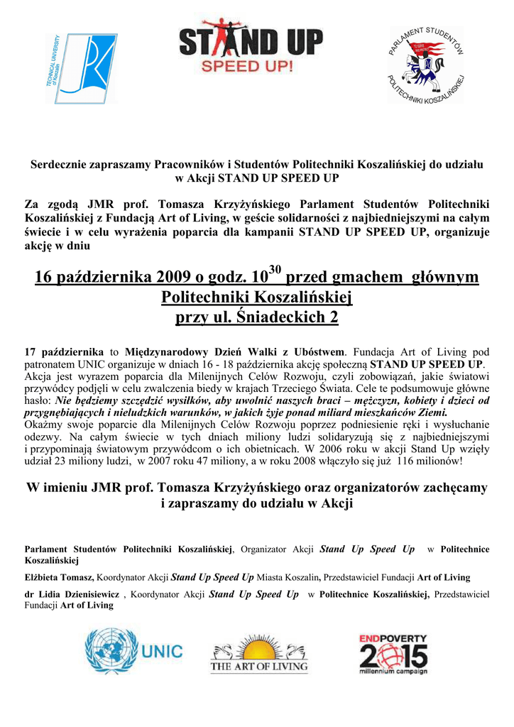 Serdecznie zapraszamy Pracowników i Studentów Politechniki Koszalińskiej do udziału w Akcji STAND UP SPEED UP Za zgodą JMR prof. Tomasza Krzyżyńskiego Parlament Studentów Politechniki Koszalińskiej z Fundacją Art of Living, w geście solidarności z najbiedniejszymi na całym świecie i w celu wyrażenia poparcia dla kampanii STAND UP SPEED UP, organizuje akcję w dniu 16 października 2009 o godz. 1030 przed gmachem głównym Politechniki Koszalińskiej przy ul. Śniadeckich 2 17 października to Międzynarodowy Dzień Walki z Ubóstwem. Fundacja Art of Living pod patronatem UNIC organizuje w dniach 16 - 18 października akcję społeczną STAND UP SPEED UP. Akcja jest wyrazem poparcia dla Milenijnych Celów Rozwoju, czyli zobowiązań, jakie światowi przywódcy podjęli w celu zwalczenia biedy w krajach Trzeciego Świata. Cele te podsumowuje główne hasło: Nie będziemy szczędzić wysiłków, aby uwolnić naszych braci – mężczyzn, kobiety i dzieci od przygnębiających i nieludzkich warunków, w jakich żyje ponad miliard mieszkańców Ziemi. Okażmy swoje poparcie dla Milenijnych Celów Rozwoju poprzez podniesienie ręki i wysłuchanie odezwy. Na całym świecie w tych dniach miliony ludzi solidaryzują się z najbiedniejszymi i przypominają światowym przywódcom o ich obietnicach. W 2006 roku w akcji Stand Up wzięły udział 23 miliony ludzi, w 2007 roku 47 miliony, a w roku 2008 włączyło się już 116 milionów! W imieniu JMR prof. Tomasza Krzyżyńskiego oraz organizatorów zachęcamy i zapraszamy do udziału w Akcji Parlament Studentów Politechniki Koszalińskiej, Organizator Akcji Stand Up Speed Up Koszalińskiej w Politechnice Elżbieta Tomasz, Koordynator Akcji Stand Up Speed Up Miasta Koszalin, Przedstawiciel Fundacji Art of Living dr Lidia Dzienisiewicz , Koordynator Akcji Stand Up Speed Up w Politechnice Koszalińskiej, Przedstawiciel Fundacji Art of Living