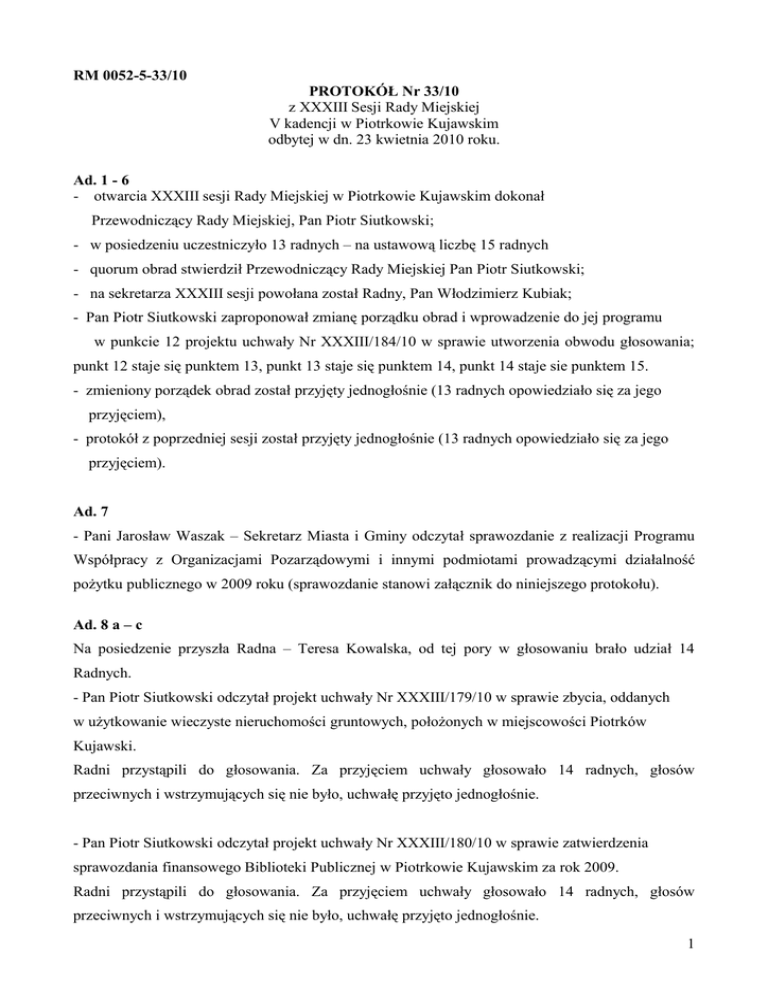 RM 0052-5-33/10 PROTOKÓŁ Nr 33/10 z XXXIII Sesji Rady Miejskiej V kadencji w Piotrkowie Kujawskim odbytej w dn. 23 kwietnia 2010 roku. Ad. 1 - 6 - otwarcia XXXIII sesji Rady Miejskiej w Piotrkowie Kujawskim dokonał Przewodniczący Rady Miejskiej, Pan Piotr Siutkowski; - w posiedzeniu uczestniczyło 13 radnych – na ustawową liczbę 15 radnych - quorum obrad stwierdził Przewodniczący Rady Miejskiej Pan Piotr Siutkowski; - na sekretarza XXXIII sesji powołana został Radny, Pan Włodzimierz Kubiak; - Pan Piotr Siutkowski zaproponował zmianę porządku obrad i wprowadzenie do jej programu w punkcie 12 projektu uchwały Nr XXXIII/184/10 w sprawie utworzenia obwodu głosowania; punkt 12 staje się punktem 13, punkt 13 staje się punktem 14, punkt 14 staje sie punktem 15. - zmieniony porządek obrad został przyjęty jednogłośnie (13 radnych opowiedziało się za jego przyjęciem), - protokół z poprzedniej sesji został przyjęty jednogłośnie (13 radnych opowiedziało się za jego przyjęciem). Ad. 7 - Pani Jarosław Waszak – Sekretarz Miasta i Gminy odczytał sprawozdanie z realizacji Programu Współpracy z Organizacjami Pozarządowymi i innymi podmiotami prowadzącymi działalność pożytku publicznego w 2009 roku (sprawozdanie stanowi załącznik do niniejszego protokołu). Ad. 8 a – c Na posiedzenie przyszła Radna – Teresa Kowalska, od tej pory w głosowaniu brało udział 14 Radnych. - Pan Piotr Siutkowski odczytał projekt uchwały Nr XXXIII/179/10 w sprawie zbycia, oddanych w użytkowanie wieczyste nieruchomości gruntowych, położonych w miejscowości Piotrków Kujawski. Radni przystąpili do głosowania. Za przyjęciem uchwały głosowało 14 radnych, głosów przeciwnych i wstrzymujących się nie było, uchwałę przyjęto jednogłośnie. - Pan Piotr Siutkowski odczytał projekt uchwały Nr XXXIII/180/10 w sprawie zatwierdzenia sprawozdania finansowego Biblioteki Publicznej w Piotrkowie Kujawskim za rok 2009. Radni przystąpili do głosowania. Za przyjęciem uchwały głosowało 14 radnych, głosów przeciwnych i wstrzymujących się nie było, uchwałę przyjęto jednogłośnie. 1 - Pan Piotr Siutkowski odczytał projekt uchwały Nr XXXIII/181/10 w sprawie zatwierdzenia sprawozdania finansowego Miejsko – Gminnego Ośrodka Kultury Sportu i Rekreacji w Piotrkowie Kujawskim za rok 2009. Pytań nie było. Radni przystąpili do głosowania. Za przyjęciem uchwały głosowało 14 radnych, głosów przeciwnych i wstrzymujących się nie było, uchwałę przyjęto jednogłośnie. - Pan Piotr Siutkowski odczytał projekt uchwały Nr XXXIII/182/10 zmieniająca uchwałę w sprawie uchwalenia budżetu Miasta i Gminy Piotrków Kujawski na rok 2010. Pytań nie było. Radni przystąpili do głosowania. Za przyjęciem uchwały głosowało 14 radnych, głosów przeciwnych i wstrzymujących się nie było, uchwałę przyjęto jednogłośnie. Ad. 9 a- d - Pani Jolanta Zalesińska – Skarbnik Miasta i Gminy odczytała uchwałę Nr 11 z 2010 r. Składu Orzekającego Regionalnej Izby Obrachunkowej w Bydgoszczy w sprawie wyrażenia opinii na temat sprawozdania z wykonania budżetu Miasta i Gminy Piotrków Kujawski za 2009 rok przedłożonego przez Burmistrza Miasta i Gminy Piotrków Kujawski. Kserokopia sprawozdania w załączeniu do niniejszego protokołu. Opinia Regionalnej Izby Obrachunkowej była pozytywna. Sprawozdanie nie budzi zastrzeżeń. Na sesję przyszedł radny – Stanisław Pomianowski, od tej chwili w głosowaniu brało udział 15 Radnych. - Pan Remigiusz Góralczyk – Przewodniczący Komisji Rewizyjnej Rady Miejskiej w Piotrkowie Kujawskim odczytał opinię Komisji Rewizyjnej w sprawie wykonania budżetu Miasta i Gminy Piotrków Kujawski za 2009 rok. Opinia była pozytywna, stanowi ona załącznik do niniejszego protokołu. - Pan Remigiusz Góralczyk odczytał wniosek o udzielenie absolutorium Burmistrzowi Miasta i Gminy za 2009 rok. - Pani Jolanta Zalesińska odczytała opinię Regionalnej Izby Obrachunkowej w sprawie wniosku Komisji Rewizyjnej dotyczącego absolutorium dla Burmistrza Miasta i Gminy Piotrków Kujawski za 2009 rok. Opinia była pozytywna, stanowi ona załącznik do niniejszego protokołu. 2 Ad. 10 - Dyskusję nad przedstawionym przez Burmistrza Miasta i Gminy sprawozdaniem z wykonania budżetu oraz stanowiskami Komisji Rewizyjnej i Regionalnej Izby Obrachunkowej otworzył Pan Przewodniczący Rady Miejskiej, Piotr Siutkowski. – Przewodniczący poszczególnych Komisji Rady Miejskiej kolejno zabierali głos w sprawie poinformowania o stanowiskach komisji w sprawie udzielenia absolutorium Burmistrzowi Miasta i Gminy Piotrków Kujawski. Wszyscy Przewodniczący opowiadali się w imieniu swych Komisji za udzieleniem absolutorium Burmistrzowi. Ad. 11 – Projekt uchwały w sprawie udzielenia absolutorium Burmistrzowi Miasta i Gminy Piotrków Kujawski za rok 2009 Nr XXXIII/183/10 przedstawił Przewodniczący Rady Miejskiej, Pan Piotr Siutkowski. – W głosowaniu nad projektem uchwały Nr XXXIII/183/10 brało udział 15 radnych, którzy spóźnili się na obrady XXXIII sesji, zatem w głosowaniu nad podjęciem uchwały Nr XXXIII/183/10 brało udział 15 radnych. – Za przyjęciem uchwały Nr XXXIII/183/10 w sprawie udzielenia absolutorium Burmistrzowi Miasta i Gminy Piotrków Kujawski za rok 2009 opowiedziało się 15 radnych, głosów przeciwnych i wstrzymujących się nie było, uchwała została przyjęta jednogłośnie. Absolutorium dla Burmistrza Miasta i Gminy Piotrków Kujawski zostało udzielone. Ad. 12 - Pan Piotr Siutkowski odczytał projekt uchwały Nr XXXIII/184/10 w sprawie utworzenia obwodu głosowania. Pytań nie było. Radni przystąpili do głosowania. Za przyjęciem uchwały głosowało 15 radnych, głosów przeciwnych i wstrzymujących się nie było, uchwałę przyjęto jednogłośnie. Ad. 13 Radni nie zgłosili interpelacji. Ad. 14 - Pan Wiesław Michalak – przedstawiciel Izby Rolniczej poprosił o udzielenie odpowiedzi na nas