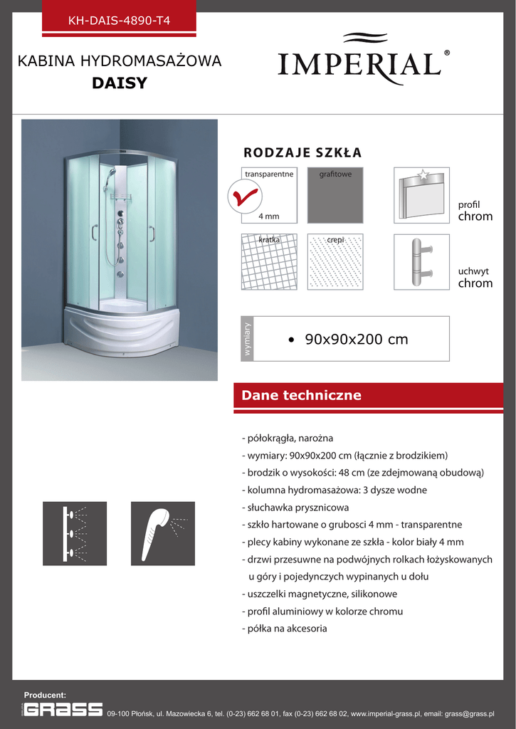 KH-DAIS-4890-T4 KABINA HYDROMASAŻOWA DAISY RO D Z A J E S Z K Ł A transparentne grafitowe profil chrom 4 mm kratka crepi uchwyt wymiary chrom • 90x90x200 cm Dane techniczne - półokrągła, narożna - wymiary: 90x90x200 cm (łącznie z brodzikiem) - brodzik o wysokości: 48 cm (ze zdejmowaną obudową) - kolumna hydromasażowa: 3 dysze wodne - słuchawka prysznicowa - szkło hartowane o grubosci 4 mm - transparentne - plecy kabiny wykonane ze szkła - kolor biały 4 mm - drzwi przesuwne na podwójnych rolkach łożyskowanych u góry i pojedynczych wypinanych u dołu - uszczelki magnetyczne, silikonowe - profil aluminiowy w kolorze chromu - półka na akcesoria Producent: 09-100 Płońsk, ul. Mazowiecka 6, tel. (0-23) 662 68 01, fax (0-23) 662 68 02, www.imperial-grass.pl, email: [email protected]