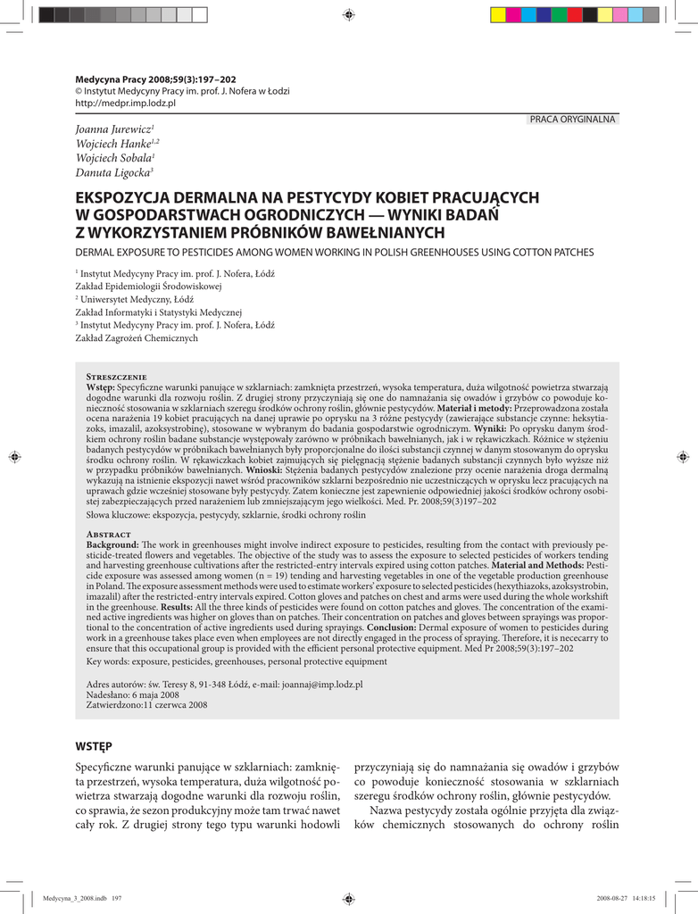 Medycyna Pracy 2008;59(3):197 – 202 © Instytut Medycyny Pracy im. prof. J. Nofera w Łodzi http://medpr.imp.lodz.pl PRACA ORYGINALNA Joanna Jurewicz1 Wojciech Hanke1,2 Wojciech Sobala1 Danuta Ligocka3 EKSPOZYCJA DERMALNA NA PESTYCYDY KOBIET PRACUJĄCYCH W GOSPODARSTWACH OGRODNICZYCH — WYNIKI BADAŃ Z WYKORZYSTANIEM PRÓBNIKÓW BAWEŁNIANYCH DERMAL EXPOSURE TO PESTICIDES AMONG WOMEN WORKING IN POLISH GREENHOUSES USING COTTON PATCHES 1 Instytut Medycyny Pracy im. prof. J. Nofera, Łódź Zakład Epidemiologii Środowiskowej 2 Uniwersytet Medyczny, Łódź Zakład Informatyki i Statystyki Medycznej 3 Instytut Medycyny Pracy im. prof. J. Nofera, Łódź Zakład Zagrożeń Chemicznych Streszczenie Wstęp: Specyficzne warunki panujące w szklarniach: zamknięta przestrzeń, wysoka temperatura, duża wilgotność powietrza stwarzają dogodne warunki dla rozwoju roślin. Z drugiej strony przyczyniają się one do namnażania się owadów i grzybów co powoduje konieczność stosowania w szklarniach szeregu środków ochrony roślin, głównie pestycydów. Materiał i metody: Przeprowadzona została ocena narażenia 19 kobiet pracujących na danej uprawie po oprysku na 3 różne pestycydy (zawierające substancje czynne: heksytiazoks, imazalil, azoksystrobinę), stosowane w wybranym do badania gospodarstwie ogrodniczym. Wyniki: Po oprysku danym środkiem ochrony roślin badane substancje występowały zarówno w próbnikach bawełnianych, jak i w rękawiczkach. Różnice w stężeniu badanych pestycydów w próbnikach bawełnianych były proporcjonalne do ilości substancji czynnej w danym stosowanym do oprysku środku ochrony roślin. W rękawiczkach kobiet zajmujących się pielęgnacją stężenie badanych substancji czynnych było wyższe niż w przypadku próbników bawełnianych. Wnioski: Stężenia badanych pestycydów znalezione przy ocenie narażenia droga dermalną wykazują na istnienie ekspozycji nawet wśród pracowników szklarni bezpośrednio nie uczestniczących w oprysku lecz pracujących na uprawach gdzie wcześniej stosowane były pestycydy. Zatem konieczne jest zapewnienie odpowiedniej jakości środków ochrony osobistej zabezpieczających przed narażeniem lub zmniejszającym jego wielkości. Med. Pr. 2008;59(3)197–202 Słowa kluczowe: ekspozycja, pestycydy, szklarnie, środki ochrony roślin Abstract Background: The work in greenhouses might involve indirect exposure to pesticides, resulting from the contact with previously pesticide-treated flowers and vegetables. The objective of the study was to assess the exposure to selected pesticides of workers tending and harvesting greenhouse cultivations after the restricted-entry intervals expired using cotton patches. Material and Methods: Pesticide exposure was assessed among women (n = 19) tending and harvesting vegetables in one of the vegetable production greenhouse in Poland. The exposure assessment methods were used to estimate workers’ exposure to selected pesticides (hexythiazoks, azoksystrobin, imazalil) after the restricted-entry intervals expired. Cotton gloves and patches on chest and arms were used during the whole workshift in the greenhouse. Results: All the three kinds of pesticides were found on cotton patches and gloves. The concentration of the examined active ingredients was higher on gloves than on patches. Their concentration on patches and gloves between sprayings was proportional to the concentration of active ingredients used during sprayings. Conclusion: Dermal exposure of women to pesticides during work in a greenhouse takes place even when employees are not directly engaged in the process of spraying. Therefore, it is nececarry to ensure that this occupational group is provided with the efficient personal protective equipment. Med Pr 2008;59(3):197–202 Key words: exposure, pesticides, greenhouses, personal protective equipment Adres autorów: św. Teresy 8, 91-348 Łódź, e-mail: [email protected] Nadesłano: 6 maja 2008 Zatwierdzono:11 czerwca 2008 WSTĘP Specyficzne warunki panujące w szklarniach: zamknięta przestrzeń, wysoka temperatura, duża wilgotność powietrza stwarzają dogodne warunki dla rozwoju roślin, co sprawia, że sezon produkcyjny może tam trwać nawet cały rok. Z drugiej strony tego typu warunki hodowli Medycyna_3_2008.indb 197 przyczyniają się do namnażania się owadów i grzybów co powoduje konieczność stosowania w szklarniach szeregu środków ochrony roślin, głównie pestycydów. Nazwa pestycydy została ogólnie przyjęta dla związków chemicznych stosowanych do ochrony roślin 2008-08-27 14:18:15 198 J. Jurewicz i wsp. (w języku greckim ‘pest’ — szkodnik, ‘cedeo’ — niszczyć). Chemizacja w uprawie roślin, w tym również w warunkach szklarniowych, jest jednym z ważniejszych czynników sprzyjających wzrostowi produkcji, jednak nieumiejętne jej stosowanie może stwarzać poważne zagrożenie dla człowieka. W dużych dawkach mogą wywoływać ostre zatrucia, ale niebezpieczne jest także działanie małych dawek, które w wyniku długotrwałego kontaktu mogą powodować odległe skutki zdrowotne, w tym zaburzenia reprodukcji (1). Względnie największe zużycie pestycydów w przeliczeniu na powierzchnię uprawną, a w związku z tym i najwyższy poziom potencjalnej ekspozycji, występuje w szklarniach zajmujących się produkcją kwiatów. Względnie niskie zużycie pestycydów ma miejsce w obiektach szklarniowych, w których uprawiane są warzywa — aktualnie chronione głównie metodami biologicznymi (2). Na świecie wiele publikacji poświęconych jest ocenie ekspozycji na pestycydy wśród pracowników szklarni (3–6). Większość z nich odnosi się do pomiaru ekspozycji drogą dermalną, która w przypadku narażenia zawodowego na pestycydy jest najbardziej istotnym szlakiem ekspozycji (7). Na działanie pestycydów w szklarni najbardziej narażeni są pracownicy ochrony roślin przeprowadzający opryski. W szklarniach jest to 