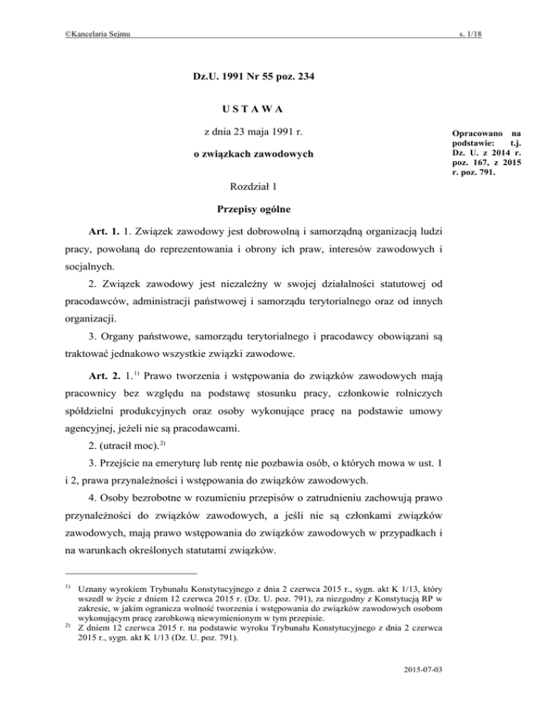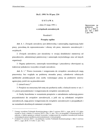 ©Kancelaria Sejmu s. 1/18 Dz.U. 1991 Nr 55 poz. 234 USTAWA z dnia 23 maja 1991 r. Opracowano na podstawie: t.j. Dz. U. z 2014 r. poz. 167, z 2015 r. poz. 791. o związkach zawodowych Rozdział 1 Przepisy ogólne Art. 1. 1. Związek zawodowy jest dobrowolną i samorządną organizacją ludzi pracy, powołaną do reprezentowania i obrony ich praw, interesów zawodowych i socjalnych. 2. Związek zawodowy jest niezależny w swojej działalności statutowej od pracodawców, administracji państwowej i samorządu terytorialnego oraz od innych organizacji. 3. Organy państwowe, samorządu terytorialnego i pracodawcy obowiązani są traktować jednakowo wszystkie związki zawodowe. Art. 2. 1. 1) Prawo tworzenia i wstępowania do związków zawodowych mają pracownicy bez względu na podstawę stosunku pracy, członkowie rolniczych spółdzielni produkcyjnych oraz osoby wykonujące pracę na podstawie umowy agencyjnej, jeżeli nie są pracodawcami. 2. (utracił moc). 2) 3. Przejście na emeryturę lub rentę nie pozbawia osób, o których mowa w ust. 1 i 2, prawa przynależności i wstępowania do związków zawodowych. 4. Osoby bezrobotne w rozumieniu przepisów o zatrudnieniu zachowują prawo przynależności do związków zawodowych, a jeśli nie są członkami związków zawodowych, mają prawo wstępowania do związków zawodowych w przypadkach i na warunkach określonych statutami związków. 1) 2) Uznany wyrokiem Trybunału Konstytucyjnego z dnia 2 czerwca 2015 r., sygn. akt K 1/13, który wszedł w życie z dniem 12 czerwca 2015 r. (Dz. U. poz. 791), za niezgodny z Konstytucją RP w zakresie, w jakim ogranicza wolność tworzenia i wstępowania do związków zawodowych osobom wykonującym pracę zarobkową niewymienionym w tym przepisie. Z dniem 12 czerwca 2015 r. na podstawie wyroku Trybunału Konstytucyjnego z dnia 2 czerwca 2015 r., sygn. akt K 1/13 (Dz. U. poz. 791). 2015-07-03 ©Kancelaria Sejmu s. 2/18 5. Prawo tworzenia i wstępowania do związków zawodowych w zakładach pracy przysługuje również osobom skierowanym do tych zakładów w celu odbycia służby zastępczej. 6. Do praw związkowych funkcjonariuszy Policji, Straży Granicznej i Służby Więziennej oraz strażaków Państwowej Straży Pożarnej, a także pracowników Najwyższej Izby Kontroli stosuje się odpowiednio przepisy niniejszej ustawy, z uwzględnieniem ograniczeń wynikających z odrębnych ustaw. 7. Przepisy ustawy dotyczące pracowników stosuje się odpowiednio również do innych osób, o których mowa w ust. 1–6. Art. 3. Nikt nie może ponosić ujemnych następstw z powodu przynależności do związku zawodowego lub pozostawania poza nim albo wykonywania funkcji związkowej. W szczególności nie może to być warunkiem nawiązania stosunku pracy i pozostawania w zatrudnieniu oraz awansowania pracownika. Art. 4. Związki zawodowe reprezentują pracowników i inne osoby, o których mowa w art. 2, a także bronią ich godności, praw oraz interesów materialnych i moralnych, zarówno zbiorowych, jak i indywidualnych. Art. 5. Związki zawodowe mają prawo reprezentowania interesów pracowniczych na forum międzynarodowym. Art. 6. Związki zawodowe współuczestniczą w tworzeniu korzystnych warunków pracy, bytu i wypoczynku. Art. 7. 1. W zakresie praw i interesów zbiorowych związki zawodowe reprezentują wszystkich pracowników, niezależnie od ich przynależności związkowej. 2. W sprawach indywidualnych stosunków pracy związki zawodowe reprezentują prawa i interesy swoich członków. Na wniosek pracownika niezrzeszonego związek zawodowy może podjąć się obrony jego praw i interesów wobec pracodawcy. Art. 8. Na zasadach przewidzianych w niniejszej ustawie oraz w ustawach odrębnych związki zawodowe kontrolują przestrzeganie przepisów dotyczących interesów pracowników, emerytów, rencistów, bezrobotnych i ich rodzin. 2015-07-03 ©Kancelaria Sejmu s. 3/18 Art. 9. Statuty oraz uchwały związkowe określają swobodnie struktury organizacyjne związków zawodowych. Zobowiązania majątkowe mogą podejmować wyłącznie statutowe organy struktur związkowych posiadających osobowość prawną. Art. 10. Zasady członkostwa w związku zawodowym oraz sprawowania funkcji związkowych ustalają statuty i uchwały statutowych organów związkowych. Art. 11. 1. Związki zawodowe mają prawo tworzyć ogólnokrajowe zrzeszenia (federacje) związków zawodowych. 2. Ogólnokrajowe związki zawodowe i zrzeszenia związków zawodowych mogą tworzyć ogólnokrajowe organizacje międzyzwiązkowe (konfederacje). 3. Organizacje związkowe, w tym federacje i konfederacje, mają prawo tworzenia i wstępowania do międzynarodowych organizacji pracowników. Rozdział 2 Tworzenie związków zawodowych Art. 12. 1. Związek zawodowy powstaje z mocy uchwały o jego utworzeniu, podjętej przez co najmniej 10 osób uprawnionych do tworzenia związków zawodowych. 2. Osoby, które podjęły uchwałę o utworzeniu związku zawodowego, uchwalają statut i wybierają komitet założycielski w liczbie od 3 do 7 osób. Art. 13. Statut związku zawodowego określa w szczególności: 1) nazwę związku; 2) siedzibę związku; 3) terytorialny i podmiotowy zakres działania; 4) cele i zadania związku oraz sposoby i formy ich realizacji; 5) zasady nabywania i utraty członkostwa; 6) prawa i obowiązki członków; 7) strukturę organizacyjną związku ze wskazaniem, które z jednostek organizacyjnych związku mają osobowość prawną; 8) sposób reprezentowania związku oraz osoby upoważnione do zaciągania zobowiązań majątkowych w imieniu związku; 2015-07-03 ©Kancelaria Sejmu 9) s. 4/18 organy związku, tryb ich wyboru i odwołania, zakres ich kompetencji oraz okres kadencji; 10) źródła finansowania działalności związku oraz sposób ustanawiania składek członkowskich; 11) zasady uchwalania i zmian statutu; 12) sposób rozwiązania związku i likwidacji jego majątku. Art. 14. 1. Związek zawodowy podlega obow