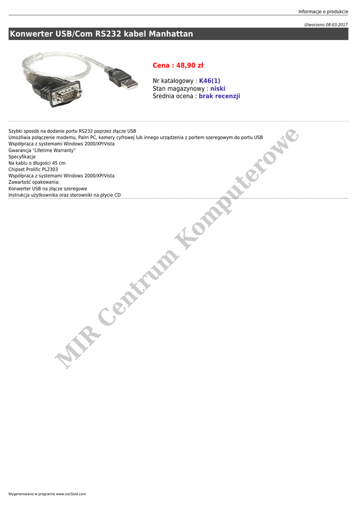 Informacje o produkcie Utworzono 08-03-2017 Konwerter USB/Com RS232 kabel Manhattan Cena : 48,90 zł M IR C en tr um K om pu te r ow Szybki sposób na dodanie portu RS232 poprzez złącze USB Umożliwia połączenie modemu, Palm PC, kamery cyfrowej lub innego urządzenia z portem szeregowym do portu USB Współpraca z systemami Windows 2000/XP/Vista Gwarancja "Lifetime Warranty" Specyfikacje Na kablu o długości 45 cm Chipset Prolific PL2303 Współpraca z systemami Windows 2000/XP/Vista Zawartość opakowania: Konwerter USB na złącze szeregowe Instrukcja użytkownika oraz sterowniki na płycie CD e Nr katalogowy : K46(1) Stan magazynowy : niski Średnia ocena : brak recenzji Wygenerowano w programie www.oscGold.com