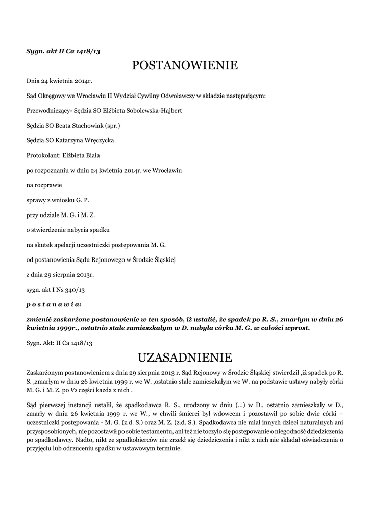 Sygn. akt II Ca 1418/13 POSTANOWIENIE Dnia 24 kwietnia 2014r. Sąd Okręgowy we Wrocławiu II Wydział Cywilny Odwoławczy w składzie następującym: Przewodniczący- Sędzia SO Elżbieta Sobolewska-Hajbert Sędzia SO Beata Stachowiak (spr.) Sędzia SO Katarzyna Wręczycka Protokolant: Elżbieta Biała po rozpoznaniu w dniu 24 kwietnia 2014r. we Wrocławiu na rozprawie sprawy z wniosku G. P. przy udziale M. G. i M. Z. o stwierdzenie nabycia spadku na skutek apelacji uczestniczki postępowania M. G. od postanowienia Sądu Rejonowego w Środzie Śląskiej z dnia 29 sierpnia 2013r. sygn. akt I Ns 340/13 p o s t a n a w i a: zmienić zaskarżone postanowienie w ten sposób, iż ustalić, że spadek po R. S., zmarłym w dniu 26 kwietnia 1999r., ostatnio stale zamieszkałym w D. nabyła córka M. G. w całości wprost. Sygn. Akt: II Ca 1418/13 UZASADNIENIE Zaskarżonym postanowieniem z dnia 29 sierpnia 2013 r. Sąd Rejonowy w Środzie Śląskiej stwierdził ,iż spadek po R. S. ,zmarłym w dniu 26 kwietnia 1999 r. we W. ,ostatnio stale zamieszkałym we W. na podstawie ustawy nabyły córki M. G. i M. Z. po ½ części każda z nich . Sąd pierwszej instancji ustalił, że spadkodawca R. S., urodzony w dniu (...) w D., ostatnio zamieszkały w D., zmarły w dniu 26 kwietnia 1999 r. we W., w chwili śmierci był wdowcem i pozostawił po sobie dwie córki – uczestniczki postępowania - M. G. (z.d. S.) oraz M. Z. (z.d. S.). Spadkodawca nie miał innych dzieci naturalnych ani przysposobionych, nie pozostawił po sobie testamentu, ani też nie toczyło się postępowanie o niegodność dziedziczenia po spadkodawcy. Nadto, nikt ze spadkobierców nie zrzekł się dziedziczenia i nikt z nich nie składał oświadczenia o przyjęciu lub odrzuceniu spadku w ustawowym terminie. Mając na uwadze powyższe ustalenia faktyczne, Sąd pierwszej instancji stwierdził ,iż do kręgu osób uprawnionych do dziedziczenia po zmarłym spadkodawcy, należą obie uczestniczki postępowania ,które dziedziczą na podstawie ustawy w częściach równych . W apelacji od postanowienia z dnia 29 sierpnia 2013 r. uczestniczka M. G. zaskarżyła orzeczenie w całości zarzucając: niewyjaśnienie wszystkich okoliczności faktycznych zmierzających do rozstrzygnięcia sprawy, sprzeczność poczynionych przez Sąd ustaleń z treścią zebranego w sprawie materiału poprzez przyjęcie, że spadek po spadkodawcy nabyły jego córki M. G. i M. Z., każda po ½ części w sytuacji ,gdy uczestniczka postępowania M. Z. nie jest córką spadkodawcy . Wskazując na powyższe zarzuty oraz na dowody zawarte w apelacji uczestniczka wniosła o zmianę zaskarżonego postanowienia i stwierdzenie, że spadek po zmarłym R. S. na podstawie ustawy nabyła córka M. G. w całości wprost, ewentualnie o uchylenie zaskarżonego postanowienia i przekazanie sprawy Sądowi Rejonowemu w Środzie Śląskiej do ponownego rozpoznania z rozstrzygnięciem o kosztach instancji odwoławczej oraz o zasądzenie kosztów postępowania według norm przepisanych . Sąd Okręgowy dodatkowo ustalił, iż: Biologicznym ojcem uczestniczki M. Z. jest J. N.. Nazwisko S. zostało nadane uczestniczce na podstawie zgodnego oświadczenia matki dziecka i spadkodawcy – R. S., złożonego przed kierownikiem USC w B. dnia 6 lipca 1978 r. Po śmierci matki uczestniczki M. Z., toczyło się postępowanie w sprawie umieszczenia małoletniej w rodzinie zastępczej, zakończone postanowieniem wydanym przez Sąd Rejonowy w Środzie Śląskiej III Wydział Rodzinny i Nieletnich dnia 1 grudnia 1980 r., sygn. akt: Nsm 392/80 na podstawie ,którego ustanowiono R. S. rodziną zastępczą dla uczestniczki . oraz upoważnił go do pobierania na rzecz małoletniej renty alimentacyjnej. W związku z powyższym orzeczeniem R. S. zawarł w dniu 1 stycznia 1981 r. umowę o powierzeniu dziecka rodzinie zastępczej. Dowód: - odpis zupełny aktu urodzenia sporządzonego w Urzędzie Stanu Cywilnego w B. nr (...), - odpis postanowienia Sądu Rejonowego w Środzie Śląskiej z dnia 1 grudnia 1980 r., sygn. akt Nsm 392/80, - umowa nr (...) z dnia 1 stycznia 1981 r. o powierzeniu dziecka rodzinie zastępczej. Sąd Okręgowy zważył, co następuje: Apelacja jest zasadna . Zgodnie z art. 931 §1 k.c. w pierwszej kolejności powołane są z ustawy do spadku dzieci spadkodawcy oraz jego małżonek . Uczestniczka postępowania trafnie zarzuciła ,iż Sąd pierwszej instancji poczynił błędne ustalenia faktyczne dotyczące kręgu spadkobierców ustawowych po R. S. ,a w następstwie tego uchybienia doszło do naruszenia art.931 k.c. Sąd Rejonowy kierując się głównie treścią zapewnień spadkowych obu uczestniczek postępowania ,a z naruszeniem art.233 k.p.c. i art. 4 ustawy z dnia 29 września 1986 r.- prawo o aktach stanu cywilnego ( Dz.U.z 2011 r.nr.212 poz. 1264 j.t.) ustalając krąg spadkobierców ustawowych pominął dane wynikające z odpisu aktu małżeństwa uczestniczki postępowania M. Z. .Tymczasem już z tego dokumentu wynika ,iż ojcem uczestniczki jest J. N. ,a nie R. S. . Podkreślić przy tym należy ,iż zgodnie z powołanym wyżej art.4 oraz art.40 ust.1 pkt 3 ustawy prawo o aktach stanu cywilnego podstawą ustaleń, co do istnienia pokrewieństwa między uczestniczkami postępowania i spadkodawcą powinny być odpisy aktów urodzenia ,a nie małżeństwa . Z uzupełniającego postępowania dowodowego przeprowadzonego przez Sąd drugiej instancji na podstawie dokumentów dołączonych do apelacji oraz odpisu zupełnego aktu urodzenia sporządzonego w Urzędzie Stanu Cywilnego w B. nr (...), wynika ,iż spadkodawca nie był ojcem biologicznym M. Z. . Uczestniczka postępowania nie została też przez R. S. przysposobiona ,a jedynie nosiła jego nazwisko nadane zgodnie z art.90 §1 k.r.i o. Tym samym nie zachodzą przesłanki uprawniające uczestniczkę M. Z. do dziedziczenia po zmarłym R. S. ,a jedyną osobą powołaną do dziedziczenia ustawowego po spadkodawcy jest córka M